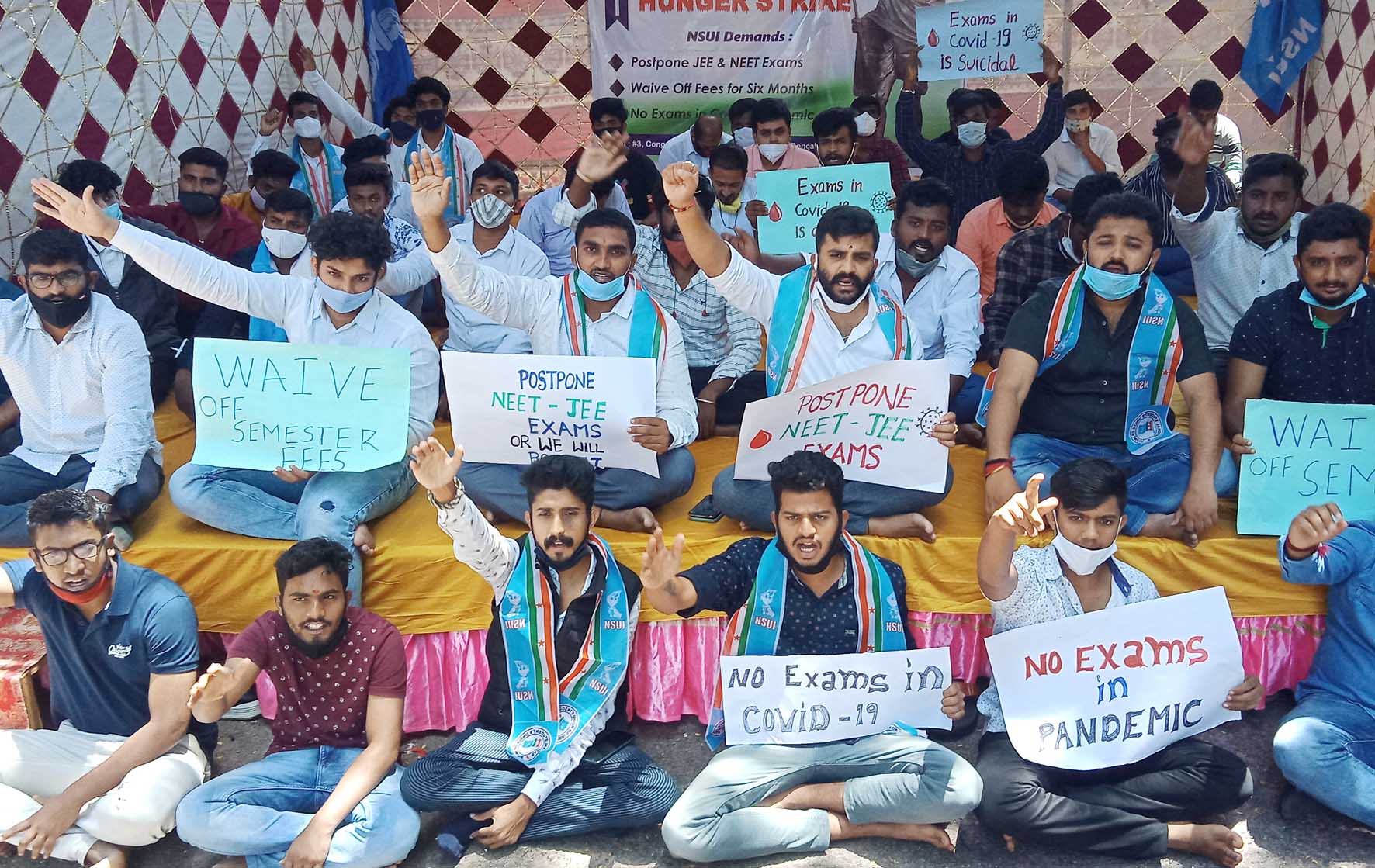 ನಗರದ ರೇಸ್ ಕೋರ್ಸ್ ರಸ್ತೆಯ ಕಾಂಗ್ರೆಸ್ ಭವನದಲ್ಲಿ ಎನ್ಎಸ್ಯುಐ ಅಧ್ಯಕ್ಷ ಮಂಜುನಾಥ್ ನೇತೃತ್ವದಲ್ಲಿ ಪ್ರತಿಭಟನೆ ನಡೆಸಿದ ಸದಸ್ಯರು, ಕೇಂದ್ರ ಸರಕಾರವು ನೀಟ್ ಮತ್ತು ಜೆಇಇ ಪರೀಕ್ಷೆಗಳನ್ನು ಮುಂದೂಡಿಕೆ ಮಾಡಬೇಕು ಎಂದು ಆಗ್ರಹಿಸಿದರು.