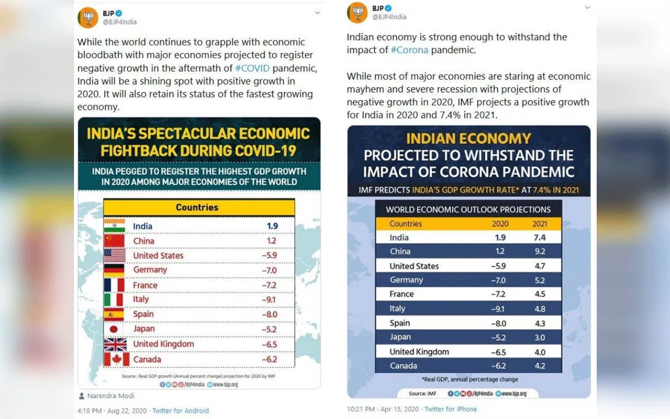 ಬಿಜೆಪಿ ಇತ್ತೀಚೆಗೆ ಮಾಡಿರುವ ಟ್ವೀಟ್ನಲ್ಲಿ ಇರುವಂತಹದೇ ಒಂದು ಮಾಹಿತಿಯಿರುವ ಟ್ವೀಟ್ ಅನ್ನು ಎಪ್ರಿಲ್ ತಿಂಗಳಲ್ಲಿ ಮಾಡಿತ್ತು ಹಾಗೂ ಐಎಂಎಫ್ 2020 ಹಾಗೂ 2021ಗೆ ಅಂದಾಜಿಸಿದ್ದ ಜಿಡಿಪಿ ಪ್ರಮಾಣವನ್ನು ಹೋಲಿಕೆ ಮಾಡಿತ್ತು. ಆಗ ತನ್ನ ಟ್ವೀಟ್ ನಲ್ಲಿ ಬಿಜೆಪಿ ಹೀಗೆ ಹೇಳಿತ್ತು. "ಕೊರೋನ ಸಾಂಕ್ರಾಮಿಕದ ಪರಿಣಾಮವನ್ನು ಎದುರಿಸುವಷ್ಟು ಭಾರತದ ಆರ್ಥಿಕತೆ ಸುದೃಢವಾಗಿದೆ. ಹೆಚ್ಚಿನ ಪ್ರಮುಖ ಆರ್ಥಿಕತೆಗಳು ತೀವ್ರ ಆರ್ಥಿಕ ಕುಸಿತವನ್ನು ಎದುರು ನೋಡುತ್ತಿದ್ದರೆ ಹಾಗೂ 2020ರಲ್ಲಿ ಅಭಿವೃದ್ಧಿ ಹಿನ್ನಡೆಯಾಗಲಿದ್ದರೆ, ಐಎಂಎಫ್ ಭಾರತಕ್ಕೆ 2020ರಲ್ಲಿ ಸಕಾರಾತ್ಮಕ ಅಭಿವೃದ್ಧಿ ಪ್ರಮಾಣ ಹಾಗೂ 2021ರಲ್ಲಿ ಶೇ 7.4 ಪ್ರಗತಿ ಪ್ರಮಾಣ ಅಂದಾಜಿಸಿದೆ,'' ಎಂದು ಟ್ವೀಟ್ನಲ್ಲಿ ಬರೆಯಲಾಗಿತ್ತು.