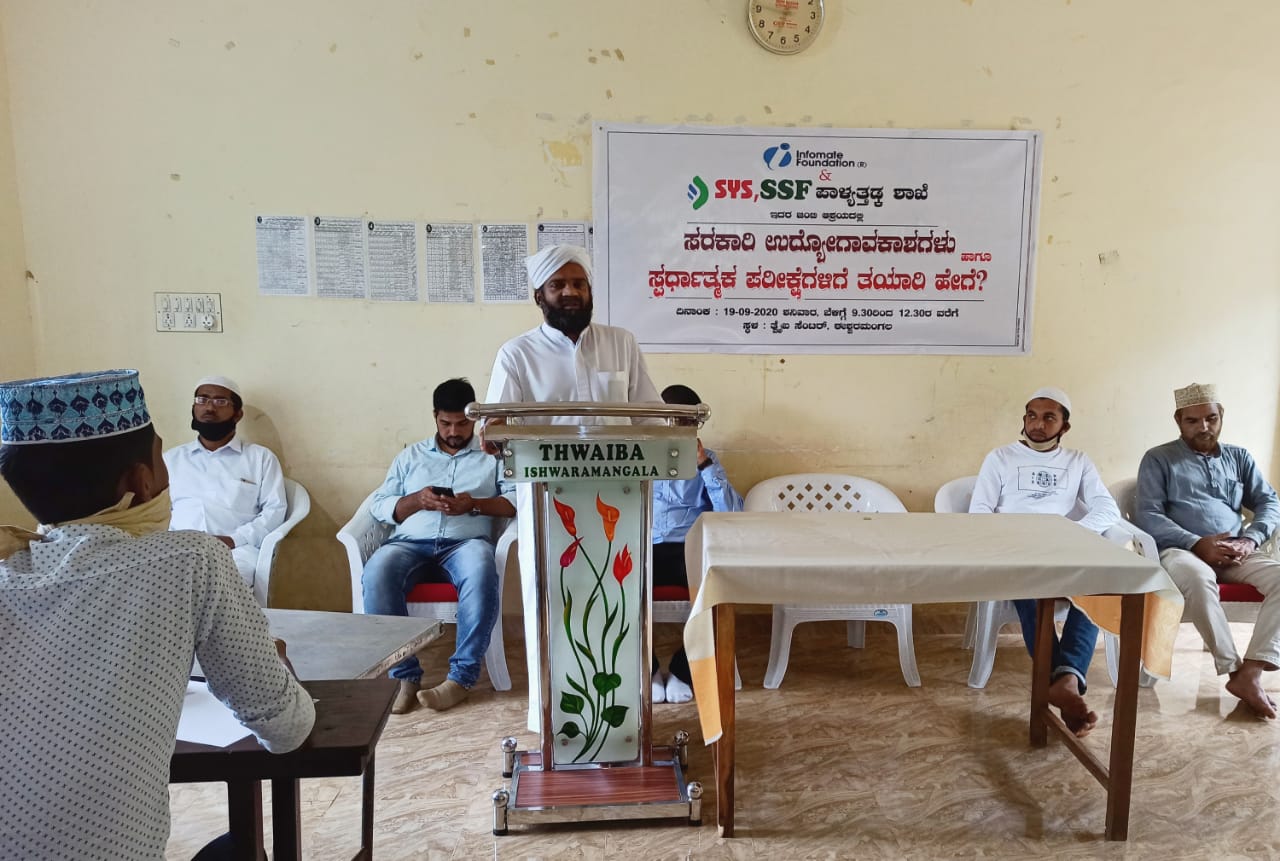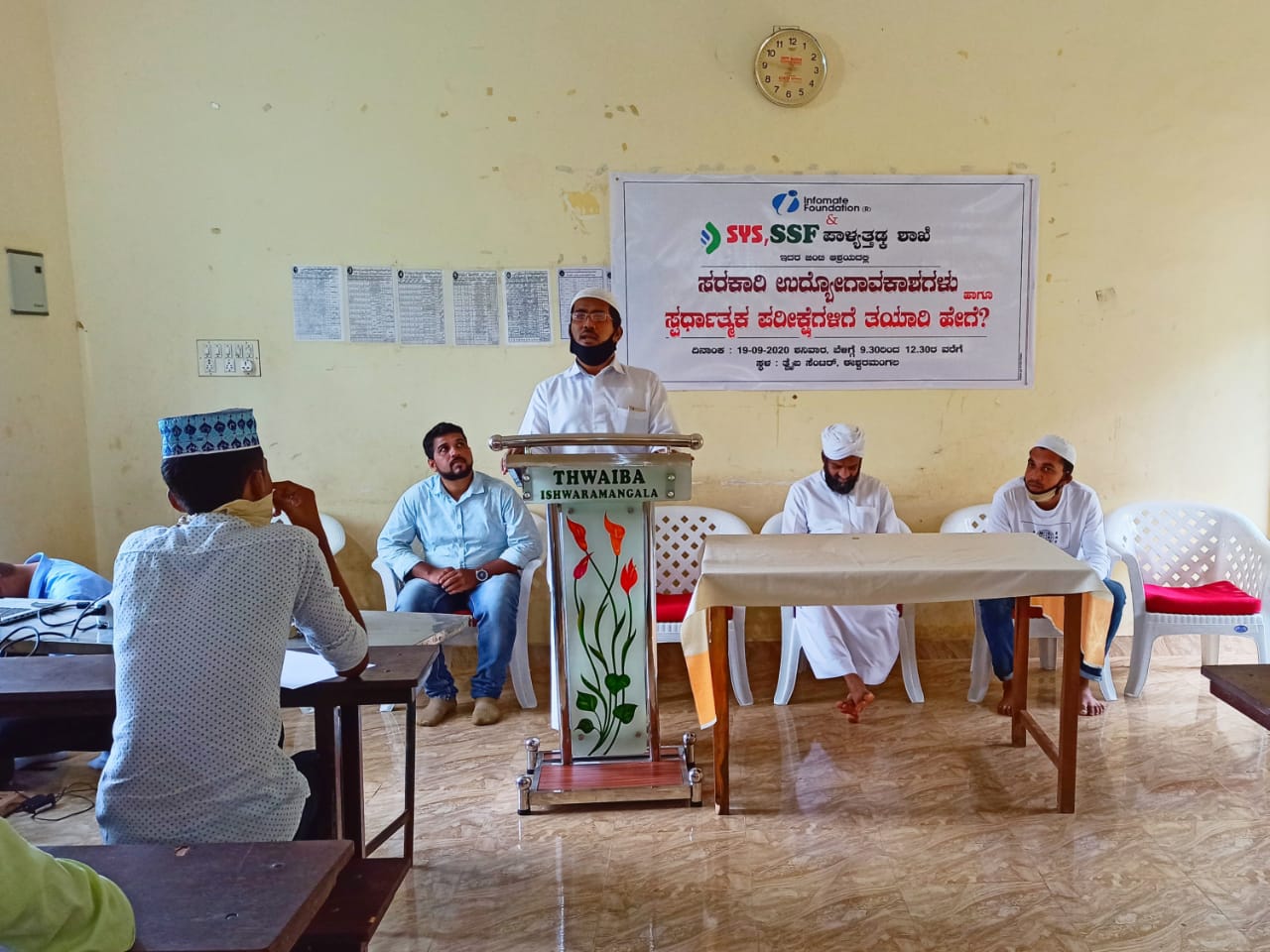 ಮಂಗಳೂರು : ಇನ್ಫೋಮೇಟ್ ಫೌಂಡೇಶನ್ ಹಾಗೂ ಎಸ್ಎಸ್ಎಫ್, ಎಸ್ವೈಸ್ ಪಾಲ್ಯತ್ತಡ್ಕ ವತಿಯಿಂದ ಸರಕಾರಿ ಉದ್ಯೋಗಾವಕಾಶಗಳು ಮತ್ತು ಸ್ಪರ್ಧಾತ್ಮಕ ಪರೀಕ್ಷೆಗಳಿಗೆ ತಯಾರಿ ಹೇಗೆ ಎಂಬ ವಿಷಯದಲ್ಲಿ ಮಾಹಿತಿ ಶಿಬಿರವು ಈಶ್ವರಮಂಗಲ ತ್ವೈಬ ಸೆಂಟರ್ನಲ್ಲಿ ಇತ್ತೀಚೆಗೆ ನಡೆಯಿತು.