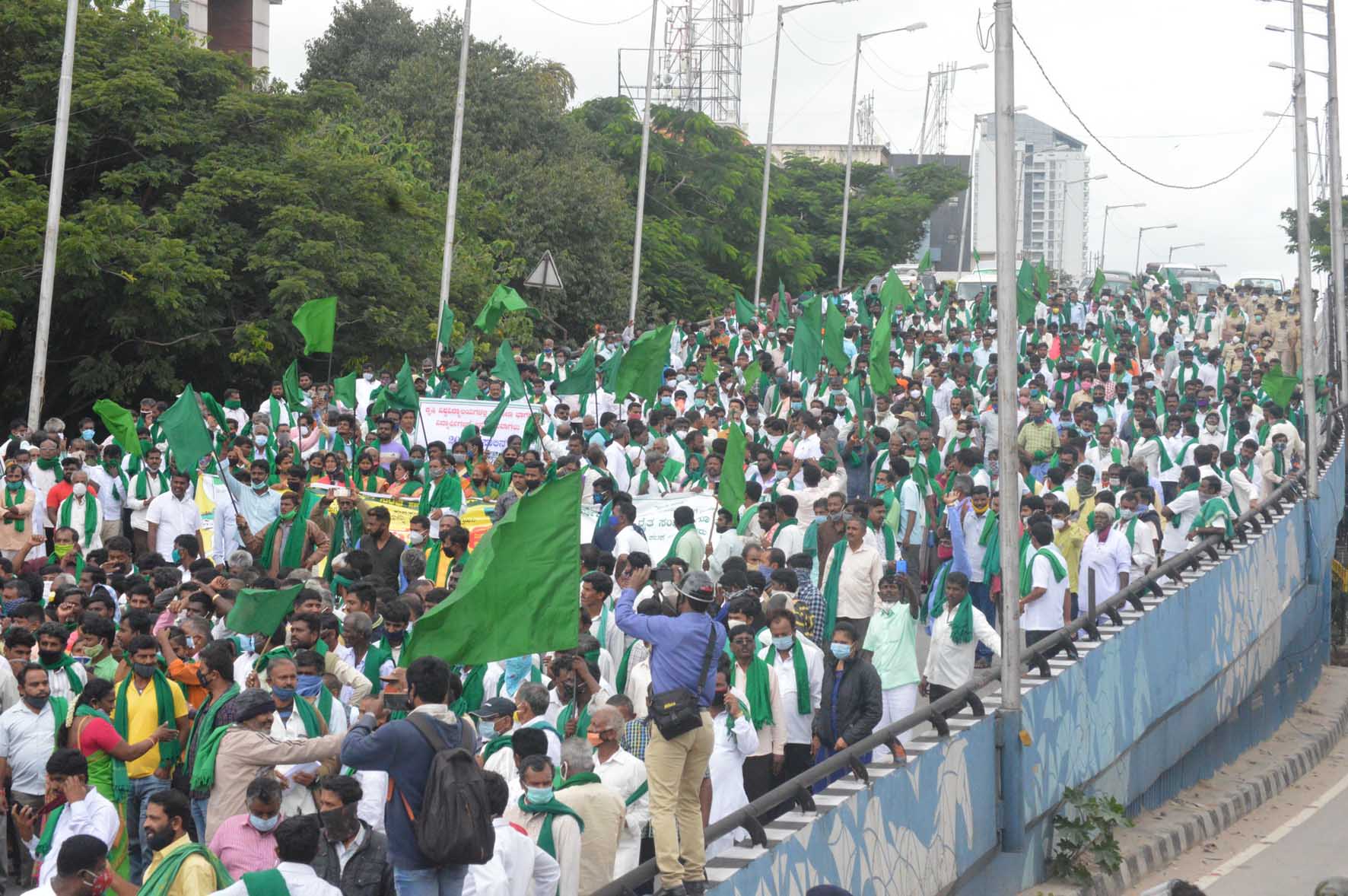 ಮೌರ್ಯ ವೃತ್ತದ ಗಾಂಧಿ ಪ್ರತಿಮೆ ಬಳಿ ಹಮ್ಮಿಕೊಂಡಿರುವ ರೈತರ ಹೋರಾಟದ ನೇತೃತ್ವ ವಹಿಸಿರುವ ಕೋಡಿಹಳ್ಳಿ ಚಂದ್ರಶೇಖರ್ ಭೂ ಸುಧಾರಣಾ ತಿದ್ದುಪಡಿ ವಿಧೇಯಕ ವಿರೋಧಿಸಿ ಸೆ.26 ವರೆಗೆ ಅಹೋರಾತ್ರಿ ಧರಣಿ ನಡೆಸುವುದಾಗಿ ಹೇಳಿದರು. ಕೇಂದ್ರ ಮತ್ತು ರಾಜ್ಯ ಸರಕಾರ ರೈತ ವಿರೋಧಿ ಧೋರಣೆಯಲ್ಲಿ ನಿರತವಾಗಿದ್ದು ಭೂಸುಧಾರಣ ಕಾಯ್ದೆ ಹಿಂಪಡೆಯುವ ವರೆಗೂ ಹೋರಾಟ ನಡೆಸುವುದಾಗಿ ಎಚ್ಚರಿಸಿದರು.