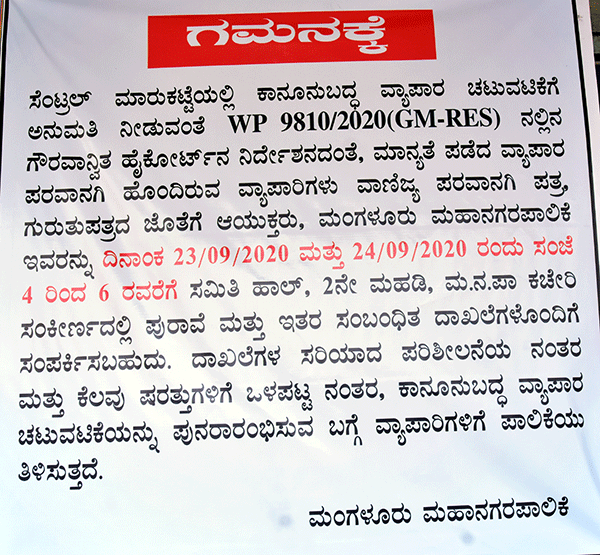 ಕೆಲದಿನಗಳ ಹಿಂದೆ ಸೆಂಟ್ರಲ್ ಮಾರುಕಟ್ಟೆಯಲ್ಲಿ ಕಾನೂನುಬದ್ಧ ವ್ಯಾಪಾರ ಚಟುವಟಿಕೆಗೆ ಅನುಮತಿ ನೀಡುವಂತೆ ಹೈಕೋರ್ಟ್ ನಿರ್ದೇಶಿಸಿದ ಮೇರೆಗೆ ಮಾನ್ಯತೆ ಪಡೆದ ವ್ಯಾಪಾರ ಪರವಾನಿಗೆ ಹೊಂದಿರುವ ವ್ಯಾಪಾರಿಗಳು ವಾಣಿಜ್ಯ ಪರವಾನಿಗೆ ಪತ್ರ, ಗುರುತುಪತ್ರ ಸಹಿತ ಎಲ್ಲಾ ಪುರಾವೆ/ದಾಖಲೆಯೊಂದಿಗೆ ಜೊತೆಗೆ ಮನಪಾ ಆಯುಕ್ತರನ್ನು ಸಂಪರ್ಕಿಸಲು ತಿಳಿಸಿತ್ತು. ಅದರಂತೆ ಹಲವು ವ್ಯಾಪಾರಿಗಳು ದಾಖಲೆ ಸಲ್ಲಿಸಿದ್ದಾರೆ.