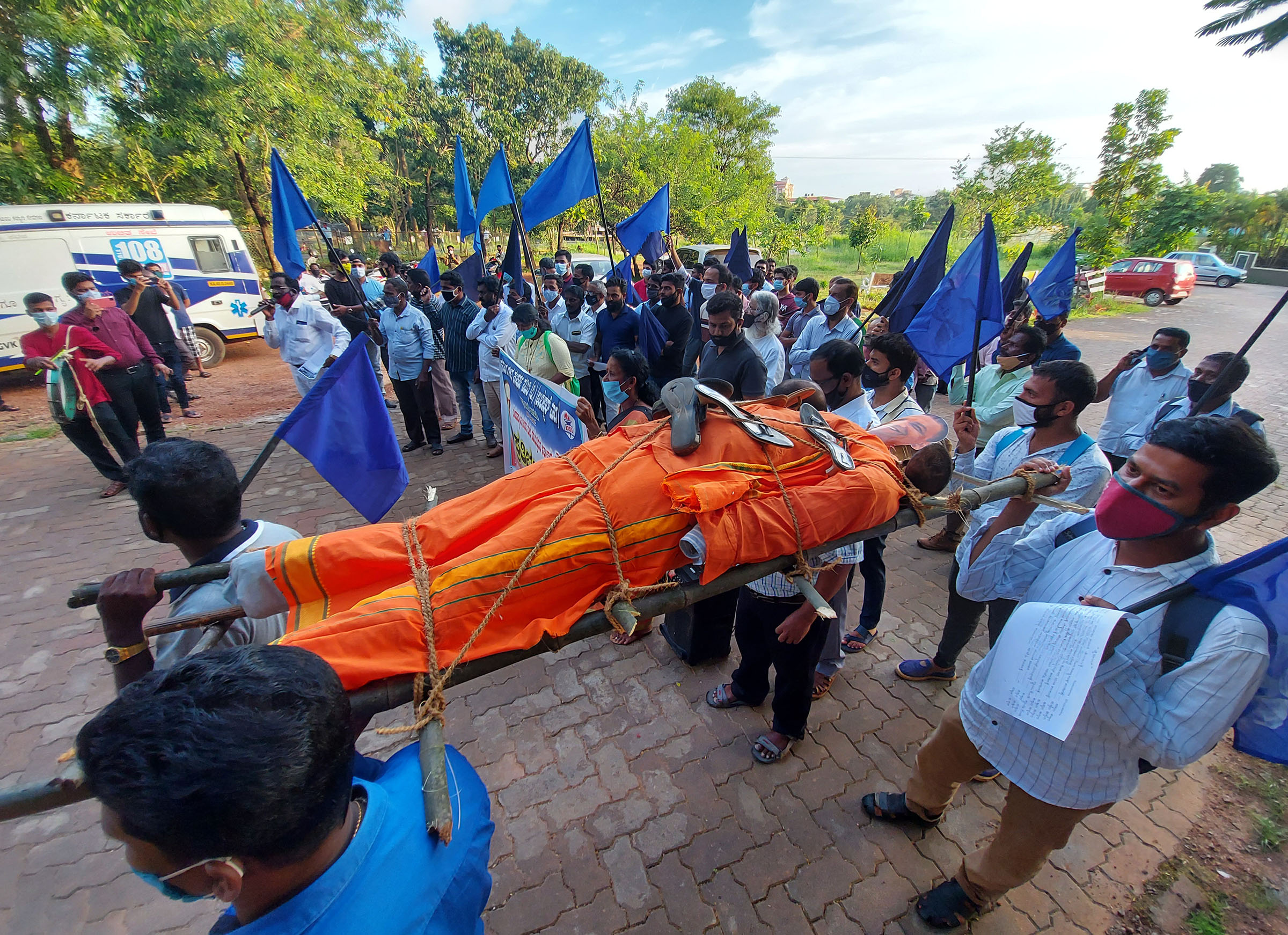 ಉಡುಪಿ, ಅ.1: ಉತ್ತರ ಪ್ರದೇಶದ ಹತ್ರಾಸ್ ದಲಿತ ಯುವತಿಯ ಅತ್ಯಾಚಾರ ಮತ್ತು ಕೊಲೆ ಪ್ರಕರಣದ ಆರೋಪಿಗಳನ್ನು ಗಲ್ಲಿಗೇರಿಸುವಂತೆ ಹಾಗೂ ಮುಖ್ಯಮಂತ್ರಿ ಯೋಗಿ ಆದಿತ್ಯನಾಥ್ ಕೂಡಲೇ ರಾಜೀನಾಮೆ ನೀಡುವಂತೆ ಆಗ್ರಹಿಸಿ ಕರ್ನಾಟಕ ದಲಿತ ಸಂಘರ್ಷ ಸಮಿತಿ (ಅಂಬೇಡ್ಕರ್ ವಾದ) ನೇತೃತ್ವದಲ್ಲಿ ಯೋಗಿ ಆದಿತ್ಯನಾಥ್ ಪ್ರತಿಕೃತಿಯ ಅಣಕು ಶವಯಾತ್ರೆ ನಡೆಸಿ ಪ್ರತಿಭಟಿಸಲಾಯಿತು.