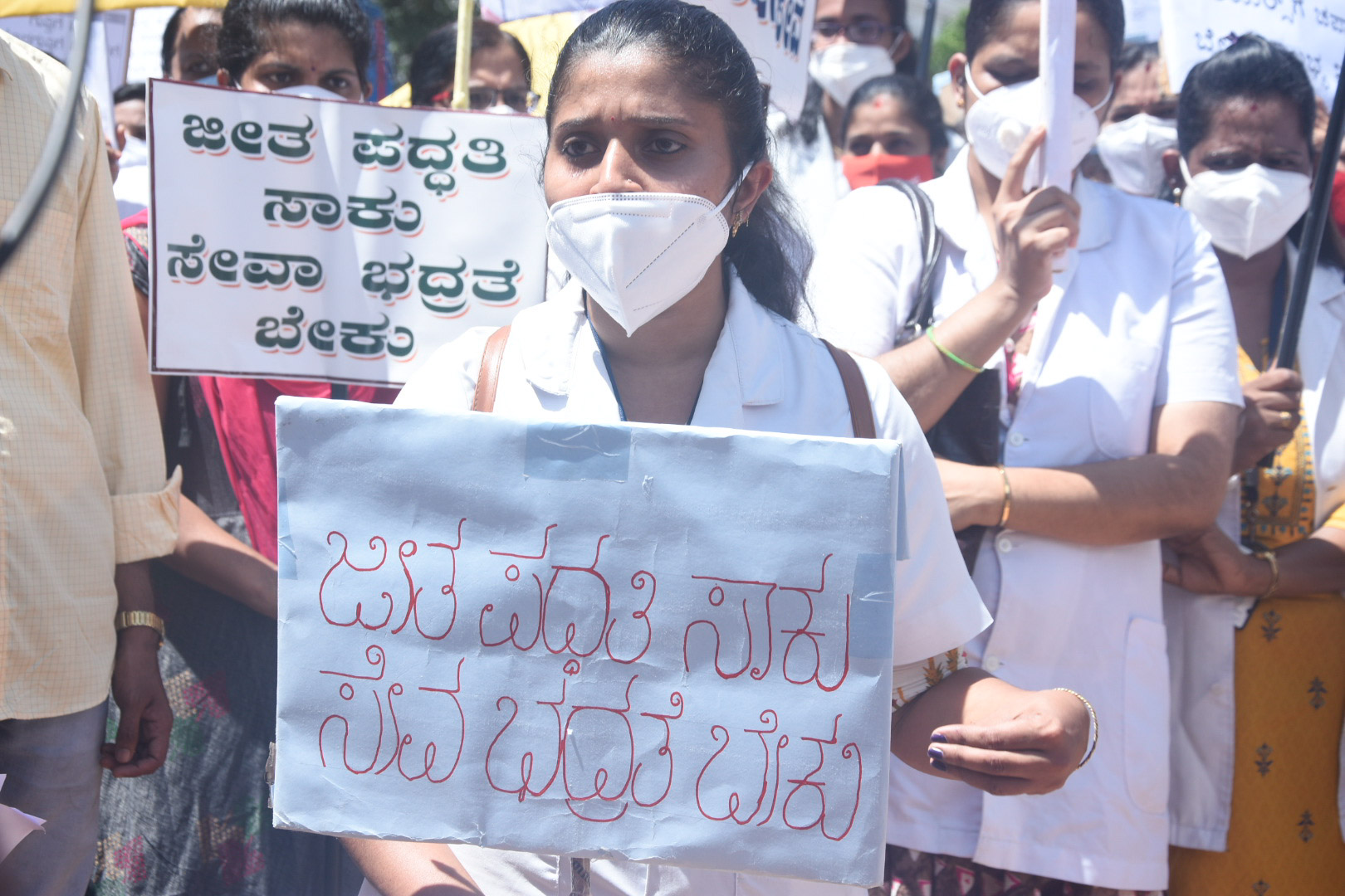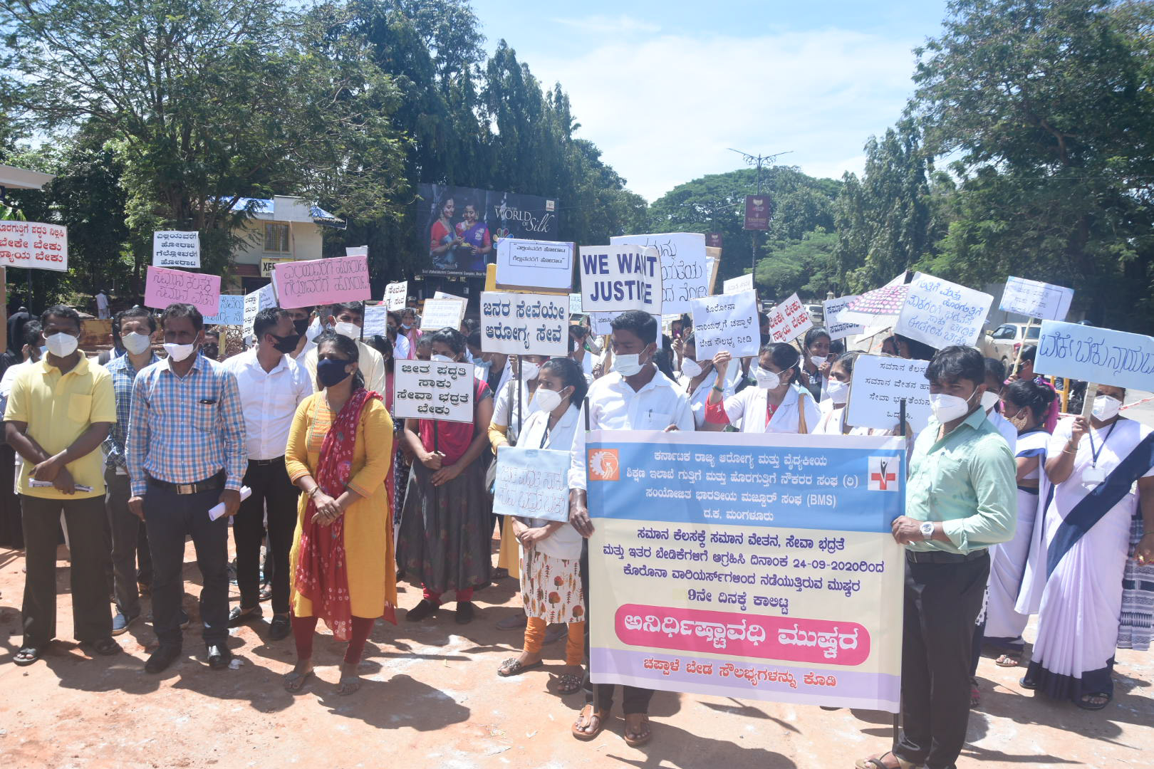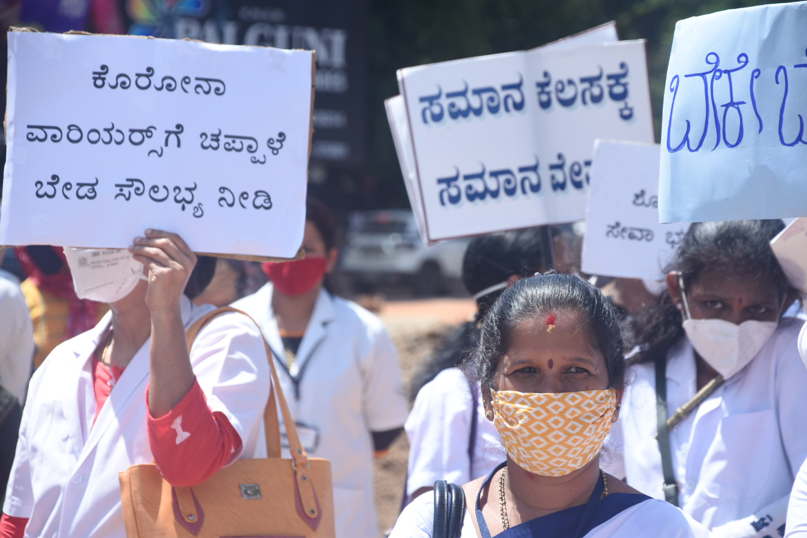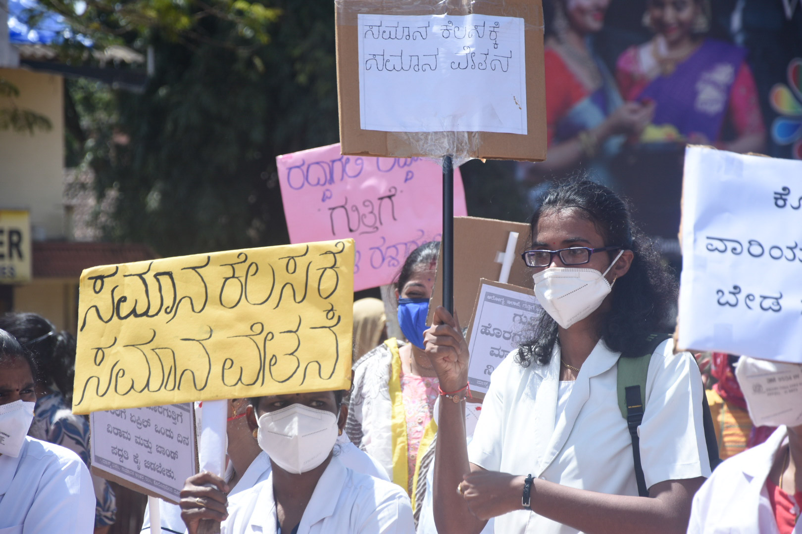 ಸಮಾನ ಕೆಲಸಕ್ಕೆ ಸಮಾನ ವೇತನ ಹಾಗೂ ಸೇವಾ ಭದ್ರತೆಗೆ ಒತ್ತಾಯಿಸಿ ಸೆ. 24ರಿಂದ ಕೆಲಸ ಬಹಿಷ್ಕರಿಸಿ ಅನಿರ್ದಿಷ್ಟಾವಧಿ ಮುಷ್ಕರ ನಡೆಸುತ್ತಿರುವ ಗುತ್ತಿಗೆ ಆಧಾರಿತ ಆರೋಗ್ಯ ಕಾರ್ಯಕರ್ತ ಸಿಬ್ಬಂದಿ ಇಂದು ಬೀದಿಗಿಳಿದು ಪ್ರತಿಭಟಿಸಿದರು.