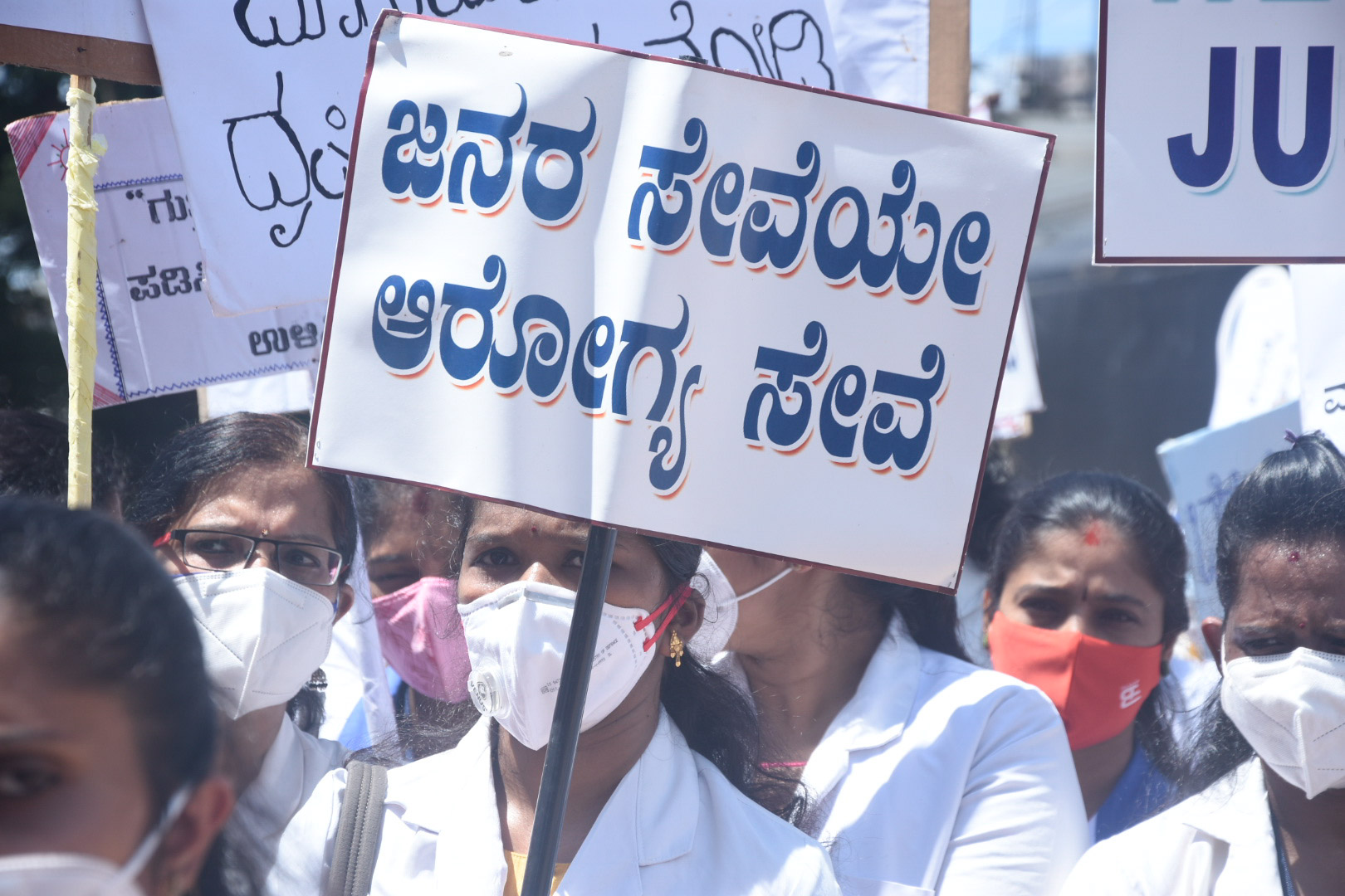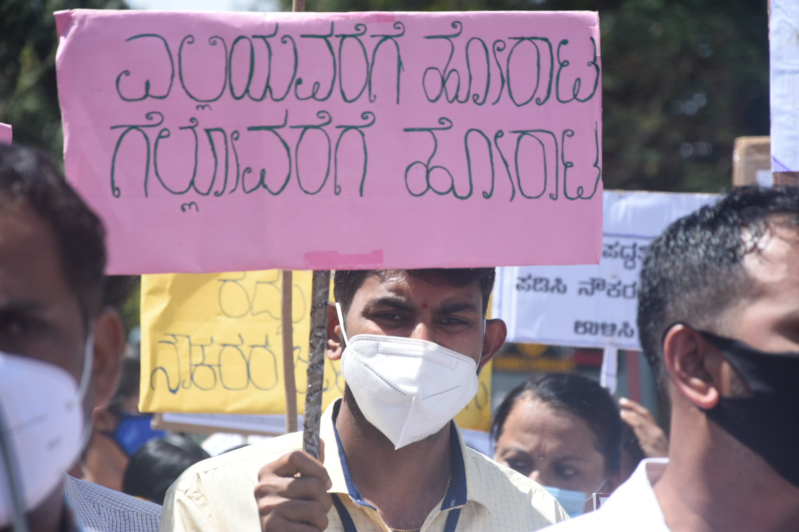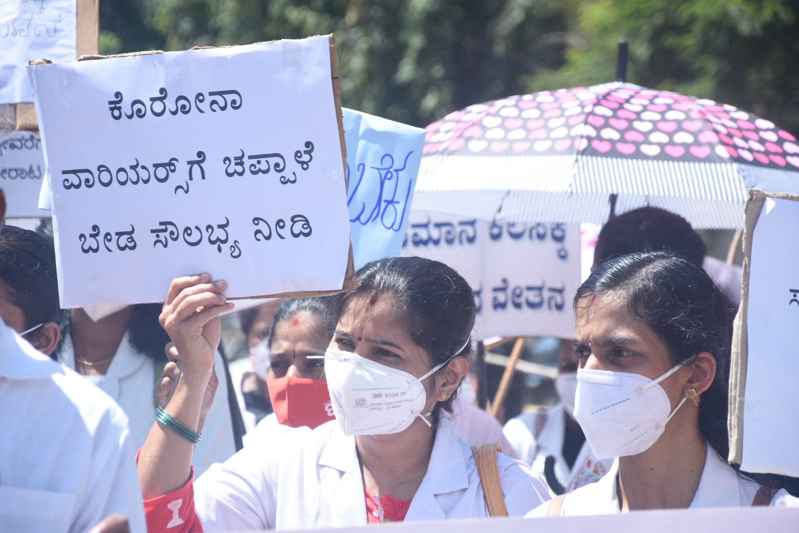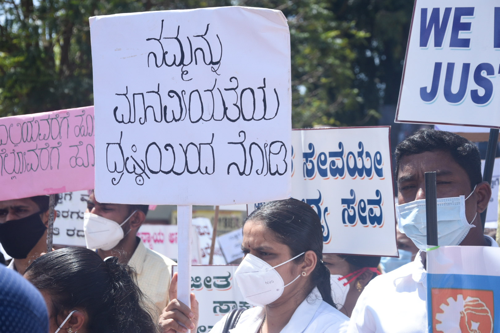 ಸಮಾನ ಕೆಲಸಕ್ಕೆ ಸಮಾನ ವೇತನ ಹಾಗೂ ಸೇವಾ ಭದ್ರತೆಗೆ ಒತ್ತಾಯಿಸಿ ಸೆ. 24ರಿಂದ ಕೆಲಸ ಬಹಿಷ್ಕರಿಸಿ ಅನಿರ್ದಿಷ್ಟಾವಧಿ ಮುಷ್ಕರ ನಡೆಸುತ್ತಿರುವ ಗುತ್ತಿಗೆ ಆಧಾರಿತ ಆರೋಗ್ಯ ಕಾರ್ಯಕರ್ತ ಸಿಬ್ಬಂದಿ ಇಂದು ಬೀದಿಗಿಳಿದು ಪ್ರತಿಭಟಿಸಿದರು.