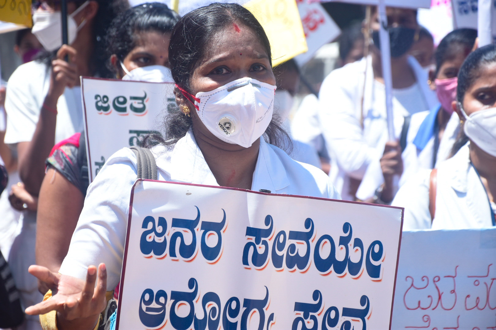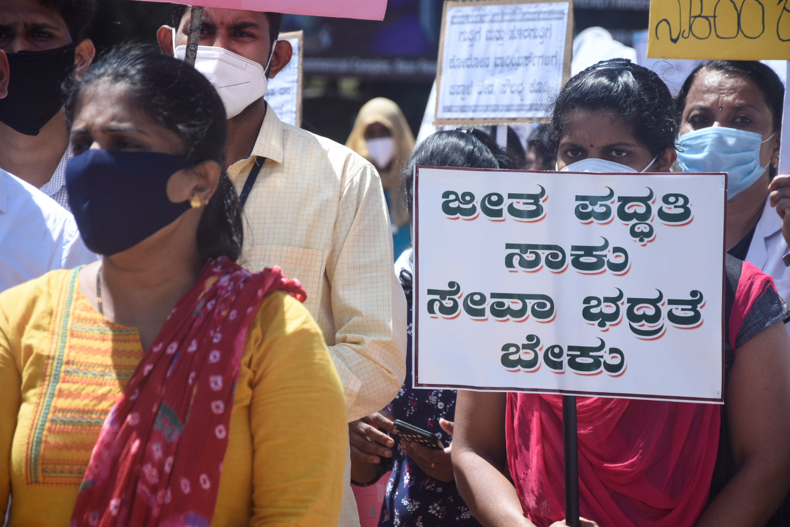 ಬೇಡಿಕೆ ಈಡೇರಿಸಲು ಒತ್ತಾಯಿಸುತ್ತಿದರೆ ಬೆದರಿಕೆ ನೋಟೀಸು: ಬೀದಿಗಿಳಿದ ಗುತ್ತಿಗೆ ಆಧಾರಿತ ಆರೋಗ್ಯ ಕಾರ್ಯಕರ್ತರ ಅಳಲು