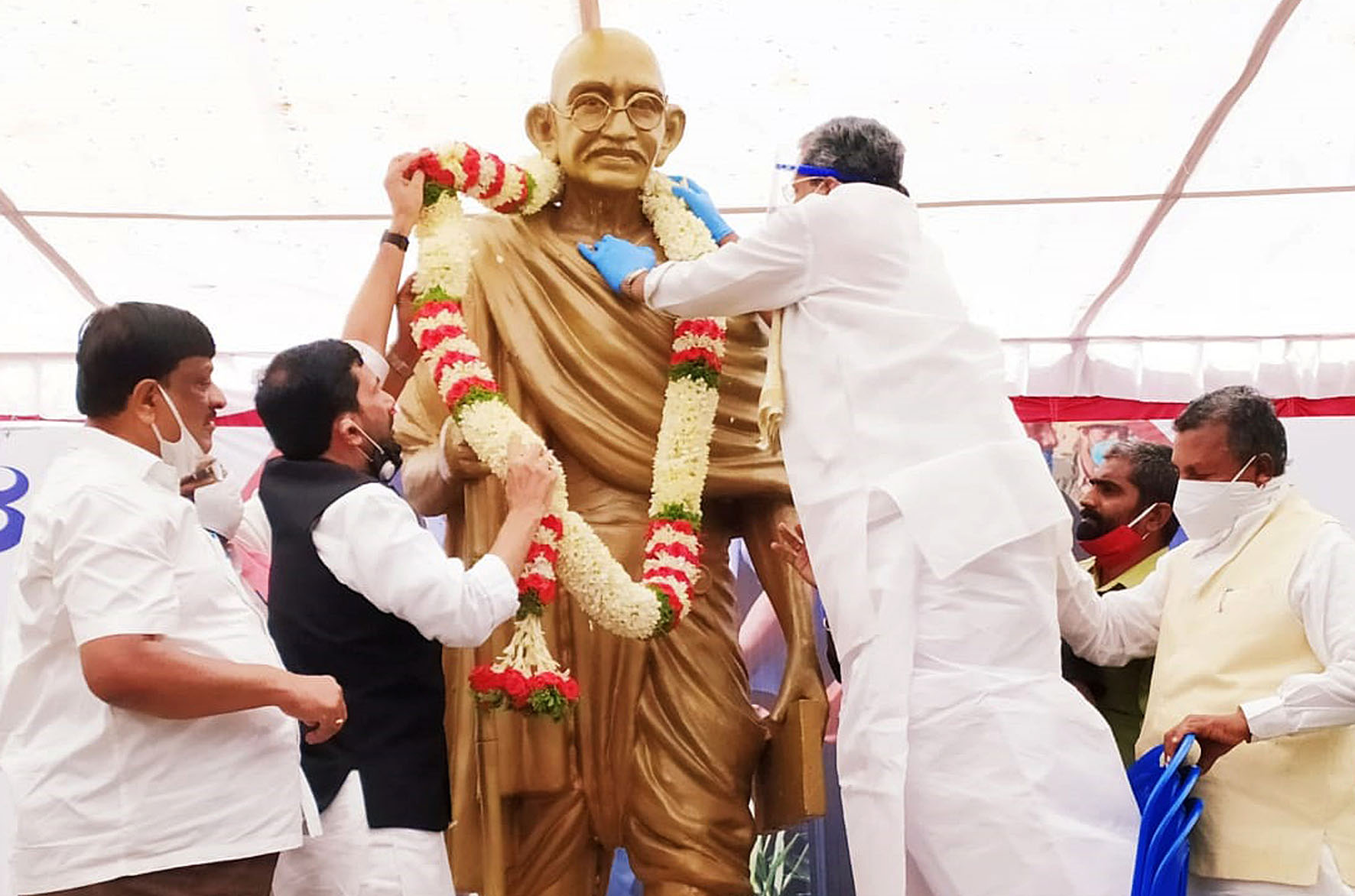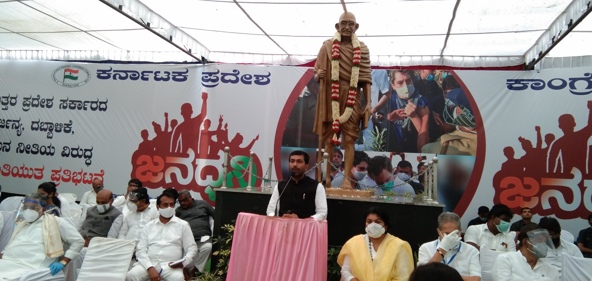 ಸೋಮವಾರ ನಗರದ ರೇಸ್ ಕೋರ್ಸ್ ರಸ್ತೆಯ ಕಾಂಗ್ರೆಸ್ ಭವನದ ಮಹಾತ್ಮ ಗಾಂಧಿ ಪ್ರತಿಮೆಯ ಮುಂಭಾಗದಲ್ಲಿ ಪ್ರತಿಭಟನೆ ನಡೆಸಿದ ನಾಯಕರು, ಉತ್ತರ ಪ್ರದೇಶ ಮುಖ್ಯಮಂತ್ರಿ ಯೋಗಿ ಆದಿತ್ಯನಾಥ್ ವಿರುದ್ಧ ತೀವ್ರ ವಾಗ್ದಾಳಿ ನಡೆಸಿದರು.