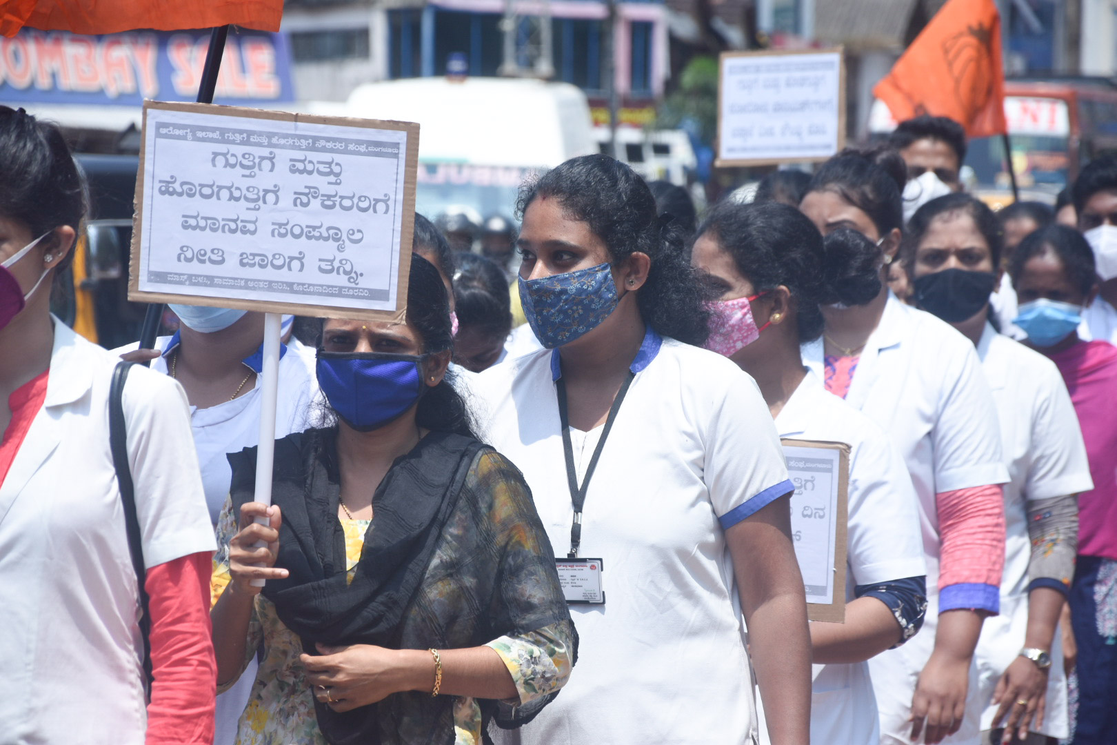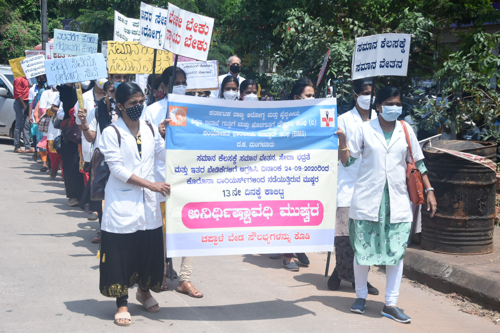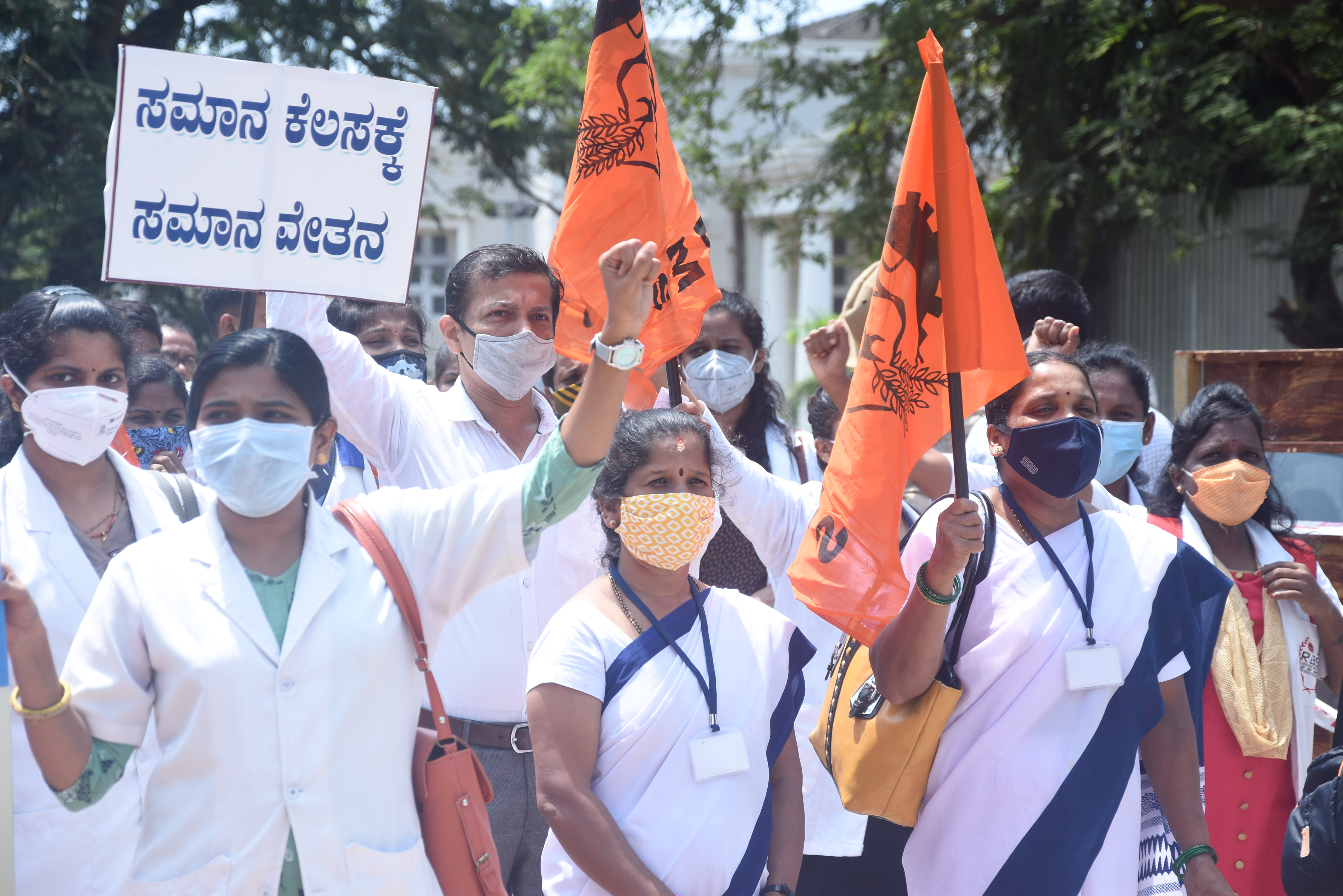 ಸಮಾನ ಕೆಲಸಕ್ಕೆ ಸಮಾನ ವೇತನ ಹಾಗೂ ಸೇವಾ ಭದ್ರತೆ ಆಗ್ರಹಿಸಿ ಸೆ.24ರಿಂದ ಕೊರೊನಾ ವಾರಿಯರ್ಸ್ಗಳಿಂದ ನಡೆಯುತ್ತಿರುವ ಮುಷ್ಕರವು 13ನೇ ದಿನಕ್ಕೆ ಕಾಲಿಟ್ಟ ಹಿನ್ನೆಲೆಯಲ್ಲಿ ಸರಕಾರ ಯಾವುದೇ ವರದಿ ನೀಡದ ಹಿನ್ನೆಲೆಯಲ್ಲಿ ಪ್ರತಿಭಟನೆ ಆಯೋಜಿಸಲಾಗಿತ್ತು.