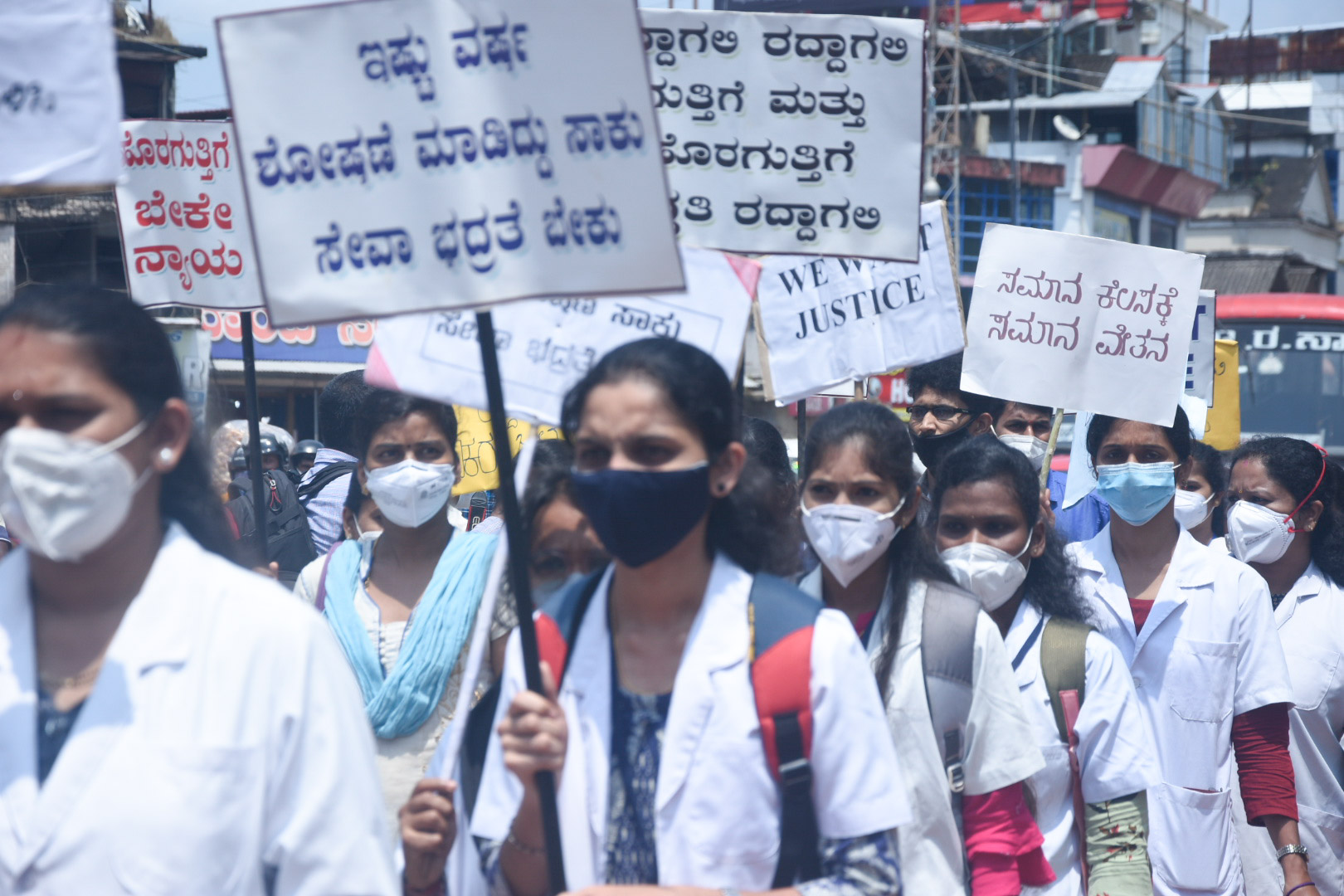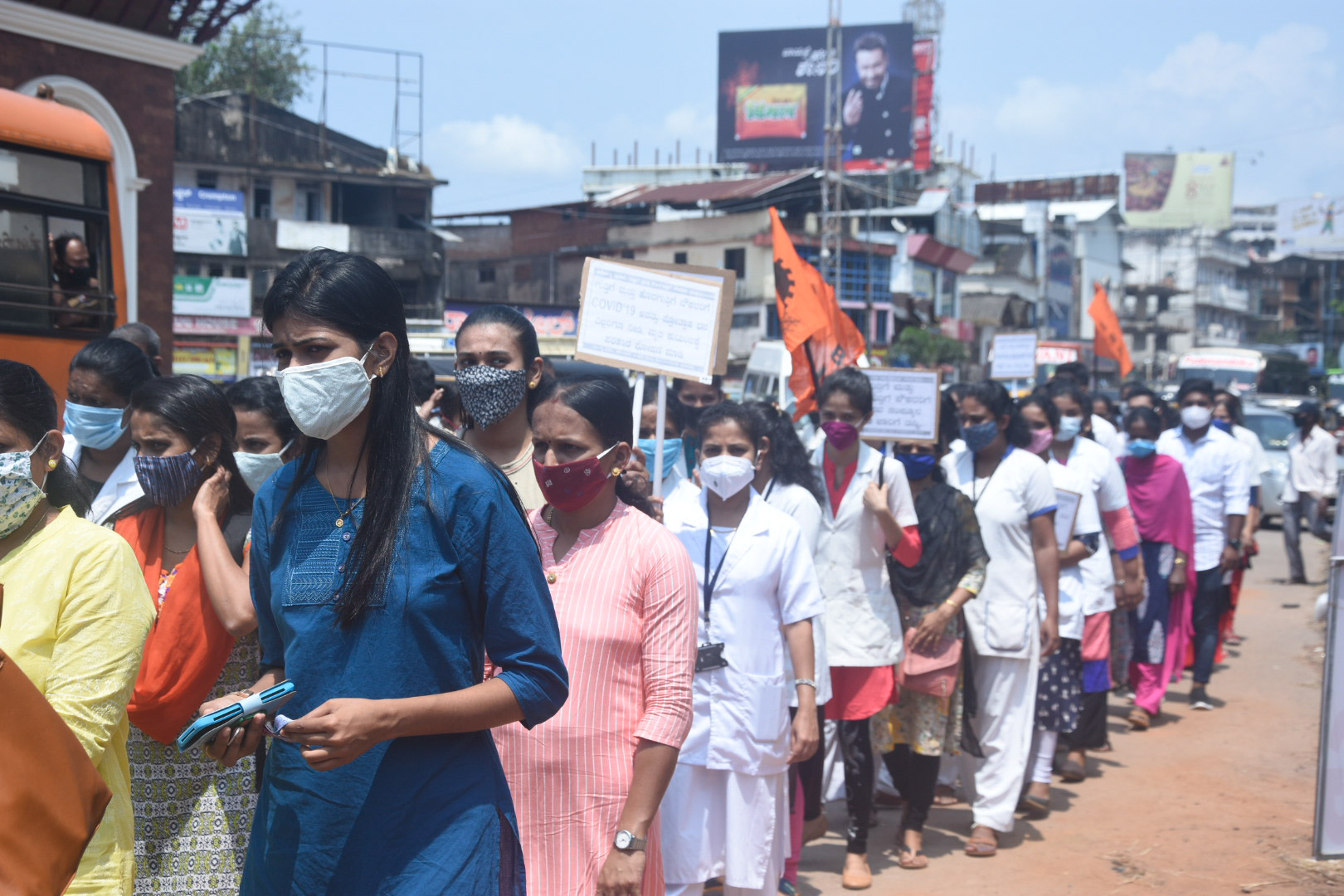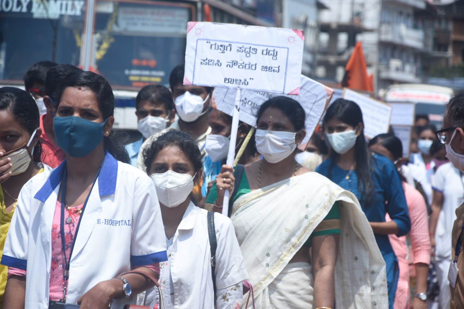 ಸಮಾನ ಕೆಲಸಕ್ಕೆ ಸಮಾನ ವೇತನ ಹಾಗೂ ಸೇವಾ ಭದ್ರತೆ ಆಗ್ರಹಿಸಿ ಸೆ.24ರಿಂದ ಕೊರೊನಾ ವಾರಿಯರ್ಸ್ಗಳಿಂದ ನಡೆಯುತ್ತಿರುವ ಮುಷ್ಕರವು 13ನೇ ದಿನಕ್ಕೆ ಕಾಲಿಟ್ಟ ಹಿನ್ನೆಲೆಯಲ್ಲಿ ಸರಕಾರ ಯಾವುದೇ ವರದಿ ನೀಡದ ಹಿನ್ನೆಲೆಯಲ್ಲಿ ಪ್ರತಿಭಟನೆ ಆಯೋಜಿಸಲಾಗಿತ್ತು.