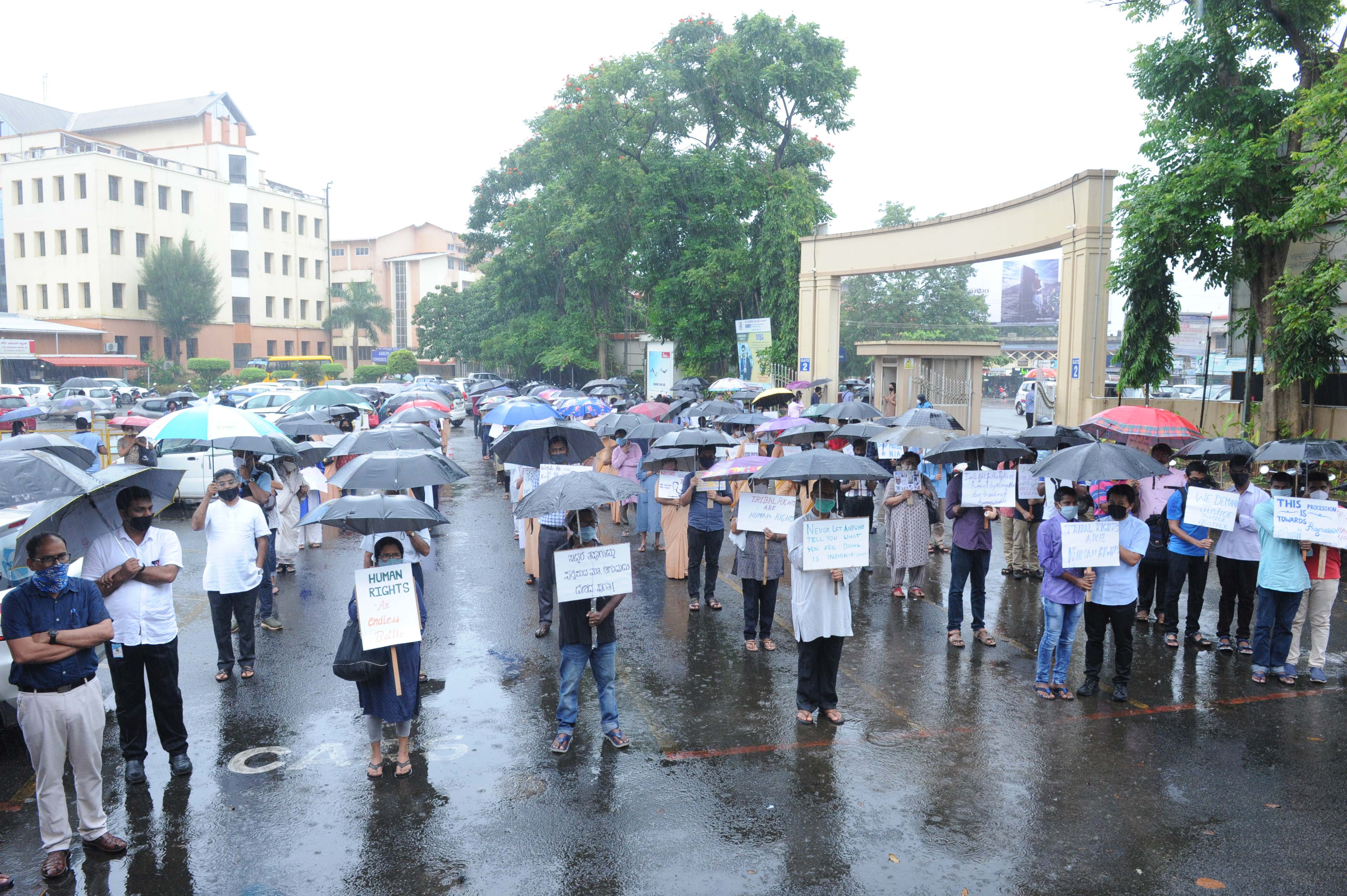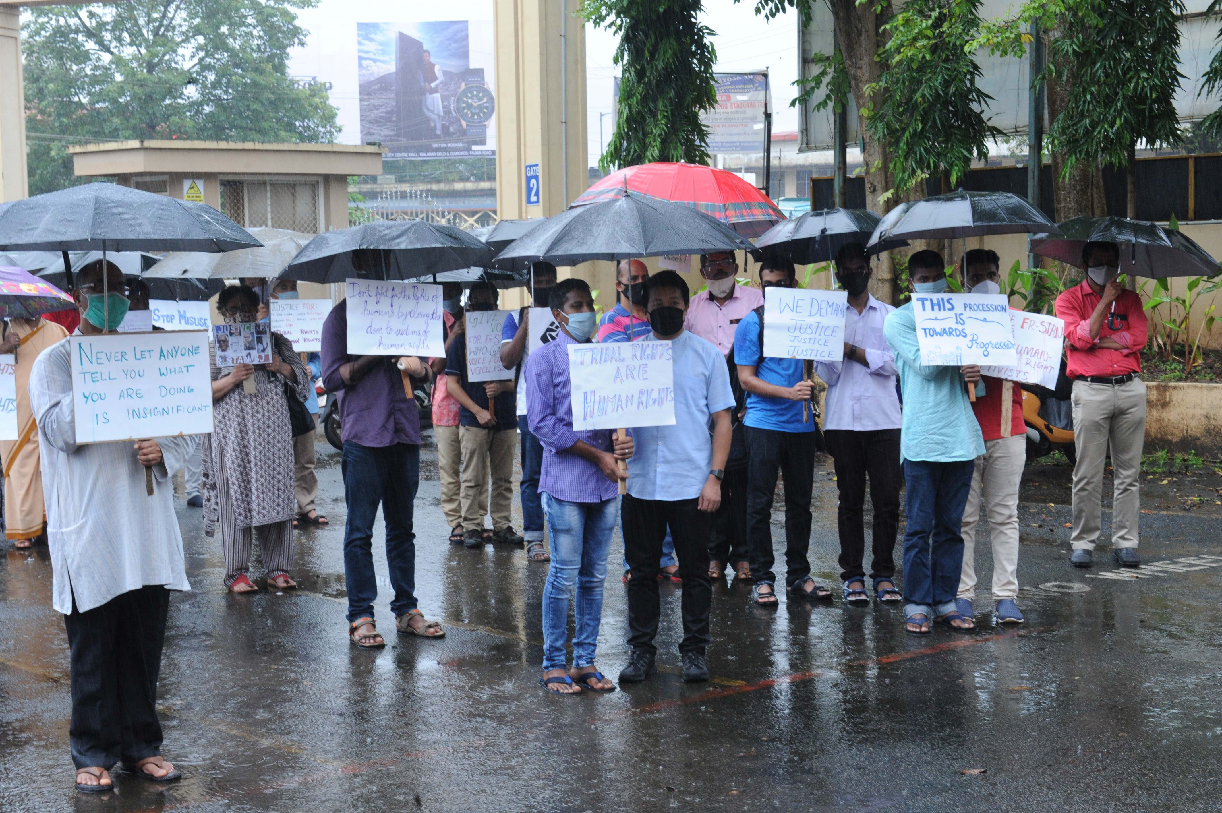 ಮಂಗಳೂರು, ಅ.12: ಜಾರ್ಖಂಡ್ನ ರಾಂಚಿಯಲ್ಲಿ ಆದಿವಾಸಿಗಳ ಹಕ್ಕುಗಳ ಪರವಾಗಿ ಕೆಲಸ ಮಾಡುತ್ತಿರುವ ಮಾನವ ಹಕ್ಕು ಕಾರ್ಯಕರ್ತ ಜೆಸೂಯೆಟ್ ಸಭೆಯ ಧರ್ಮಗುರು ವಂ. ಸ್ಟ್ಯಾನ್ ಸ್ವಾಮಿ ಅವರನ್ನು ರಾಷ್ಟ್ರೀಯ ತನಿಖಾ ಸಂಸ್ಥೆ (ಎನ್ಐಎ) ವಶಕ್ಕೆ ಪಡೆದು ಮುಂಬೈ ಜೈಲಿಗೆ ಕಳುಹಿಸಿರುವುದನ್ನು ಖಂಡಿಸಿ ಮತ್ತು ಅವರನ್ನು ತಕ್ಷಣ ಬಿಡುಗಡೆ ಮಾಡಬೇಕೆಂದು ಆಗ್ರಹಿಸಿ ಸೋಮವಾರ ನಗರದ ಸಂತ ಅಲೋಶಿಯಸ್ ಕಾಲೇಜು ಆವರಣದಲ್ಲಿ ಧರಣಿ ನಡೆಯಿತು.