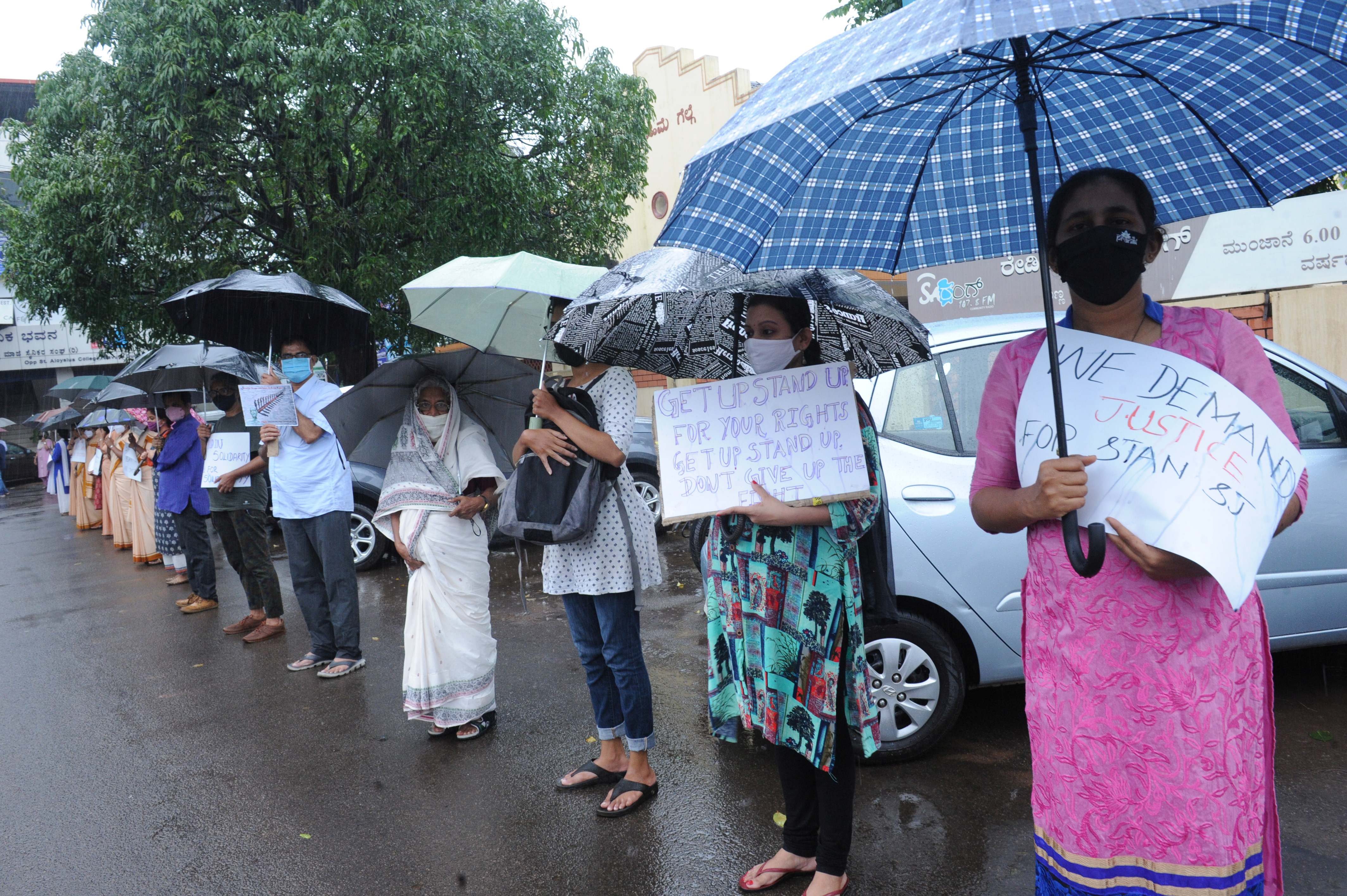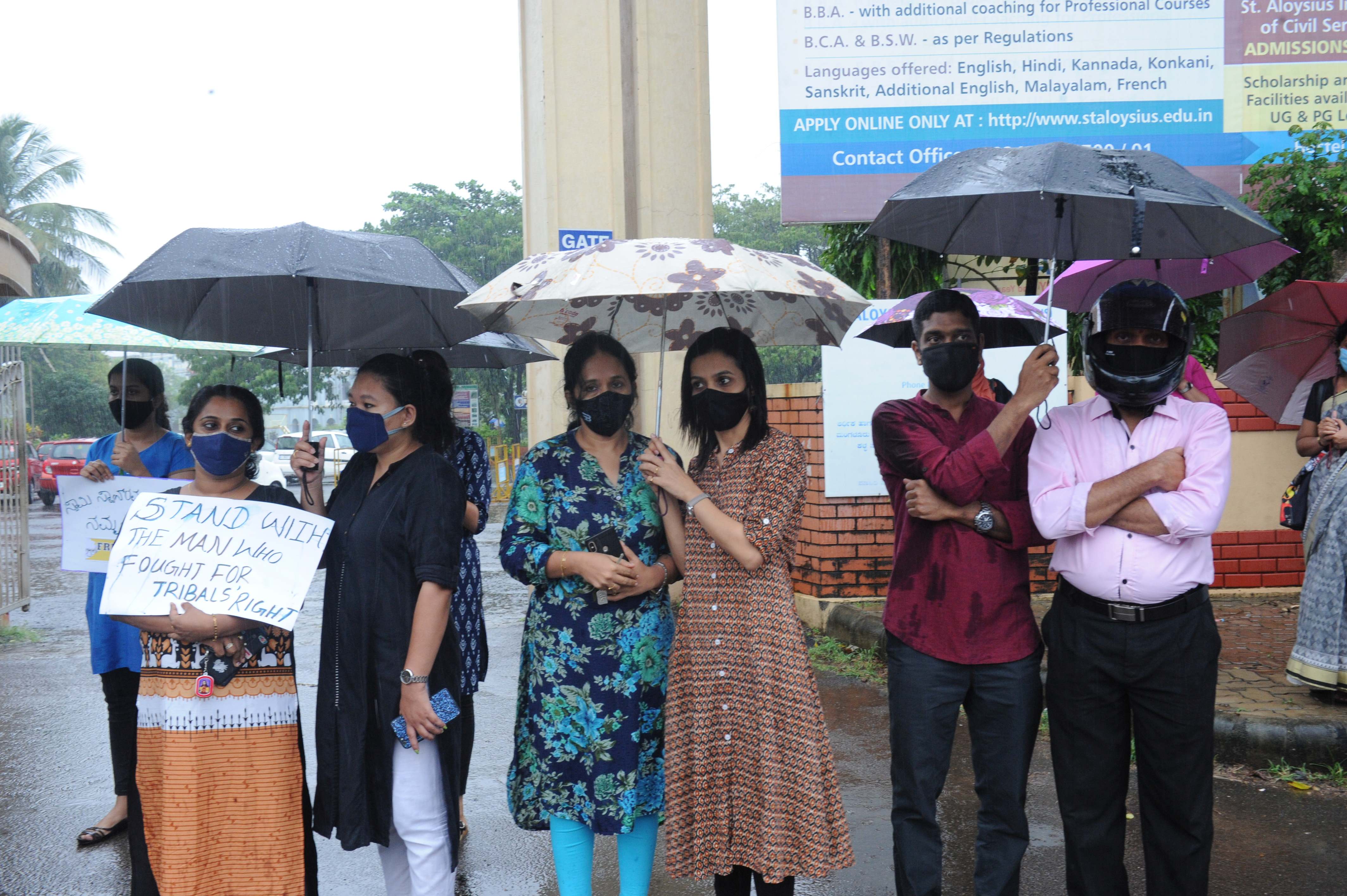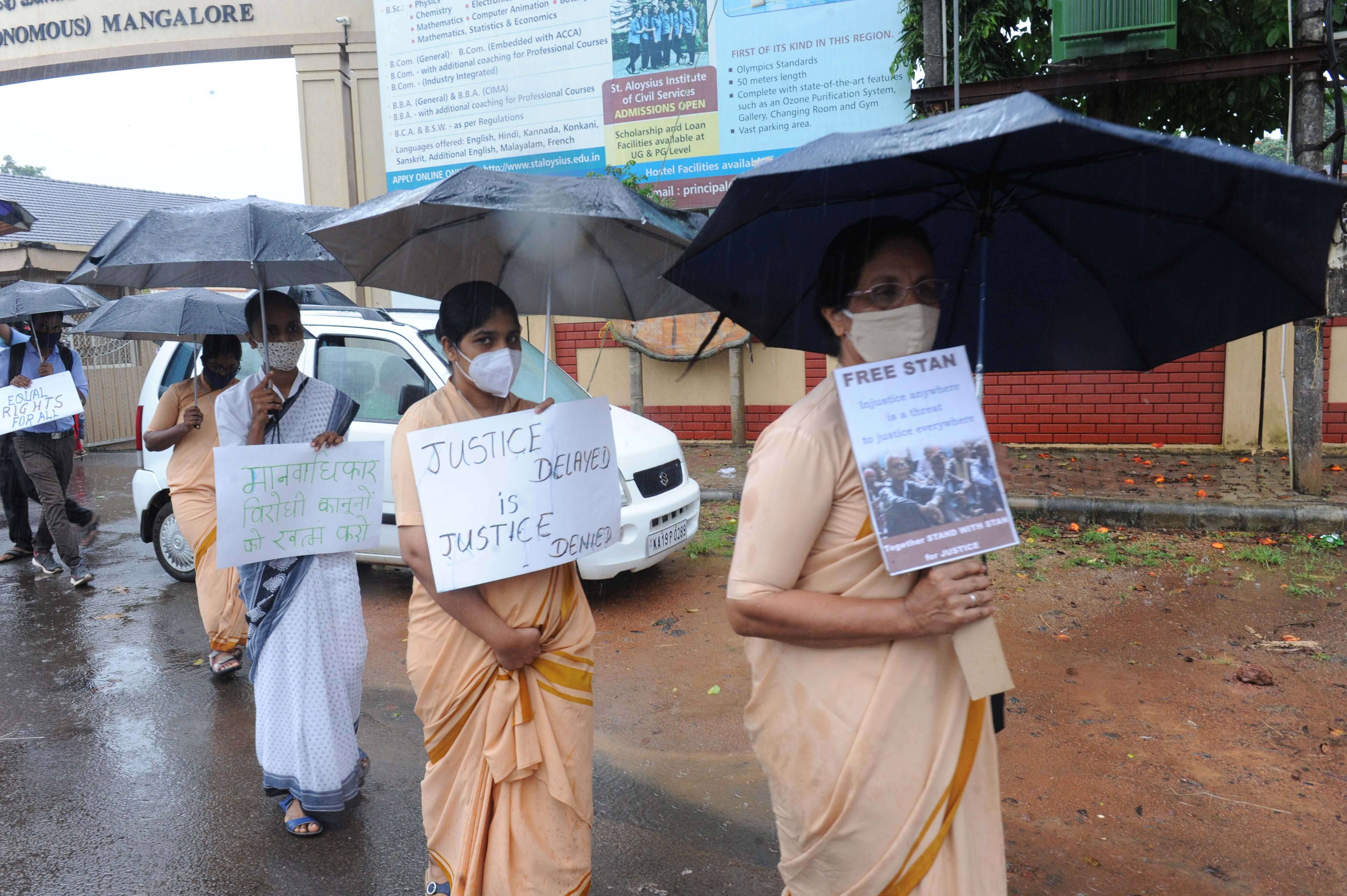 ಸಂತ ಅಲೋಶಿಯಸ್ ಕಾಲೇಜು, ಸ್ಪಂದನಾ ಟ್ರಸ್ಟ್ ಮತ್ತು ಸಿಟಿಝನ್ಸ್ ಫೋರಂ ಫೋರ್ ಮ್ಯಾಂಗಳೂರ್ ಡೆವಲಪ್ಮೆಂಟ್ ಸಂಸ್ಥೆಯ ಸಹಯೋಗದಲ್ಲಿ ನಡೆದ ಧರಣಿಯಲ್ಲಿ ಮಾನವ ಹಕ್ಕುಗಳು ಕಾರ್ಯಕರ್ತರಾದ ವಂ. ಸ್ಟಾನ್ ಸ್ವಾಮಿ ಕಳೆದ 15 ವರ್ಷಗಳಿಂದ ಆದಿವಾಸಿ ಮತ್ತು ಬಡವರ ಹಕ್ಕುಗಳಿಗಾಗಿ ಹೋರಾಟ ನಡೆಸುತ್ತಿದ್ದಾರೆ. ಅವರಿಗೆ ನಕ್ಸಲ್ ಸಂಪರ್ಕ ಇದೆ ಎಂಬ ಆರೋಪದಲ್ಲಿ ಹುರುಳಿಲ್ಲ. ಅವರ ಸಹಿತ ವಶಕ್ಕೆ ಪಡೆದಿರುವ ಇತರ 15 ಮಂದಿಯನ್ನು ಕೂಡಲೇ ಬಿಡುಗಡೆ ಮಾಡಬೇಕು ಎಂಬ ಆಗ್ರಹ ಕೇಳಿ ಬಂತು.