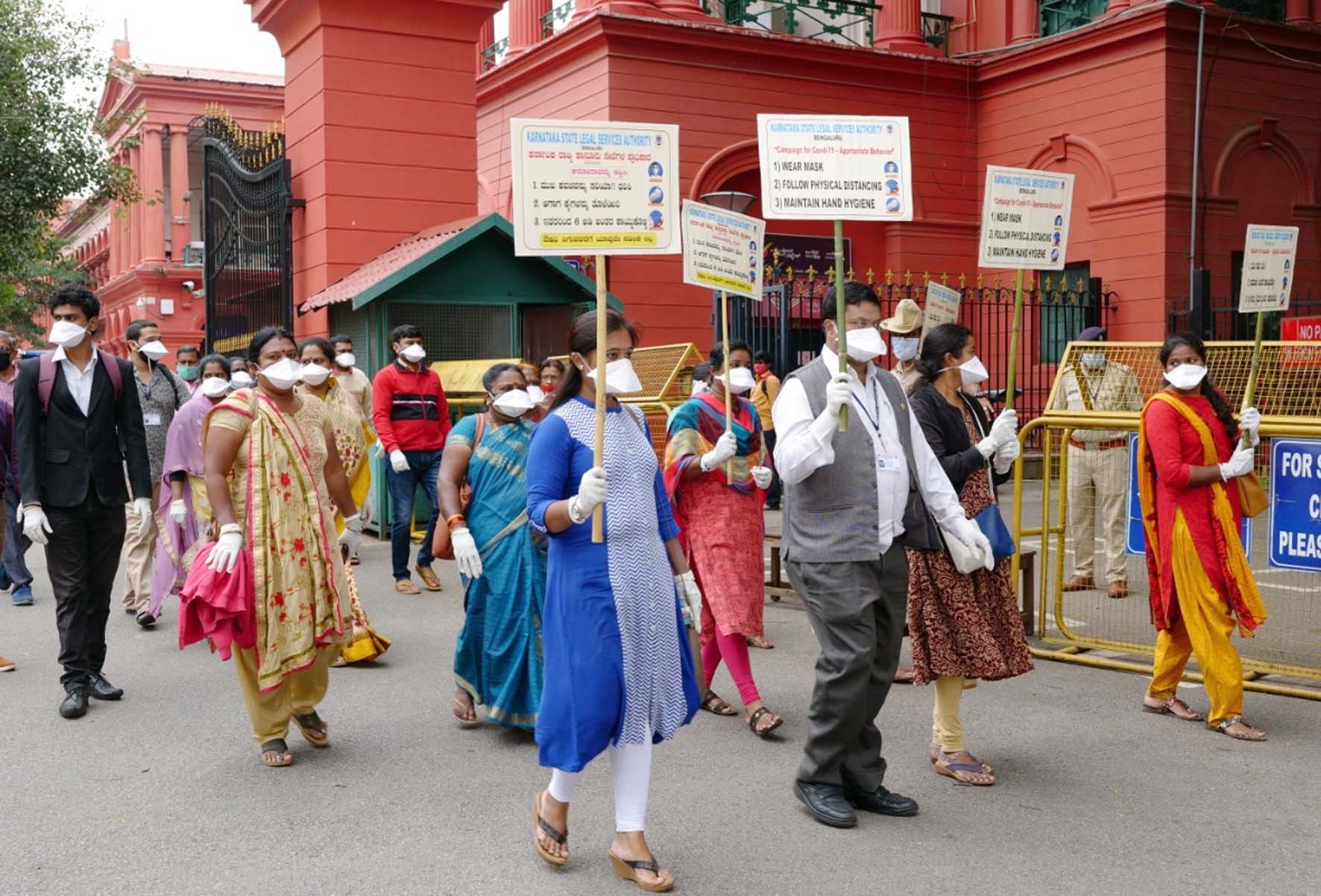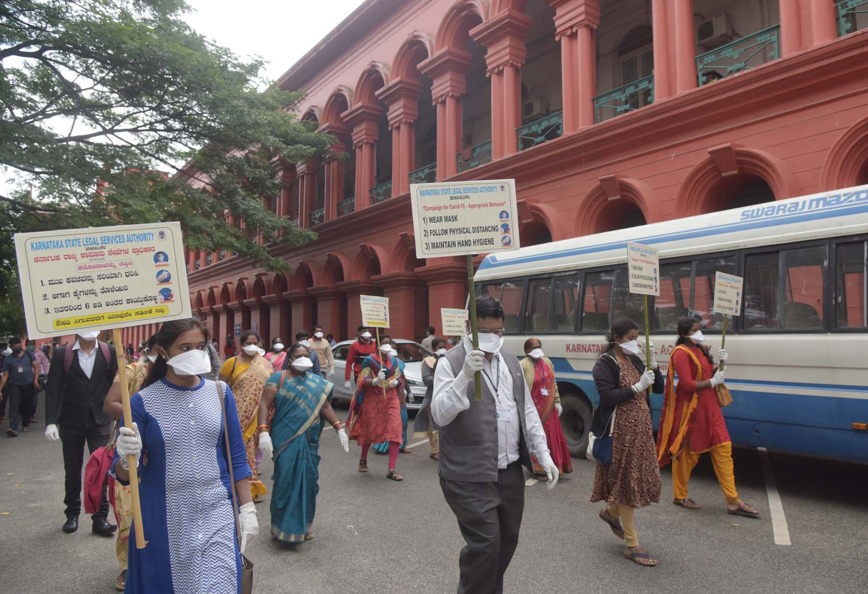 ಕೋವಿಡ್-19 ಜಾಗೃತಿ ಸಂದೇಶಗಳನ್ನೊಳಗೊಂಡ ಭಿತ್ತಿಪತ್ರ ಹಾಗೂ ಸಂದೇಶಗಳೊಂದಿಗೆ ಹಲವಾರು ವಿಶೇಷ ವಾಹನದ ಜೊತೆಯಲ್ಲಿ ಸಿಟಿ ಸಿವಿಲ್ ಕೋರ್ಟ್ ಆವರಣದವರೆಗೆ ಹೆಜ್ಜೆ ಹಾಕಲಾಯಿತು.