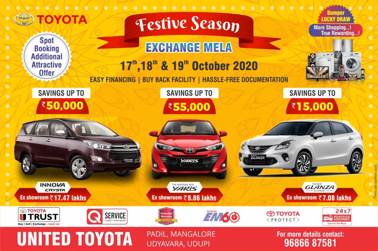 ಯುನೈಟೆಡ್ ಟೊಯೊಟದಿಂದ ಫೆಸ್ಟಿವ್ ಸೀಸನ್ : ಅ.19ರವರೆಗೆ ಎಕ್ಸ್ಚೇಂಜ್ ಮೇಳ