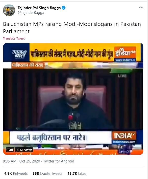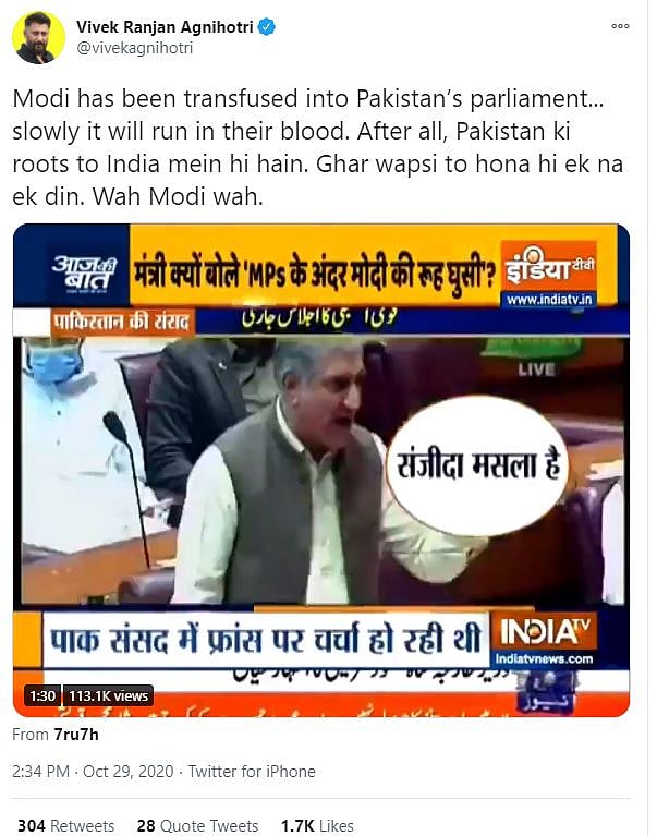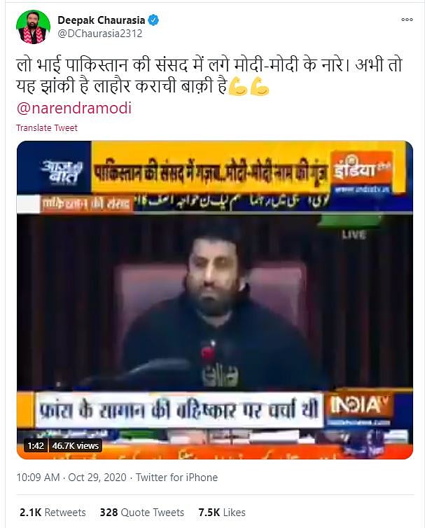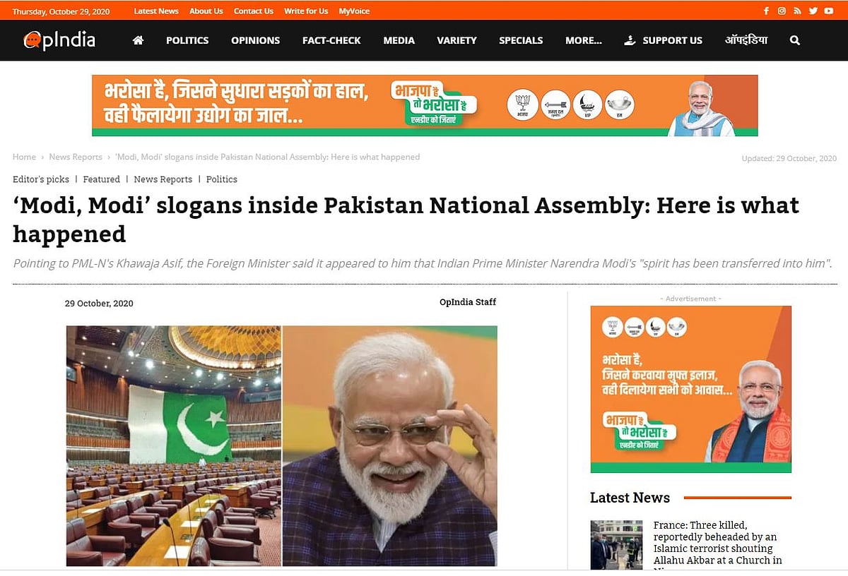 ಹೊಸದಿಲ್ಲಿ: ಪ್ರವಾದಿ ವ್ಯಂಗ್ಯಚಿತ್ರಗಳನ್ನು ತರಗತಿಯಲ್ಲಿ ವಿದ್ಯಾರ್ಥಿಗಳಿಗೆ ತೋರಿಸಿದ ಶಿಕ್ಷಕನ ಶಿರಚ್ಛೇದನ ಪ್ರಕರಣ ಸಂಬಂಧ ಫ್ರಾನ್ಸ್ ಅಧ್ಯಕ್ಷ ಇಮ್ಯಾನುವೆಲ್ ಮ್ಯಾಕ್ರೋನ್ ತಳೆದಿದ್ದಾರೆಂದು ಆರೋಪಿಸಲಾದ ಇಸ್ಲಾಂ ವಿರೋಧಿ ಧೋರಣೆಯನ್ನು ಖಂಡಿಸಲು ಇತ್ತೀಚೆಗೆ ನಡೆದ ಪಾಕಿಸ್ತಾನದ ಸಂಸತ್ ಅಧಿವೇಶನದ ಸಂದರ್ಭ ಕೆಲವು ಸಂಸದರು ಭಾರತದ ಪ್ರಧಾನಿ ನರೇಂದ್ರ ಮೋದಿಯನ್ನು ಬೆಂಬಲಿಸಿ 'ಮೋದಿ' 'ಮೋದಿ' ಎಂಬ ಘೋಷಣೆಗಳನ್ನು ಕೂಗಿದ್ದಾರೆದು ಹೇಳಿಕೊಂಡು ಈ ಕುರಿತಾದ ವೀಡಿಯೋ ಕ್ಲಿಪ್ ಒಂದನ್ನು ಮುಖ್ಯವಾಹಿನಿ ಟಿವಿ ಚಾನೆಲುಗಳಾದ 'ಇಂಡಿಯಾ ಟಿವಿ', 'ಟೈಮ್ಸ್ ನೌ' ಸಹಿತ ಬಲಪಂಥೀಯ ವೆಬ್ಸೈಟ್ 'ಓಪ್ಇಂಡಿಯಾ' ಕೂಡ ಪ್ರಸಾರ ಮಾಡಿದ್ದವು.