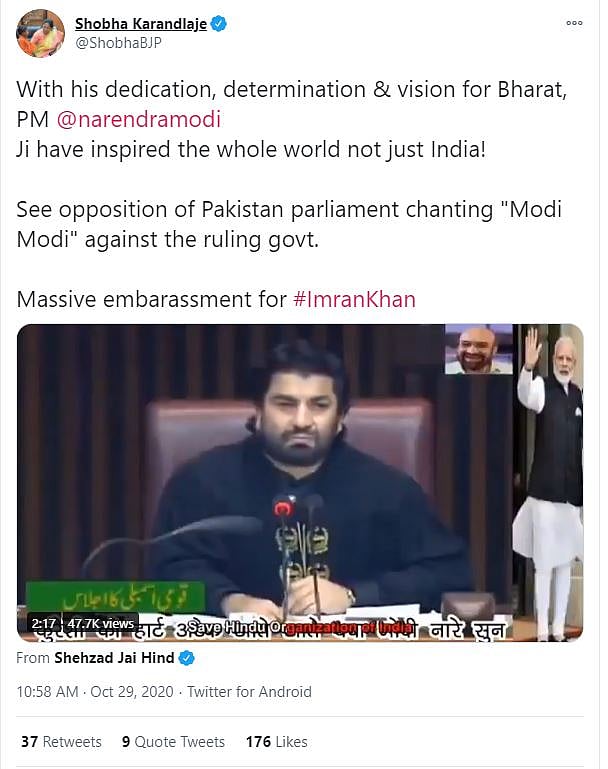 ಶೋಭಾ ತಮ್ಮ ಟ್ವೀಟ್ನಲ್ಲಿ ಈ ವೀಡಿಯೋ ಪೋಸ್ಟ್ ಮಾಡಿ "ತಮ್ಮ ನಿಷ್ಠೆ, ಬದ್ಧತೆ ಹಾಗೂ ಭಾರತದ ಅಭಿವೃದ್ಧಿ ಕುರಿತಾದ ದೂರದೃಷ್ಟಿ ಹೊಂದಿರುವ ಪ್ರಧಾನಿ ನರೇಂದ್ರ ಮೋದಿ ಭಾರತ ಮಾತ್ರವಲ್ಲ ಇಡೀ ವಿಶ್ವಕ್ಕೆ ಸ್ಪೂರ್ತಿಯಾಗಿದ್ದಾರೆ. ನೋಡಿ ಪಾಕಿಸ್ತಾನದ ಸಂಸತ್ತಿನಲ್ಲೂ ವಿಪಕ್ಷಗಳು ಆಡಳಿತ ಸರಕಾರಕ್ಕೆ ವಿರುದ್ಧವಾಗಿ ಅಲ್ಲಿ 'ಮೋದಿ ಮೋದಿ' ಘೋಷಣೆ ಕೂಗುತ್ತಿದ್ದಾರೆ,'' ಎಂದು ಬರೆದಿದ್ದಾರೆ.