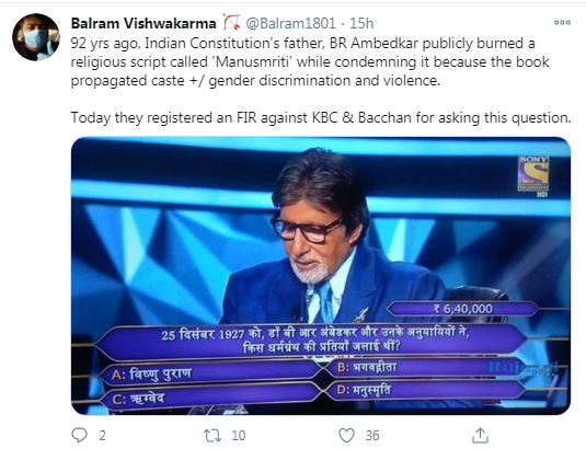 "ಮನುಸ್ಮೃತಿ ಜಾತಿ ಮತ್ತು ಲಿಂಗಾಧರಿತ ತಾರತಮ್ಯ ಮತ್ತು ಹಿಂಸೆಯನ್ನು ಪ್ರಚೋದಿಸುತ್ತದೆಯೆಂದು ಅದನ್ನು ಖಂಡಿಸಿ ಅಂಬೇಡ್ಕರ್ ಅವರು 92 ವರ್ಷಗಳ ಹಿಂದೆ ಅದನ್ನು ಸಾರ್ವಜನಿಕವಾಗಿ ಸುಟ್ಟರು. ಇಂದು ಈ ಕುರಿತು ಪ್ರಶ್ನೆ ಕೇಳಿದ್ದಕ್ಕೆ ಅವರು ಕೆಬಿಸಿ ಹಾಗೂ ಬಚ್ಚನ್ ವಿರುದ್ಧ ಎಫ್ಐಆರ್ ದಾಖಲಿಸಿದ್ದಾರೆ.'' ಎಂದು ಒಬ್ಬರು ಪ್ರತಿಕ್ರಿಯಿಸಿದರೆ ಇನ್ನೊಬ್ಬರು ಈ ಕುರಿತು ಪ್ರತಿಕ್ರಿಯಿಸಿ "ಇಂತಹ ಒಂದು ಪ್ರಶ್ನೆಯಿಂದಾಗಿ ಈ ಕಾರ್ಯಕ್ರಮ ಇಂದು ಧರ್ಮವನ್ನು ಅವಮಾನಿಸುತ್ತದೆ ಎಂದು ಅವರು ಹೇಳುತ್ತಿದ್ದಾರೆ.'' ಎಂದು ಬರೆದಿದ್ದಾರೆ.