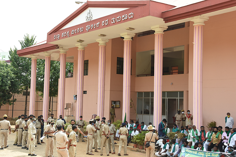 ಪೊಲೀಸ್ ಠಾಣೆಯ ಮುಂದೆ ಪ್ರತಿಭಟನೆ: ರೈತರನ್ನು ಬಂಧಿಸಿ, ಡಿ.ಆರ್.ಕಚೇರಿ ಬಳಿ ಕರೆ ತಂದ ನಂತರ ಅಲ್ಲಿಯೂ ಪ್ರತಿಭಟನೆ ಮುಂದುವರೆಸಿದ ರೈತರು, ಸರಕಾರ ಜಾರಿಗೆ ತಂದಿರುವ ಕಾಯ್ದೆಗಳು, ಅವುಗಳಿಂದ ರೈತರಿಗೆ ಆಗುವ ತೊಂದರೆಗಳ ಕುರಿತು ವಿವರ ನೀಡುವ ಮೂಲಕ ರೈತರಲ್ಲಿ ಜಾಗೃತಿ ಮೂಡಿಸಿದರು.