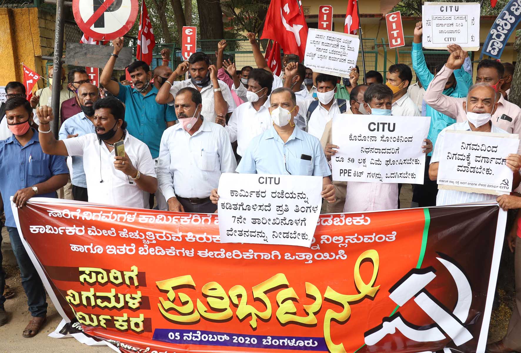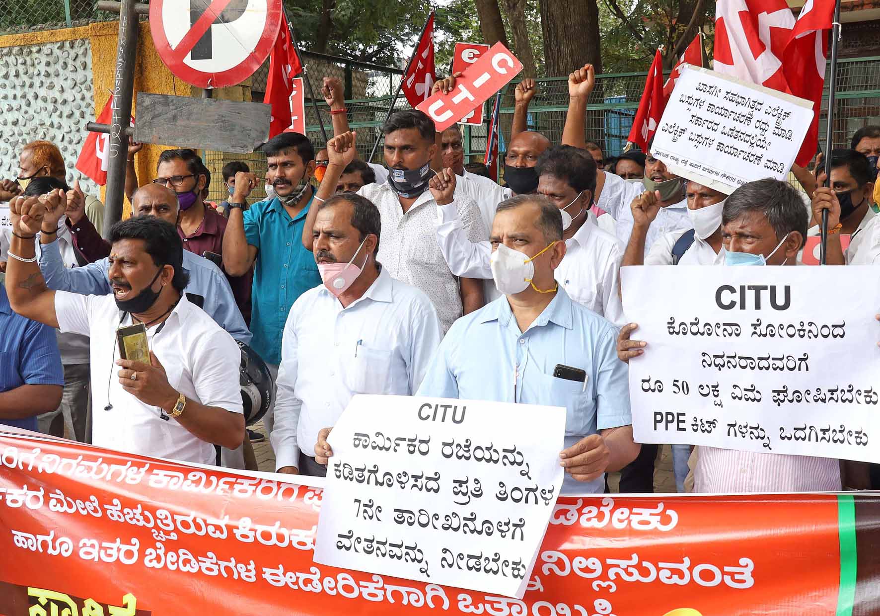 ಸಿಐಟಿಯು ಕಾರ್ಮಿಕ ಸಂಘಟನೆಯ ವತಿಯಿಂದ ಕರ್ನಾಟಕ ರಾಜ್ಯ ರಸ್ತೆ ಸಾರಿಗೆ ನಿಗಮಗಳ ನೌಕರರ ಒಕ್ಕೂಟ ನೇತೃತ್ವದಲ್ಲಿ ನಾಲ್ಕು ಸಾರಿಗೆ ನಿಗಮಗಳ ಕಾರ್ಮಿಕರು ಗುರುವಾರ ಫ್ರೀಡಂ ಪಾರ್ಕ್ನಲ್ಲಿ ಪ್ರತಿಭಟನೆ ನಡೆಸಿದರು.