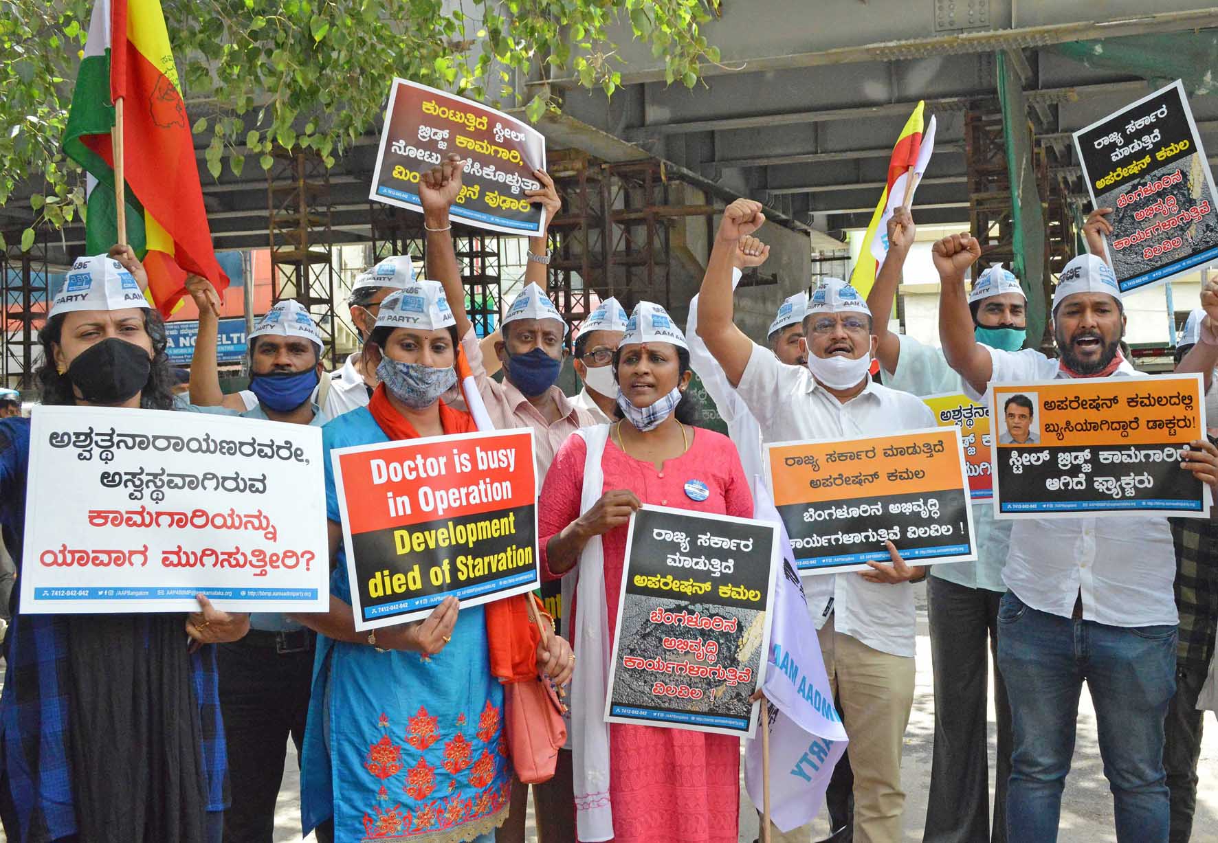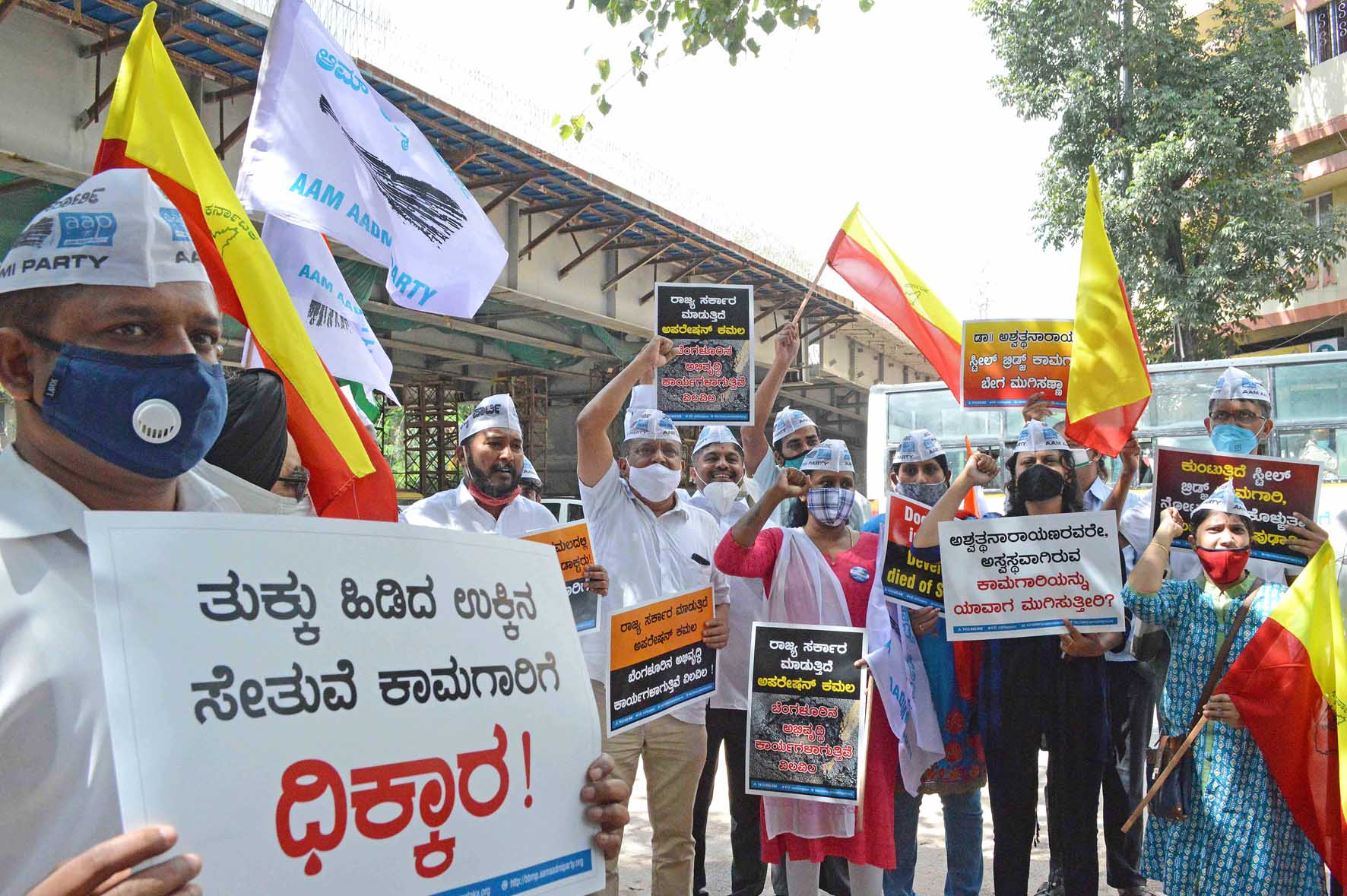 ಬೆಂಗಳೂರು, ನ.6: ನಗರದ ಶಿವಾನಂದ ವೃತ್ತ ಉಕ್ಕಿನ ಸೇತುವೆ ಕಾಮಗಾರಿಯನ್ನು ಶೀಘ್ರವಾಗಿ ಪೂರ್ಣಗೊಳಿಸಬೇಕು ಎಂದು ಆಗ್ರಹಿಸಿ ಆಮ್ಆದ್ಮಿ ಪಕ್ಷದ ವತಿಯಿಂದ ಪ್ರತಿಭಟನೆ ನಡೆಸಲಾಯಿತು.