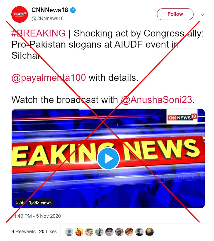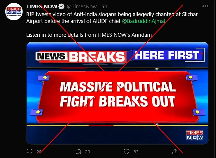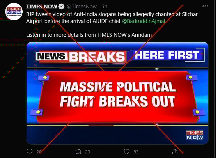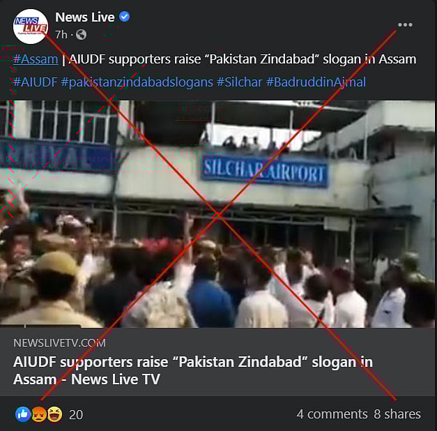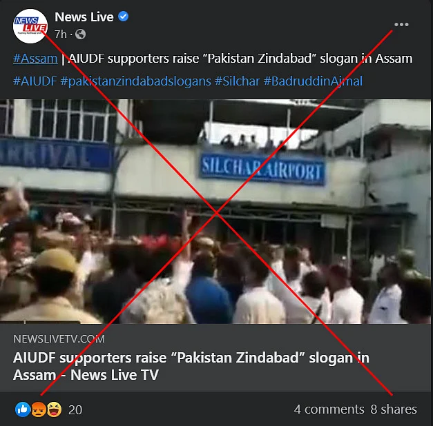 ಗುವಾಹಟಿ: ನವೆಂಬರ್ 6ರಂದು ಬಿಜೆಪಿ ನಾಯಕ ಹಾಗೂ ಅಸ್ಸಾಂ ಆರೋಗ್ಯ ಸಚಿವ ಹಿಮಂತ ಬಿಸ್ವ ಸರ್ಮ ಅವರು ವೀಡಿಯೋವೊಂದನ್ನು ಟ್ವೀಟ್ ಮಾಡಿದರಲ್ಲದೆ ರಾಜ್ಯದ ಸಿಲ್ಚಾರ್ ವಿಮಾನ ನಿಲ್ದಾಣದಲ್ಲಿ ಆಲ್ ಇಂಡಿಯಾ ಯುನೈಟೆಡ್ ಡೆಮಾಕ್ರೆಟಿಕ್ ಫ್ರಂಟ್ (ಎಐಯುಡಿಎಫ್) ಬೆಂಬಲಿಗರು ಪಾಕಿಸ್ತಾನ್ ಝಿಂದಾಬಾದ್ ಘೋಷಣೆಗಳನ್ನು ಕೂಗುತ್ತಿದ್ದಾರೆಂಬುದನ್ನು ಈ ವೀಡಿಯೋ ತೋರಿಸುತ್ತದೆ ಎಂದು ಬರೆದಿದ್ದರು. ಆದರೆ ವಾಸ್ತವವಾಗಿ ಎಐಯುಡಿಎಫ್ ಬೆಂಬಲಿಗರು ತಮ್ಮ ಸಂಘಟನೆ ಸದಸ್ಯರಾಗಿರುವ ಶಾಸಕ ಅಝೀಝ್ ಅಹ್ಮದ್ ಖಾನ್ ಅವರನ್ನು ಸ್ವಾಗತಿಸಲು 'ಅಝೀಝ್ ಖಾನ್ ಝಿಂದಾಬಾದ್' ಘೋಷಣೆಗಳನ್ನು ಕೂಗುತ್ತಿದ್ದರು ಎಂದು ತಿಳಿದು ಬಂದಿದೆ.
