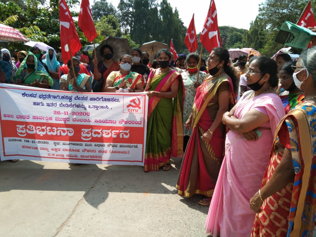 ಮಂಗಳೂರು, ನ.9: ಕೇಂದ್ರ ಹಾಗೂ ರಾಜ್ಯ ಸರಕಾರಗಳ ಕಾರ್ಮಿಕ, ರೈತ ವಿರೋಧಿ ಮತ್ತು ಜನ ವಿರೋಧಿ ನೀತಿಗಳ ವಿರುದ್ಧ ನ.26ರಂದು ನಡೆಯುವ ಅಖಿಲ ಭಾರತ ಸಾರ್ವತ್ರಿಕ ಮುಷ್ಕರಕ್ಕೆ ಬೆಂಬಲ ಸೂಚಿಸಿ ನಗರದ ಮಂಗಳೂರು ಮಿನಿ ವಿಧಾನ ಸೌಧದ ಮುಂದೆ ಸೋಮವಾರ ಬಿಸಿಯೂಟ ನೌಕರರಿಂದ ಪ್ರತಿಭಟನೆ ನಡೆಯಿತು.