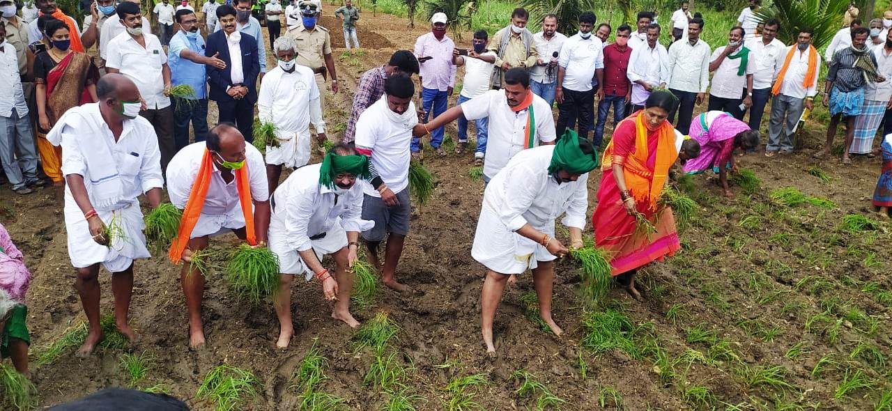 ಮಡುವಿನಕೋಡಿ ಗ್ರಾಮದ ಪ್ರಗತಿಪರ ರೈತ ಮಹಿಳೆ ಲಕ್ಷ್ಮಿದೇವಮ್ಮ ಅವರ ಸಮಗ್ರ ಕೃಷಿ ತೋಟಕ್ಕೆ ಭೇಟಿ ಕೊಟ್ಟ ಕೃಷಿ ಸಚಿವ ಬಿ.ಸಿ.ಪಾಟೀಲ್ ಹಾಗೂ ಜಿಲ್ಲಾ ಉಸ್ತುವಾರಿ ಸಚಿವ ಕೆ.ಸಿ.ನಾರಾಯಣಗೌಡ ಭತ್ತದ ಗದ್ದೆ ವೀಕ್ಷಿಸಿಸುವ ಮೂಲಕ ಕಾರ್ಯಕ್ರಮಕ್ಕೆ ಚಾಲನೆ ನೀಡಿದರು.