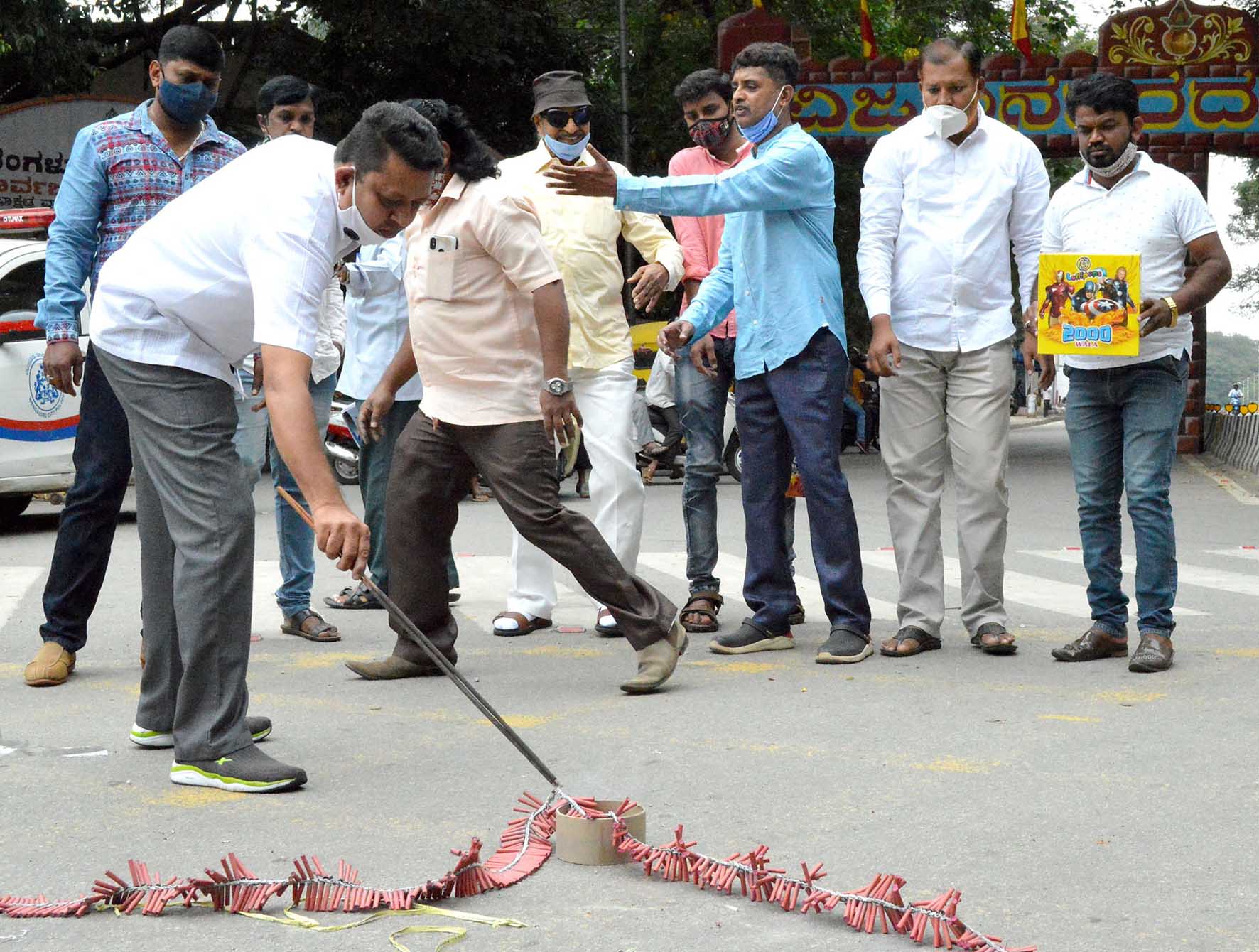 ಮುಖ್ಯಮಂತ್ರಿ ಬಿ.ಎಸ್.ಯಡಿಯೂರಪ್ಪ ಅವರು ಮರಾಠಿ ಪ್ರಾಧಿಕಾರ ರಚನೆಯ ತೀರ್ಮಾನವನ್ನು ಕೈಬಿಡಬೇಕು. ಇಲ್ಲವೇ ರಾಜೀನಾಮೆ ನೀಡಬೇಕೆಂದು ಆಗ್ರಹಿಸಿ ಪಟಾಕಿ ಸಿಡಿಸಿ ಆಕ್ರೋಶ ಹೊರ ಹಾಕಿದರು.