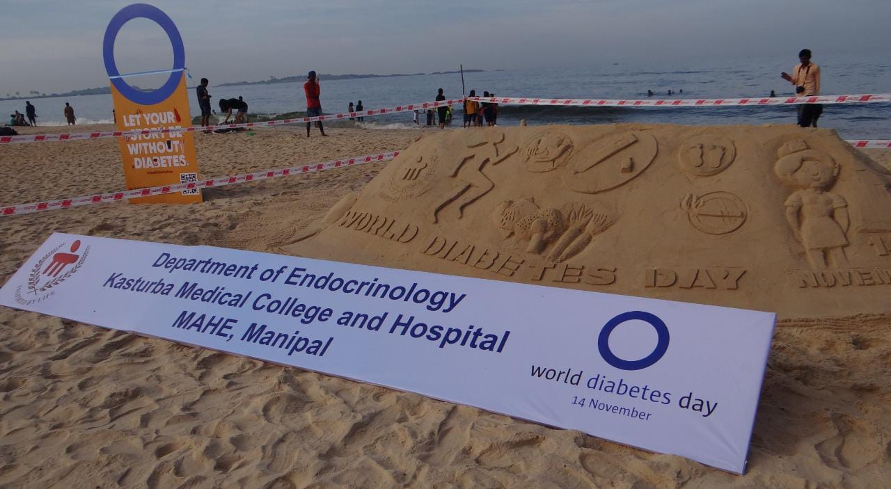 ಮಣಿಪಾಲ, ನ.15: ಮಣಿಪಾಲದ ಕಸ್ತೂರ್ಬಾ ಮೆಡಿಕಲ್ ಕಾಲೇಜು ಹಾಗೂ ಆಸ್ಪತ್ರೆಯ ಅಂತ:ಸ್ರಾವ ಶಾಸ್ತ್ರ (ಎಂಡೋ ಕ್ರೈನೊಲೋಜಿ) ವಿಭಾಗವು ವಿಶ್ವ ಮಧುಮೇಹ ದಿನಾಚರಣೆಯ ಸಂಬಂಧ ನ.14ರಂದು ಮಲ್ಪೆ ಸಮುದ್ರ ಕಿನಾರೆಯಲ್ಲಿ ಮಧುಮೇಹದ ಬಗ್ಗೆ ಜಾಗೃತಿ ಮೂಡಿಸುವ ಮರಳು ಶಿಲ್ಪವನ್ನು ರಚಿಸುವ ಮೂಲಕ ವಿಶಿಷ್ಟ ರೀತಿಯಲ್ಲಿ ಆಚರಿಸಿತು.