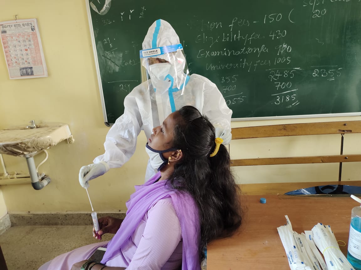 ಕಾಲೇಜಿನಲ್ಲಿ ಪರೀಕ್ಷೆ: ಜಿಲ್ಲೆಯ ಎಲ್ಲಾ ಸರಕಾರಿ ಕಾಲೇಜುಗಳಲ್ಲಿ ವಿದ್ಯಾರ್ಥಿ ಗಳಿಗೆ ಜಿಲ್ಲಾಡಳಿತದ ವತಿಯಿಂದ ಆರೋಗ್ಯ ಇಲಾಖೆಯ ಪಿಪಿಇ ಕಿಟ್ ಧರಿಸಿದ ಸಿಬಂದಿಗಳು ಕೊರೊನಾ ತಪಾಸಣೆ ನಡೆಸಿದರು. ಇದರೊಂದಿಗೆ ಕಾಲೇಜುಗಳ ಪ್ರಾದ್ಯಾವಕರು ಹಾಗೂ ಶಿಕ್ಷಕೇತರ ಸಿಬ್ಬಂದಿಗಳ ಕೊರೋನ ಪರೀಕ್ಷೆಯೂ ಇಂದು ಆಯಾ ಕಾಲೇಜುಗಳಲ್ಲಿ ನಡೆಯಿತು. ಇಂದು ನಡೆಸಲಾದ ಪರೀಕ್ಷಾ ವರದಿ ಮುಂದಿನ 2-3 ದಿನಗಳಲ್ಲಿ ಬರುವ ಸಾಧ್ಯತೆಗಳಿವೆ. ಅಲ್ಲಿಯವರೆಗೆ ಅವರಿಗೆ ಪ್ರವೇಶಾತಿ ಇರುವುದಿಲ್ಲ. ಮಂಗಳವಾರ ಆಗಮಿಸದ ವಿದ್ಯಾರ್ಥಿಗಳ ಆರೋಗ್ಯ ತಪಾಸಣೆಯನ್ನು ಮುಂದಿನ ಕೆಲದಿನಗಳವರೆಗೆ ಮಾಡಲಾಗುವುದು ಎಂದು ಕಾಲೇಜುಗಳ ಪ್ರಾಂಶುಪಾಲರು ತಿಳಿಸಿದರು.
