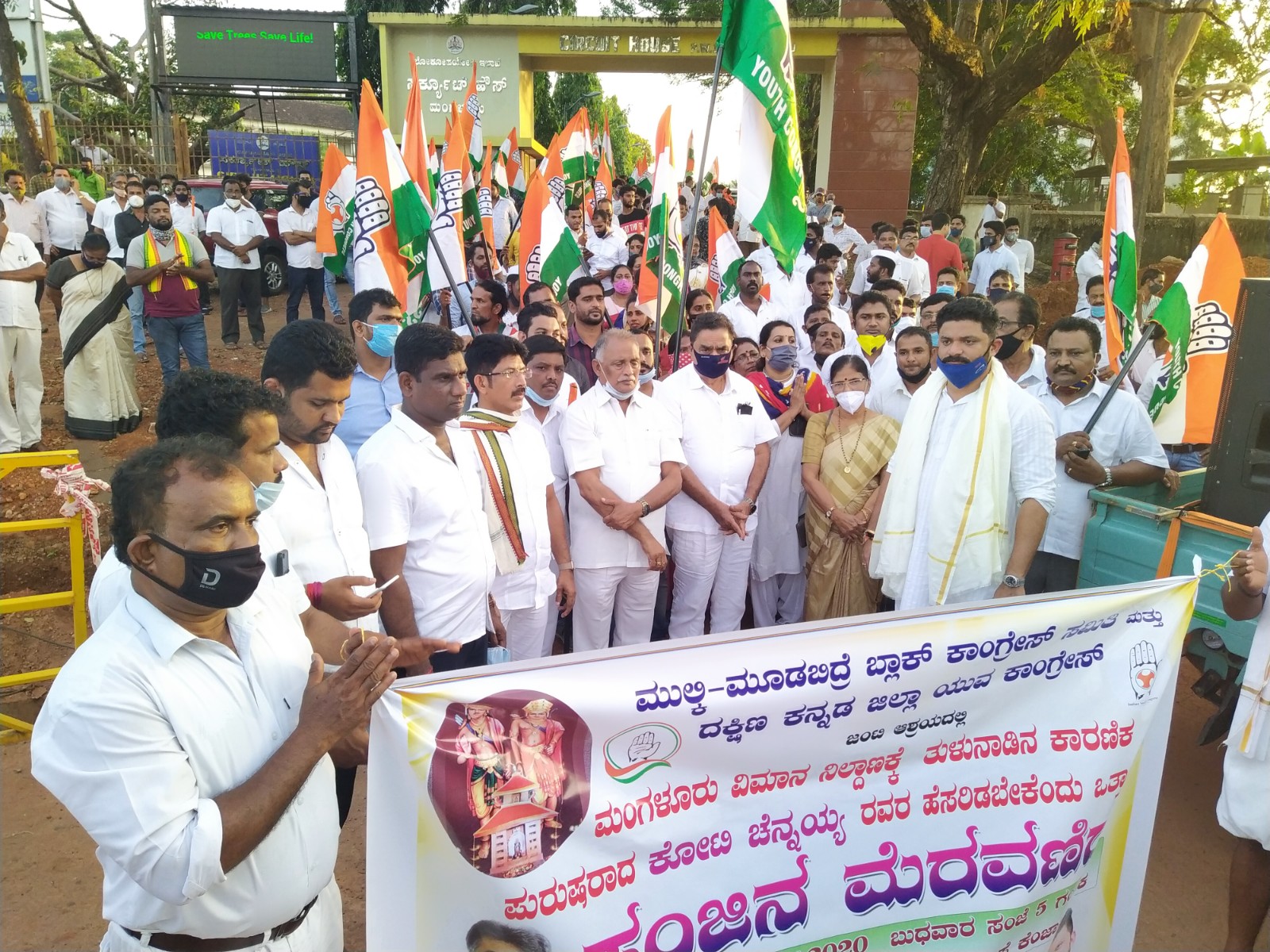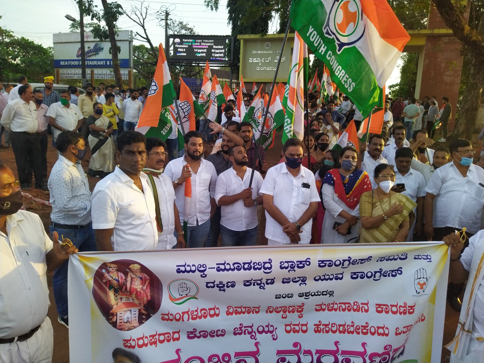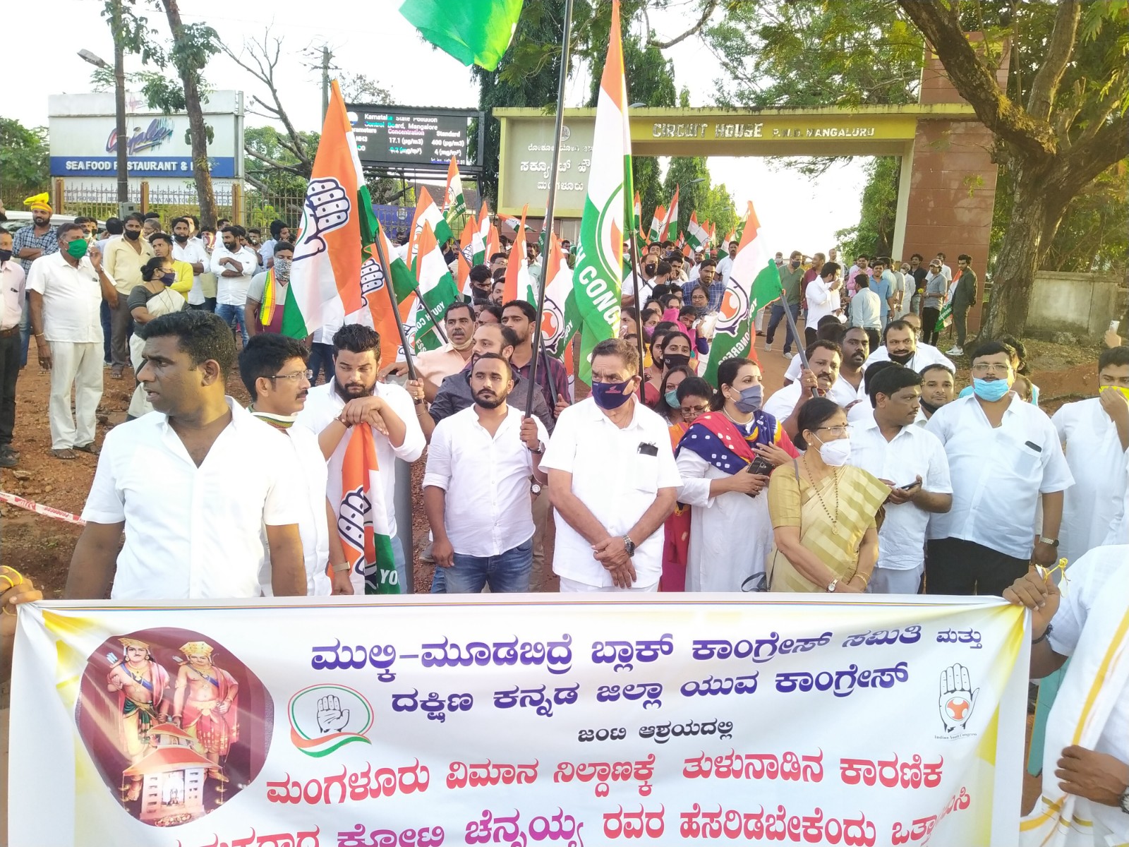 ಮಾಜಿ ಸಚಿವ ರಮಾನಾಥ ರೈ ಮಾತನಾಡಿ ದ.ಕ.ಜಿಲ್ಲೆಯ ಅಭಿವೃದ್ಧಿಗೆ ಕಾಂಗ್ರೆಸ್ ಪಕ್ಷದ, ಪಂಡಿತ್ ಜವಾಹರಲಾಲ್ ನೆಹರೂ, ಶ್ರೀನಿವಾಸ ಮಲ್ಯರ ಅವರ ಕೊಡುಗೆ ಅಪಾರ. ಇದೀಗ ಕೇಂದ್ರದಲ್ಲಿ ಅಧಿಕಾರದಲ್ಲಿರುವ ಬಿಜೆಪಿ ನೇತೃತ್ವದ ಎನ್ಡಿಎ ಸರಕಾರ ಜನಸಾಮಾನ್ಯರನ್ನು ಕಡೆಗಣಿಸಿ ಬಂಡವಾಳಶಾಹಿಗಳ ಪರ ಕೆಲಸ ಮಾಡುತ್ತಿದೆ. ಮಂಗಳೂರು ವಿಮಾನ ನಿಲ್ದಾಣದ ಹೆಸರು ಬದಲಾಯಿಸಿರುವುದು ಜಿಲ್ಲೆಯ ಜನತೆಗೆ ಮಾಡಿದ ಅವಮಾನವಾಗಿದೆ. ಈ ಹೆಸರನ್ನು ಕಿತ್ತು ಹಾಕುವವರೆಗೆ ಹೋರಾಟ ನಿಲ್ಲದು ಎಂದುರು.