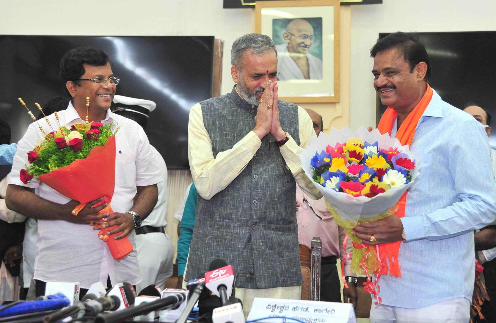 ಸೋಮವಾರ ವಿಧಾನಸೌಧದ ಮೂರನೇ ಮಹಡಿಯಲ್ಲಿರುವ ಸಮ್ಮೇಳನ ಸಭಾಂಗಣದಲ್ಲಿ ಏರ್ಪಡಿಸಿದ್ದ ಸರಳ ಸಮಾರಂಭದಲ್ಲಿ ವಿಧಾನಸಭೆ ಸ್ಪೀಕರ್ ವಿಶ್ವೇಶ್ವರ ಹೆಗಡೆ ಕಾಗೇರಿ ಅವರು ನೂತನ ಸದಸ್ಯರಾದ ಮುನಿರತ್ನ ಮತ್ತು ರಾಜೇಶ್ಗೌಡ ಅವರಿಗೆ ಪ್ರಮಾಣ ವಚನ ಬೋಧನೆ ಮಾಡಿದರು.