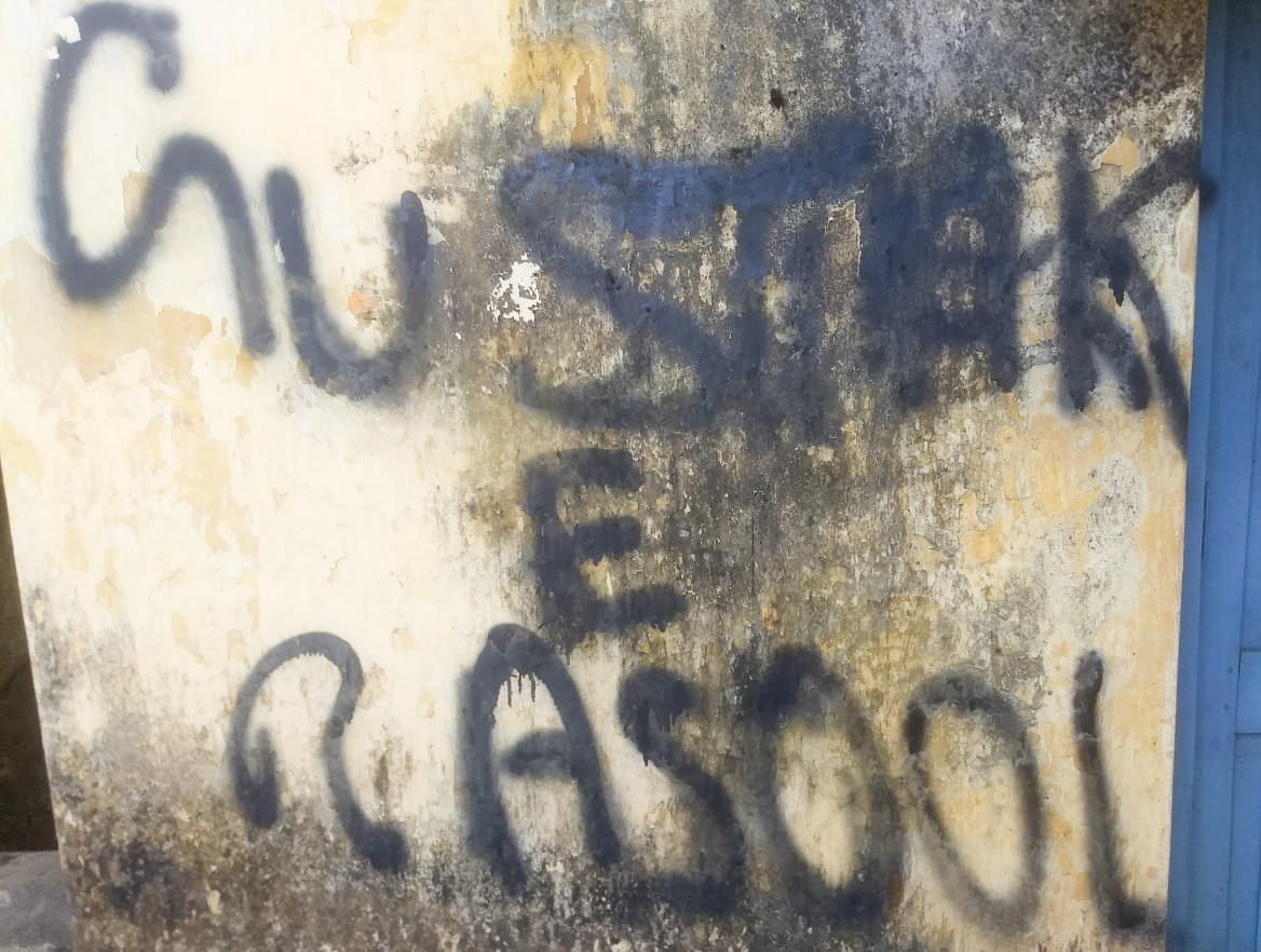 ಕೋರ್ಟ್ ಆವರಣದ ಜನರೇಟರ್ ಗೋಡೆಯ ಮೇಲೆ "Gustak e rasool ek hi saza tan say juda" ಎಂದು ಬರೆಯಲಾಗಿದೆ.