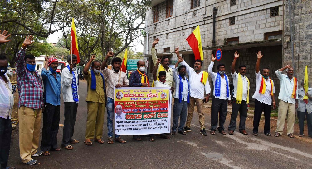 ಮಂಡ್ಯ, ಡಿ.5: ಮರಾಠ ಅಭಿವೃದ್ಧಿ ಪ್ರಾಧಿಕಾರ ರಚನೆ ಖಂಡಿಸಿ ಕನ್ನಡಪರ ಸಂಘಟನೆಗಳು ಶನಿವಾರ ಕರೆ ನೀಡಿದ್ದ ಕರ್ನಾಟಕ ಬಂದ್ ಹಿನ್ನೆಲೆಯಲ್ಲಿ ಜಿಲ್ಲೆಯಲ್ಲಿ ನಾನಾ ಸಂಘಟನೆಗಳ ಕಾರ್ಯಕರ್ತರು ಪ್ರತಿಭಟನೆ ನಡೆಸಿದರು.