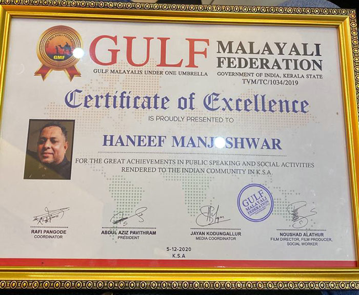ಸನ್ಮಾನ ಕಾರ್ಯಕ್ರಮದಲ್ಲಿ ಗಲ್ಫ್ ಮಲಯಾಳಿ ಫೆಡರೇಶನ್ ಇದರ ಅಧ್ಯಕ್ಷರಾದ ಅಬ್ದುಲ್ ಅಝೀಝ್ ಪವಿತ್ರಂ ಮತ್ತು ಸಂಯೋಜಕರಾದ ರಫೀ ಪಾಂಗೋಡು ಹಾಗೂ ಕಮಿಟಿಯ ಪದಾಧಿಕಾರಿಗಳು ಉಪಸ್ಥಿತರಿದ್ದರು.