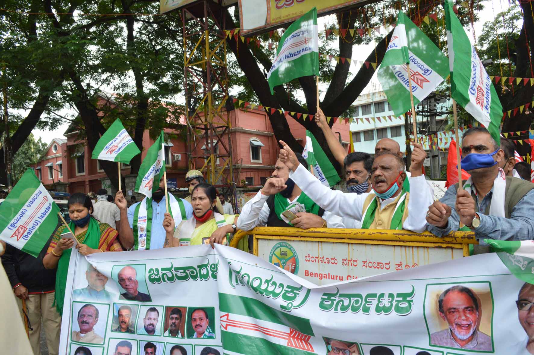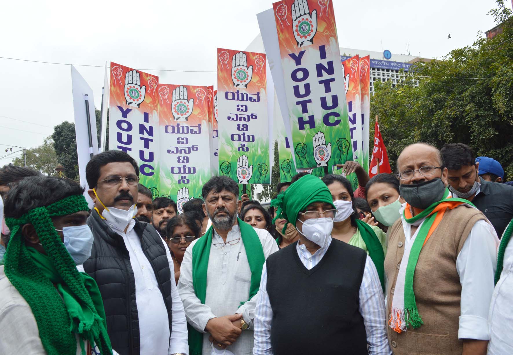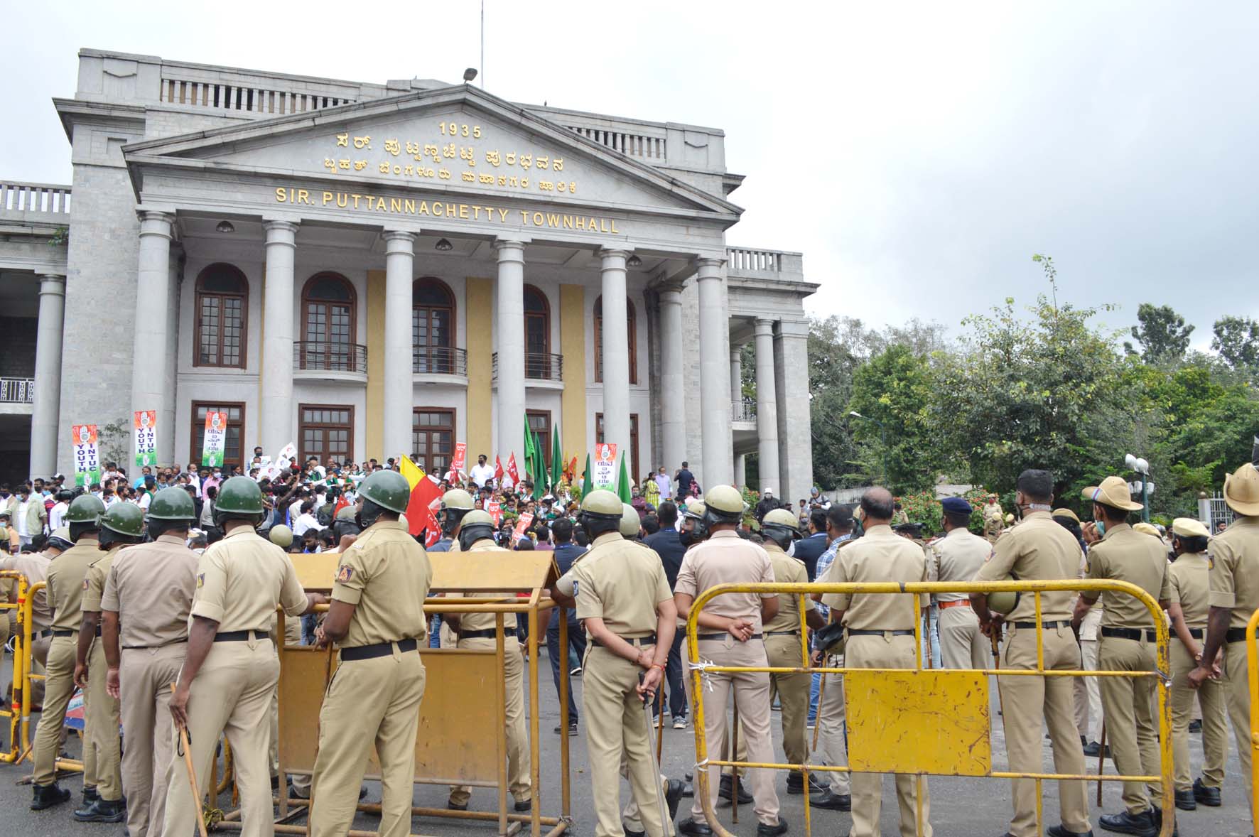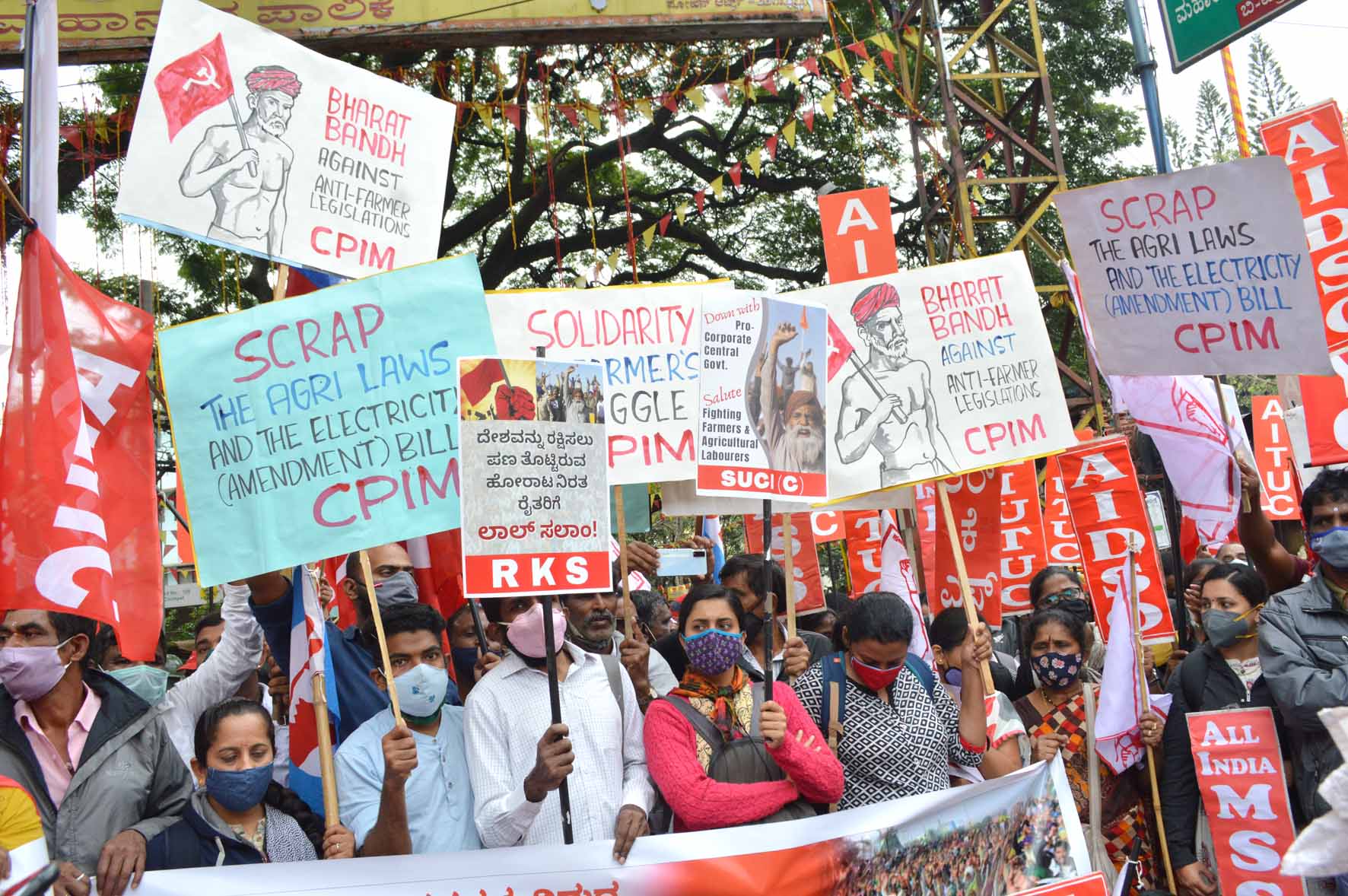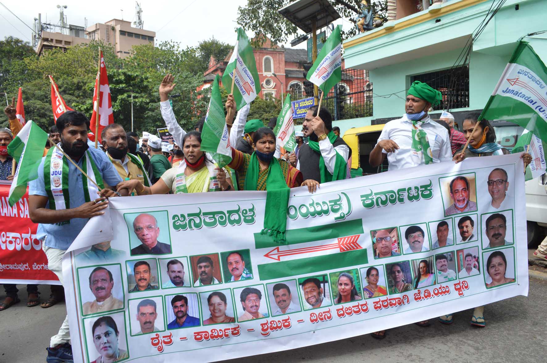 ಬೆಂಗಳೂರಿನ ಪುರಭವನ ಮುಂಭಾಗ ರಾಜ್ಯ ರೈತ ಸಂಘ ಮತ್ತು ಹಸಿರು ಸೇನೆ(ಕೋಡಿಹಳ್ಳಿ ಚಂದ್ರಶೇಖರ ಬಣ) ನೇತೃತ್ವದಲ್ಲಿ ಜಮಾಯಿಸಿದ ಪ್ರತಿಭಟನಾಕಾರರು, ರಸ್ತೆಯದ್ದಕ್ಕೂ ಮೆರವಣಿಗೆ ಸಾಗಿದರೆ, ಇಲ್ಲಿನ ಮೈಸೂರು ಬ್ಯಾಂಕ್ ಸರ್ಕಲ್ ಮತ್ತು ಫ್ರೀಡಂ ಪಾರ್ಕ್ ನಲ್ಲಿ ವಿವಿಧ ಸಂಘಟನೆಗಳ ಮುಖಂಡರು ಪ್ರತಿಭಟಿಸಿದರು. ಮುಖ್ಯವಾಗಿ ರೈತ, ದಲಿತ, ಕಾರ್ಮಿಕ, ಜನಪರ ಸಂಘಟನೆಗಳ ಐಕ್ಯ ಹೋರಾಟ ಸಮಿತಿ ಕುರುಬೂರು ಶಾಂತಕುಮಾರ್ ಮತ್ತು ಬಡಗಲಪುರ ನಾಗೇಂದ್ರ ನೇತೃತ್ವದಲ್ಲಿ ಮೌರ್ಯ ವೃತ್ತದ ಗಾಂಧಿ ಪ್ರತಿಮೆ ಎದುರು ಬೃಹತ್ ಪ್ರತಿಭಟನೆ ರೂಪಗೊಂಡಿತ್ತು.