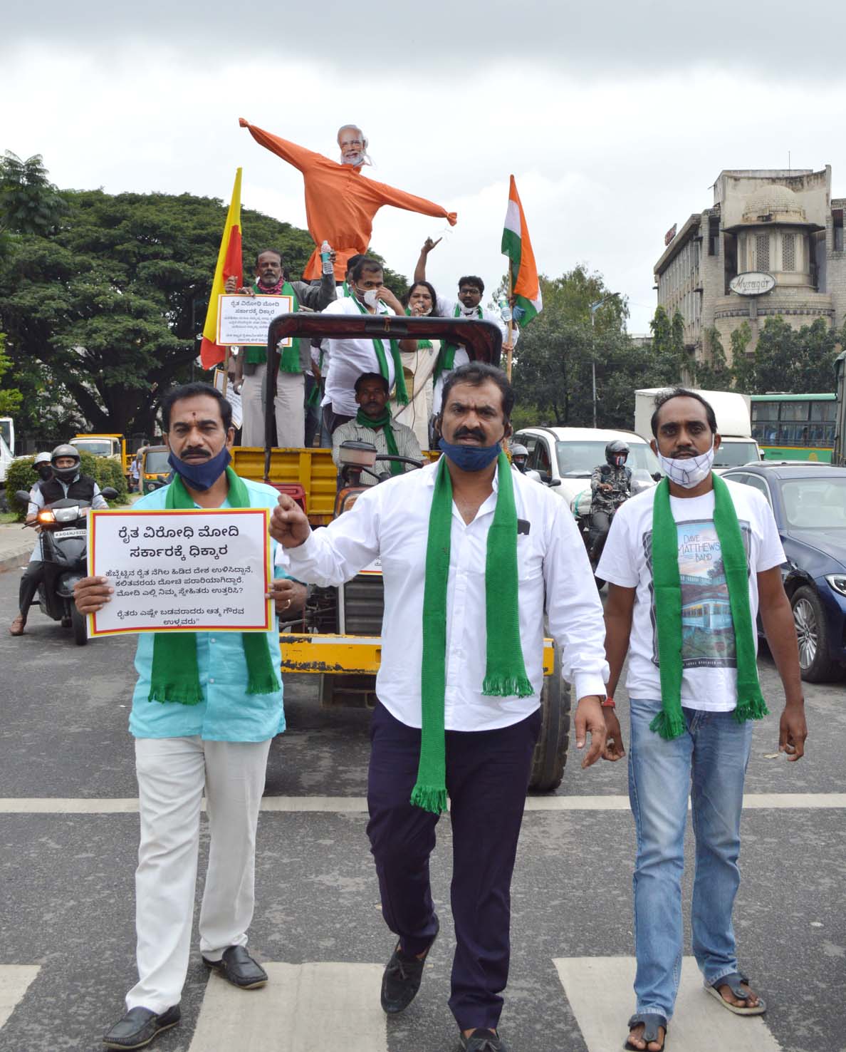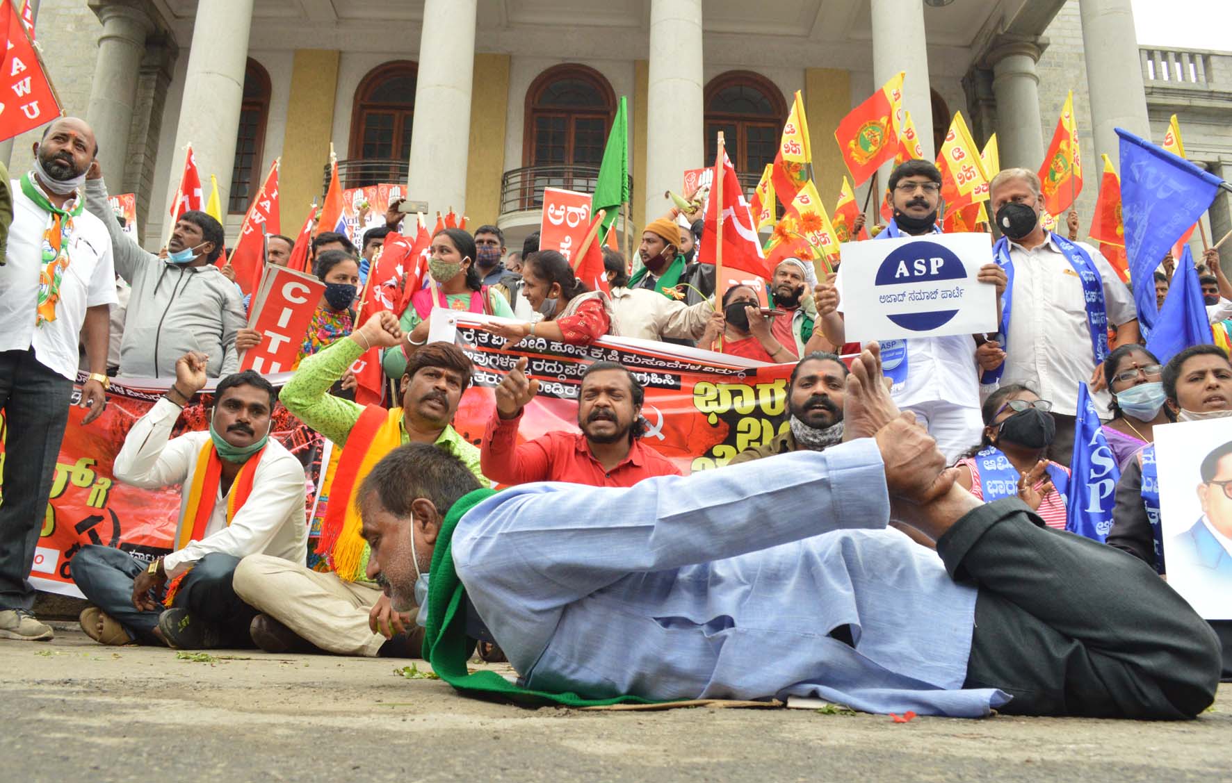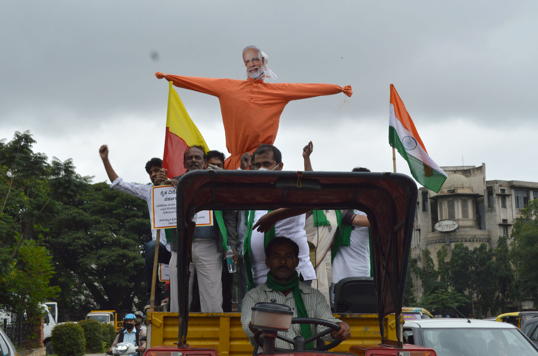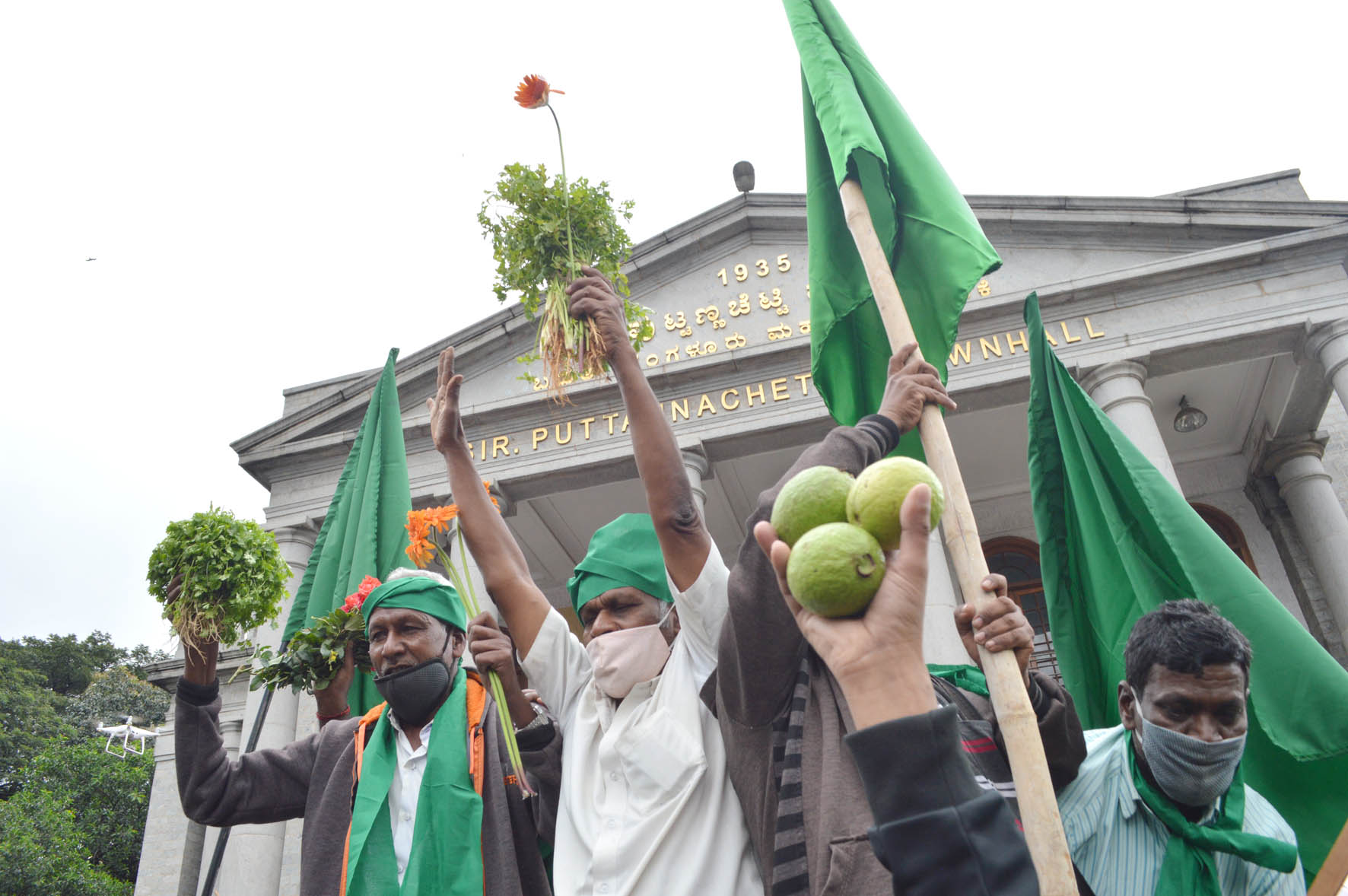 ಬೆಂಗಳೂರಿನ ಪುರಭವನ ಮುಂಭಾಗ ರಾಜ್ಯ ರೈತ ಸಂಘ ಮತ್ತು ಹಸಿರು ಸೇನೆ(ಕೋಡಿಹಳ್ಳಿ ಚಂದ್ರಶೇಖರ ಬಣ) ನೇತೃತ್ವದಲ್ಲಿ ಜಮಾಯಿಸಿದ ಪ್ರತಿಭಟನಾಕಾರರು, ರಸ್ತೆಯದ್ದಕ್ಕೂ ಮೆರವಣಿಗೆ ಸಾಗಿದರೆ, ಇಲ್ಲಿನ ಮೈಸೂರು ಬ್ಯಾಂಕ್ ಸರ್ಕಲ್ ಮತ್ತು ಫ್ರೀಡಂ ಪಾರ್ಕ್ ನಲ್ಲಿ ವಿವಿಧ ಸಂಘಟನೆಗಳ ಮುಖಂಡರು ಪ್ರತಿಭಟಿಸಿದರು. ಮುಖ್ಯವಾಗಿ ರೈತ, ದಲಿತ, ಕಾರ್ಮಿಕ, ಜನಪರ ಸಂಘಟನೆಗಳ ಐಕ್ಯ ಹೋರಾಟ ಸಮಿತಿ ಕುರುಬೂರು ಶಾಂತಕುಮಾರ್ ಮತ್ತು ಬಡಗಲಪುರ ನಾಗೇಂದ್ರ ನೇತೃತ್ವದಲ್ಲಿ ಮೌರ್ಯ ವೃತ್ತದ ಗಾಂಧಿ ಪ್ರತಿಮೆ ಎದುರು ಬೃಹತ್ ಪ್ರತಿಭಟನೆ ರೂಪಗೊಂಡಿತ್ತು.