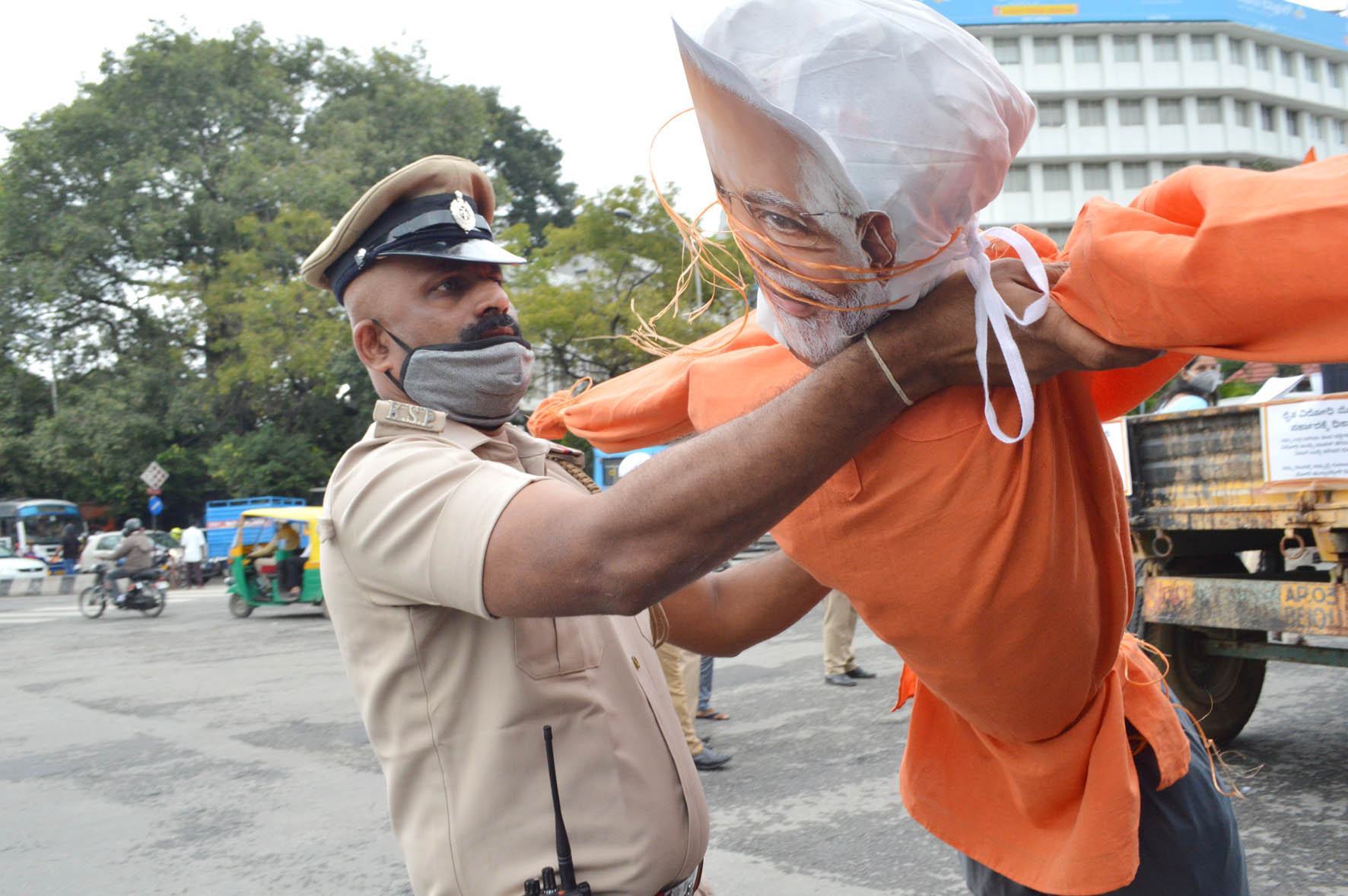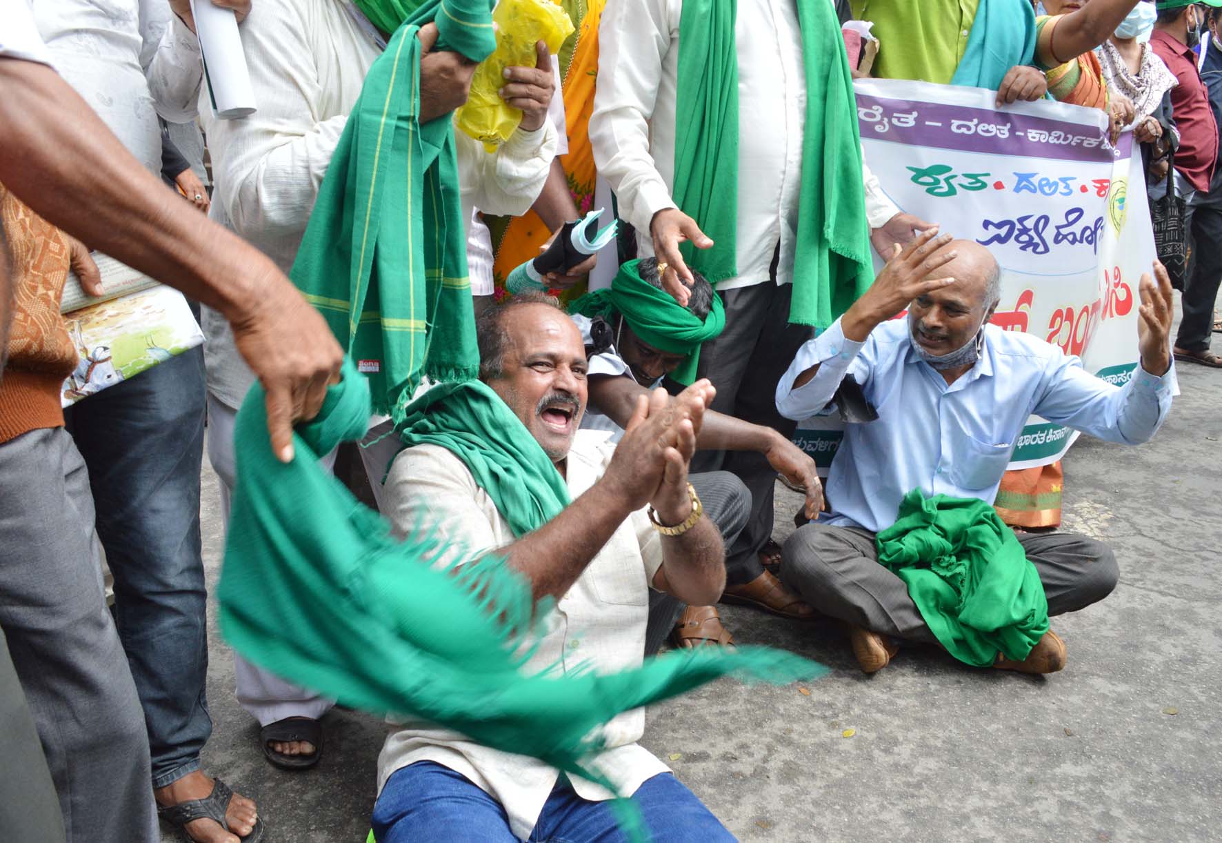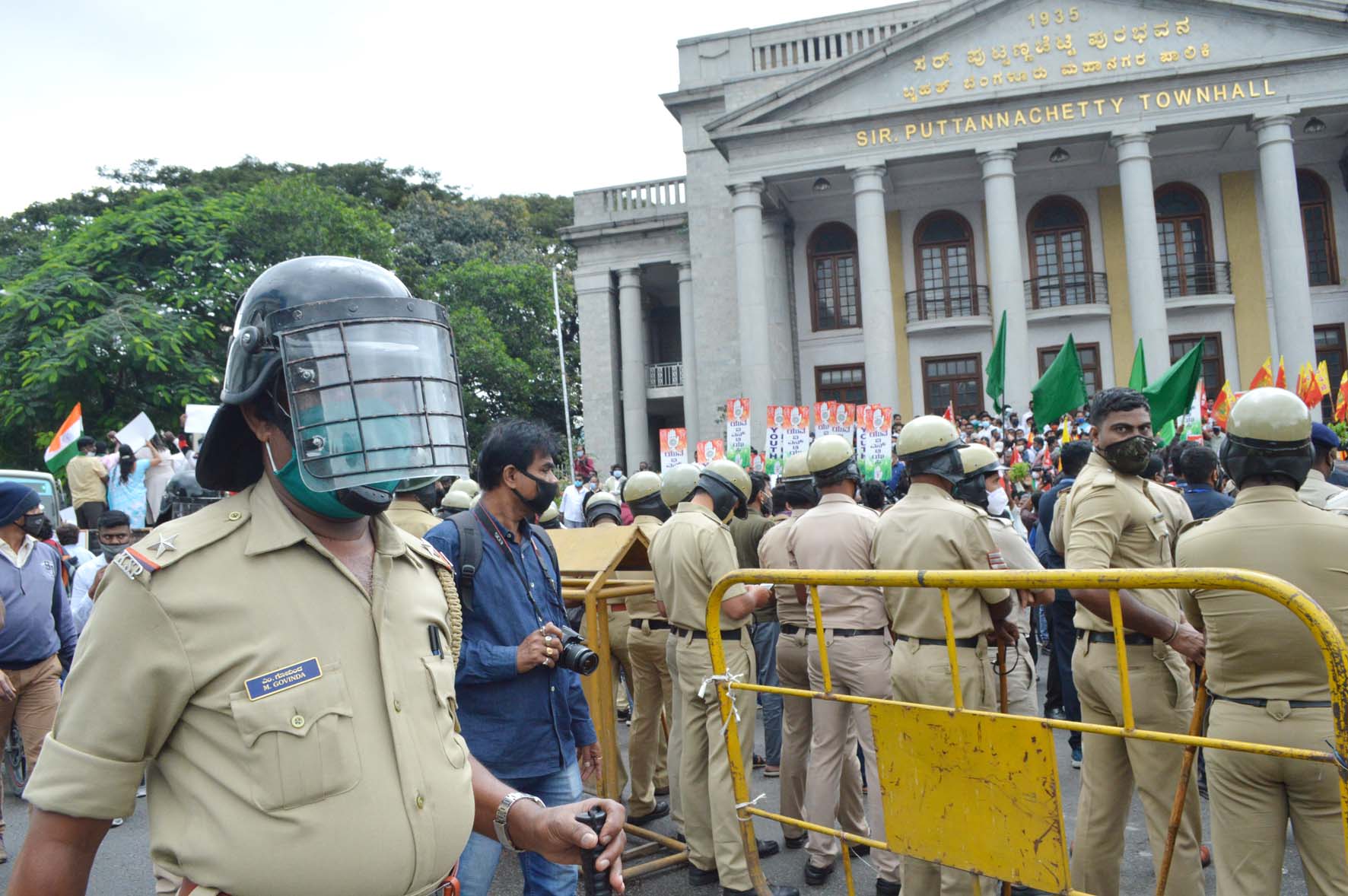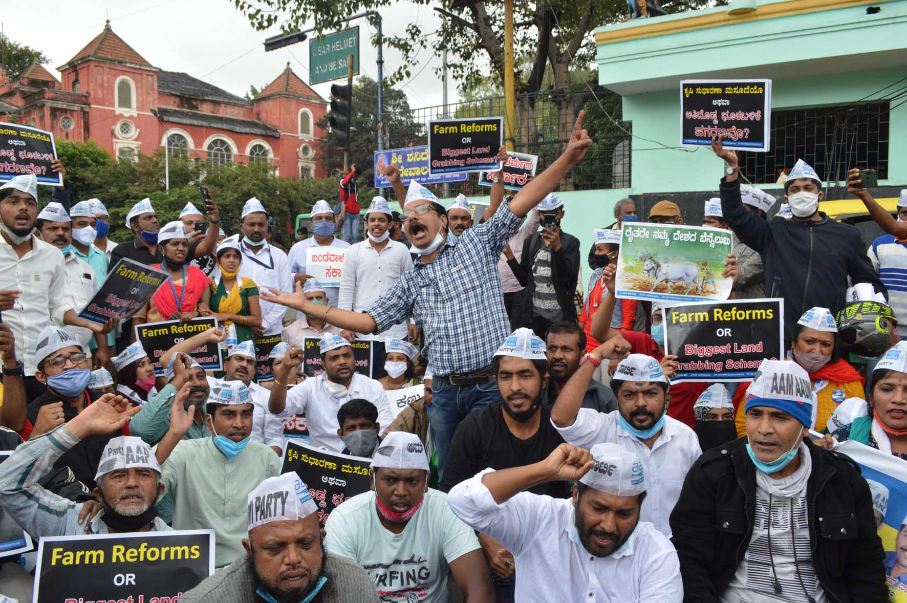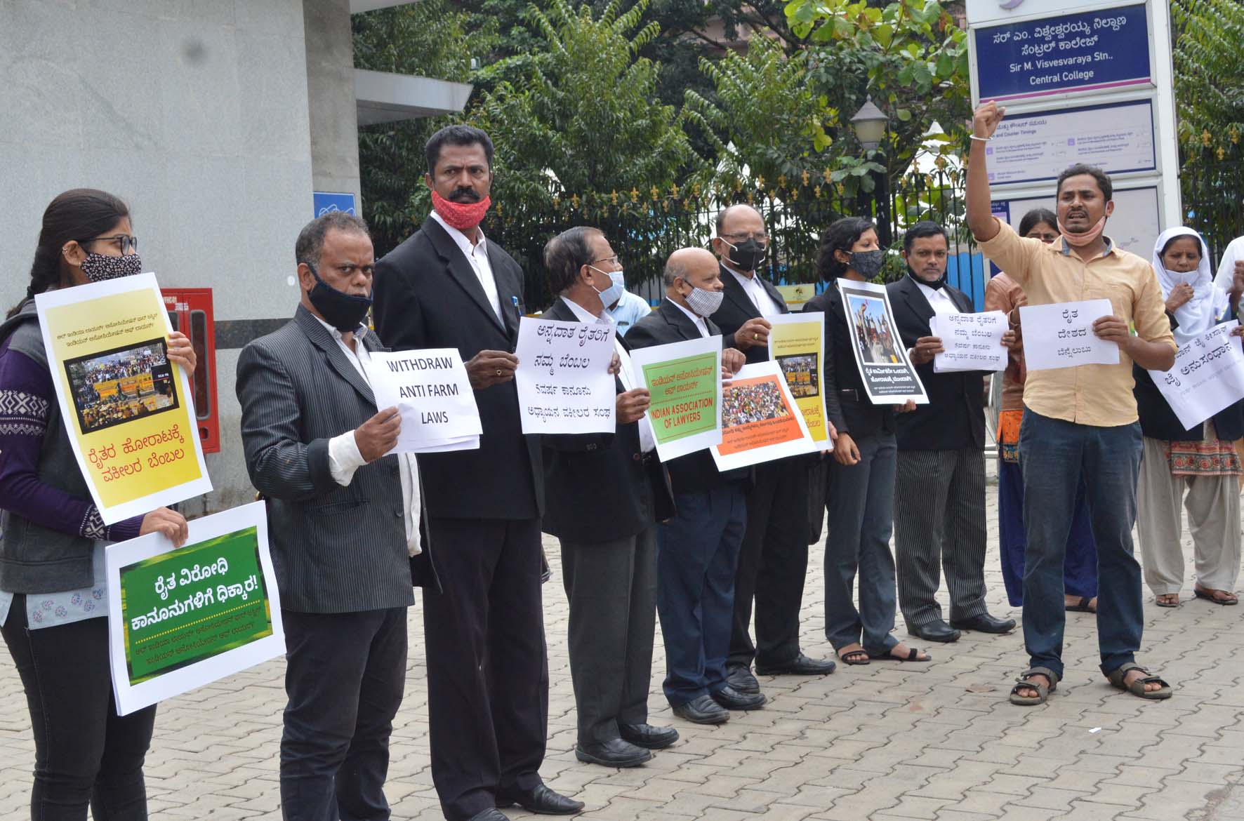 ಬೆಂಗಳೂರಿನ ಪುರಭವನ ಮುಂಭಾಗ ರಾಜ್ಯ ರೈತ ಸಂಘ ಮತ್ತು ಹಸಿರು ಸೇನೆ(ಕೋಡಿಹಳ್ಳಿ ಚಂದ್ರಶೇಖರ ಬಣ) ನೇತೃತ್ವದಲ್ಲಿ ಜಮಾಯಿಸಿದ ಪ್ರತಿಭಟನಾಕಾರರು, ರಸ್ತೆಯದ್ದಕ್ಕೂ ಮೆರವಣಿಗೆ ಸಾಗಿದರೆ, ಇಲ್ಲಿನ ಮೈಸೂರು ಬ್ಯಾಂಕ್ ಸರ್ಕಲ್ ಮತ್ತು ಫ್ರೀಡಂ ಪಾರ್ಕ್ ನಲ್ಲಿ ವಿವಿಧ ಸಂಘಟನೆಗಳ ಮುಖಂಡರು ಪ್ರತಿಭಟಿಸಿದರು. ಮುಖ್ಯವಾಗಿ ರೈತ, ದಲಿತ, ಕಾರ್ಮಿಕ, ಜನಪರ ಸಂಘಟನೆಗಳ ಐಕ್ಯ ಹೋರಾಟ ಸಮಿತಿ ಕುರುಬೂರು ಶಾಂತಕುಮಾರ್ ಮತ್ತು ಬಡಗಲಪುರ ನಾಗೇಂದ್ರ ನೇತೃತ್ವದಲ್ಲಿ ಮೌರ್ಯ ವೃತ್ತದ ಗಾಂಧಿ ಪ್ರತಿಮೆ ಎದುರು ಬೃಹತ್ ಪ್ರತಿಭಟನೆ ರೂಪಗೊಂಡಿತ್ತು.