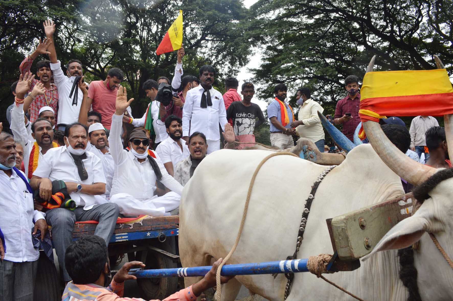 ನಗರದ ಮೈಸೂರು ಬ್ಯಾಂಕ್ ವೃತ್ತದಿಂದ ಕೆಂಪೇಗೌಡ ಬಸ್ ನಿಲ್ದಾಣದವರೆಗೆ ಎತ್ತಿನಗಾಡಿ ಮೂಲಕ ಕನ್ನಡ ಸಂಘಟನೆಗಳ ಒಕ್ಕೂಟದ ವತಿಯಿಂದ ವಾಟಾಳ್ ನಾಗರಾಜ್, ಸಾ.ರಾ. ಗೋವಿಂದ್ ನೇತೃತ್ವದಲ್ಲಿ ವಿನೂತನ ಪ್ರತಿಭಟನೆ ನಡೆಸಲಾಯಿತು.