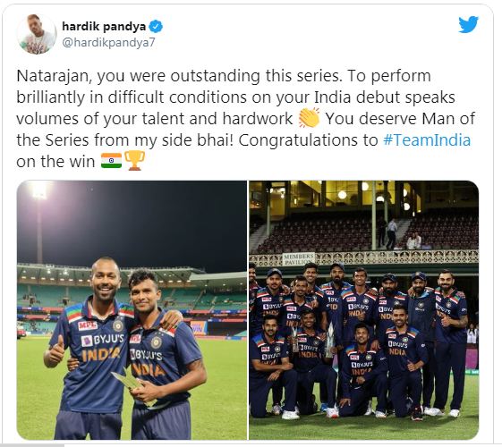 ಸರಣಿ ಶ್ರೇಷ್ಠ ಪ್ರಶಸ್ತಿಯನ್ನು ಹಾರ್ದಿಕ್ ಪಾಂಡ್ಯ ಅವರು ನಟರಾಜನ್ ಗೆ ಹಂಚುವ ಚಿತ್ರವನ್ನು ಸ್ವತ: ಹಾರ್ದಿಕ್ ಪಾಂಡ್ಯ ಅವರೇ ಟ್ವಿಟರ್ ಖಾತೆಯಲ್ಲಿ ಹಂಚಿದ್ದಾರೆ. ಅಲ್ಲದೆ ಟೀಮ್ ಇಂಡಿಯಾ ಅಭಿಮಾನಿಗಳಿಂದ ವ್ಯಾಪಕ ಮನ್ನಣೆಗೆ ಪಾತ್ರವಾಗಿದೆ.