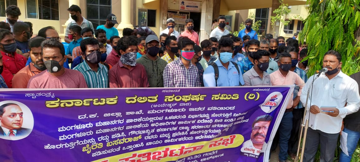 ದಲಿತ ಸಂಘರ್ಷ ಸಮಿತಿ (ಅಂಬೇಡ್ಕರ್ವಾದ) ನೇತೃತ್ವದಲ್ಲಿ ಜರುಗಿದ ಪ್ರತಿಭಟನೆಯಲ್ಲಿ, ಸಮಿತಿ ಜಿಲ್ಲಾ ಸಂಚಾಲಕ ಜಗದೀಶ್ ಪಾಂಡೇಶ್ವರ, ಹೊರಗುತ್ತಿಗೆಯಿಂದಾಗಿ ಕಾರ್ಮಿಕರು ಅನುಭವಿಸುತ್ತಿರುವ ಸಮಸ್ಯೆಗಳನ್ನು ಕಾರ್ಮಿಕರ ಗಮನಕ್ಕೆ ತಂದರೂ, ಬೇಡಿಕೆ ಈಡೇರಿಲ್ಲ. ಅಧಿಕಾರಿಗಳು ಮತ್ತು ಗುತ್ತಿಗೆದಾರರು ಶಾಮೀಲಾಗಿ ಗುತ್ತಿಗೆ ಪದ್ಧತಿಯನ್ನು ಮುಂದುವರಿಸುತ್ತಿದ್ದು, ಪೌರಾಡಳಿತ ನಿರ್ದೇಶನಾಲಯ ಲೋಡರ್ಸ್, ಕ್ಲೀನರ್ಸ್ ಮತ್ತು ಯುಜಿಡಿ ಹೆಲ್ಪರ್ಸ್ ಸ್ಥಾನಗಳನ್ನು ಭರ್ತಿಮಾಡಲು ವಿಶೇಷ ನೇಮಕಾತಿ ನಿಯಮಾವಳಿ ಪ್ರಕಟಿಸಿದರೂ ಪಾಲಿಕೆ ಕಳುಹಿಸುವಲ್ಲಿ ಹಿಂದೇಟು ಹಾಕಿದೆ ಎಂದವರು ಆರೋಪಿಸಿದರು.