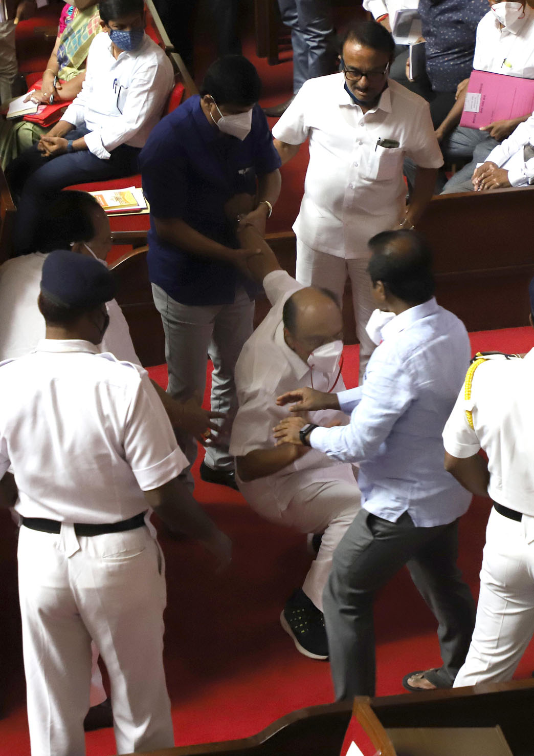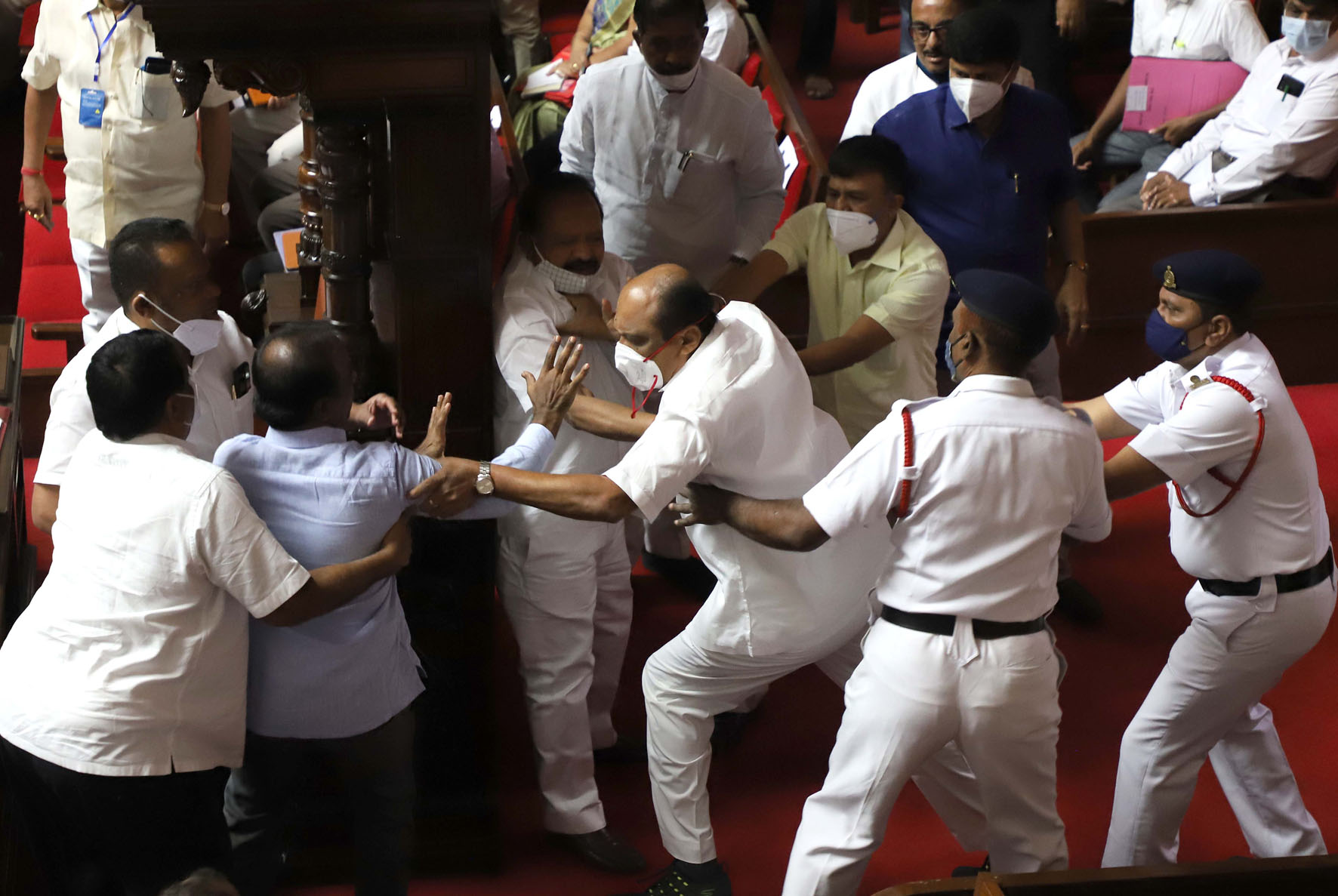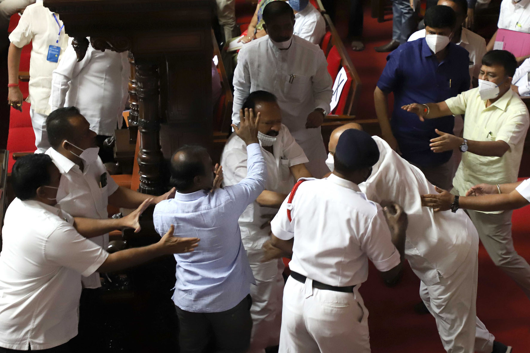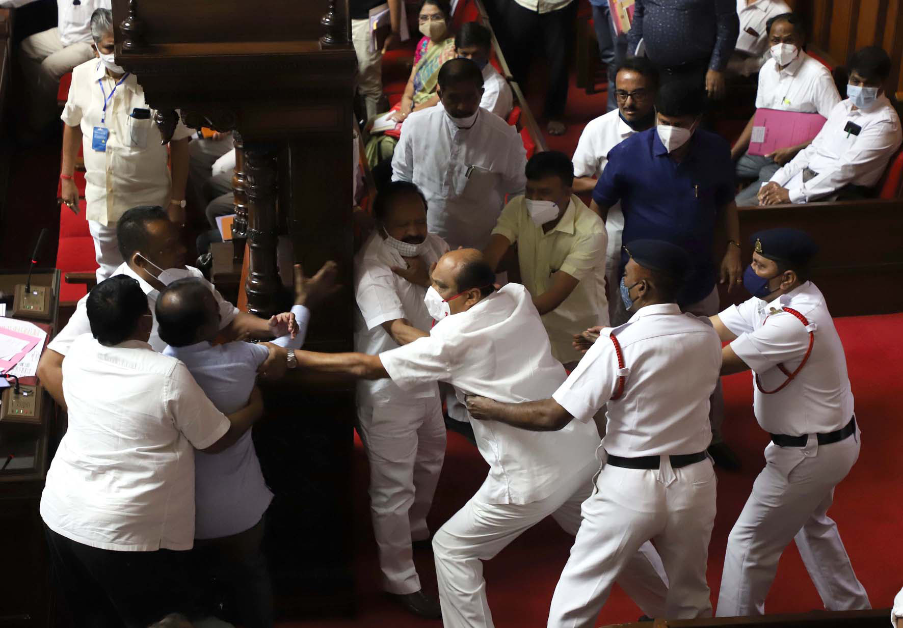 ಅಲ್ಲದೆ, ಮುಚ್ಚಿದ್ದ ಸಭಾಪತಿ ಆಗಮಿಸುವ ದ್ವಾರವನ್ನು ತೆರೆಯಲು ಮುಂದಾದ ಹಿನ್ನೆಲೆಯಲ್ಲಿ ಆಡಳಿತಾರೂಢ ಬಿಜೆಪಿ ಹಾಗೂ ಪ್ರತಿಪಕ್ಷ ಕಾಂಗ್ರೆಸ್ ಸದಸ್ಯರ ನಡುವೆ ಜಟಾಪಟಿ ನಡೆಯಿತು. ಈ ವೇಳೆ ಎನ್.ರವಿಕುಮಾರ್, ಕಾಂಗ್ರೆಸ್ ಸದಸ್ಯರ ಹರಿಶ್ ಅವರನ್ನು ಬಲವಾಗಿ ತಳ್ಳಿದ್ದರಿಂದ ಅವರು ಕೆಳಗೆ ಬಿದ್ದರು. ಅಲ್ಲದೆ, ಕಾಂಗ್ರೆಸ್ನ ನಾರಾಯಣಸ್ವಾಮಿ ಹಾಗೂ ಬಿಜೆಪಿಯ ವೈ.ಎ.ನಾರಾಯಣಸ್ವಾಮಿಯ ಮಧ್ಯೆಯೂ ಪರಸ್ಪರ ಜಪಟಾಪಟಿ, ಅವಾಚ್ಯ ಶಬ್ದಗಳಿಂದಲೂ ನಿಂದನೆ ಮಾಡಿದ್ದು ನಡೆಯಿತು.