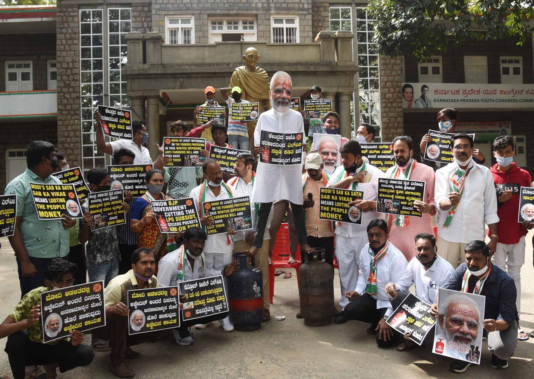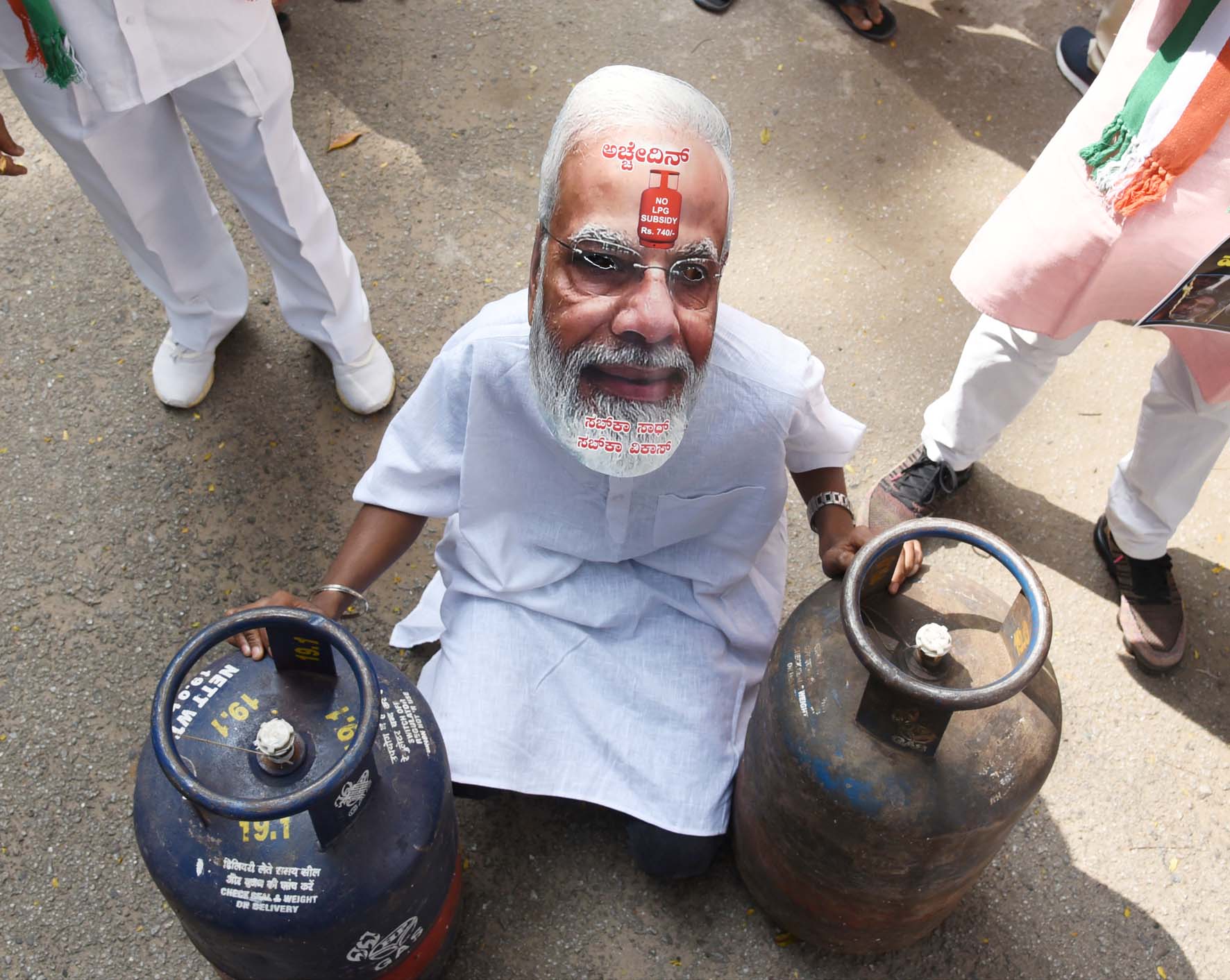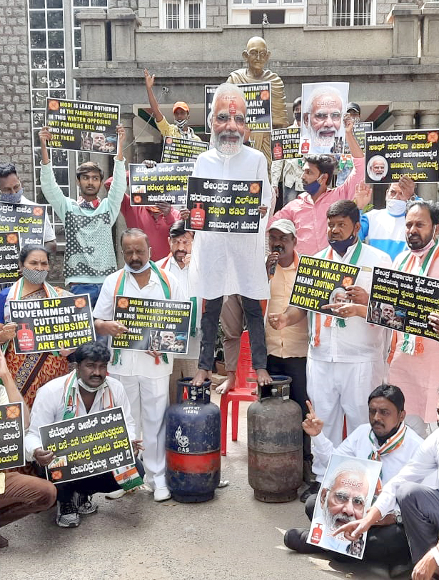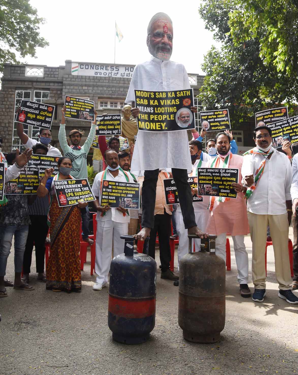 ಬೆಂಗಳೂರು: ಎಲ್ಪಿಜಿ ಸಬ್ಸಿಡಿ ಕಡಿತ ವಿರೋಧಿಸಿ ಕಾಂಗ್ರೆಸ್ ವಿನೂತನ ಪ್ರತಿಭಟನೆ