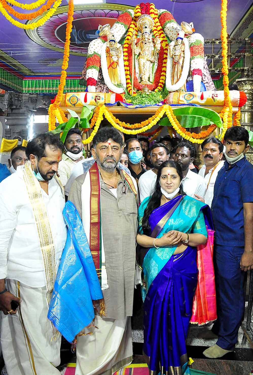 ಇದೇ ವೇಳೆ ಕೆಪಿಸಿಸಿ ಅಧ್ಯಕ್ಷ ಡಿ.ಕೆ.ಶಿವಕುಮಾರ್ ಅವರು ಪತ್ನಿ ಉಷಾ ಅವರೊಂದಿಗೆ ಮಹಾಲಕ್ಷ್ಮಿ ಲೇಔಟ್ನಲ್ಲಿರುವ ಇಸ್ಕಾನ್ ಶ್ರೀ ಕೃಷ್ಣ ದೇಗುಲಕ್ಕೆ ಭೇಟಿ ನೀಡಿ ದೇವರ ದರ್ಶನ ಪಡೆದರು. ಈ ವೇಳೆ ಇಸ್ಕಾನ್ನ ನವೀನ್ ನೀರದ ದಾಸ್, ಮಧುಪಂಡಿತ್ ದಾಸ್, ಚಂಚಲಪತಿ ದಾಸ್ ಸೇರಿದಂತೆ ಇನ್ನಿತರರು ಹಾಜರಿದ್ದರು.