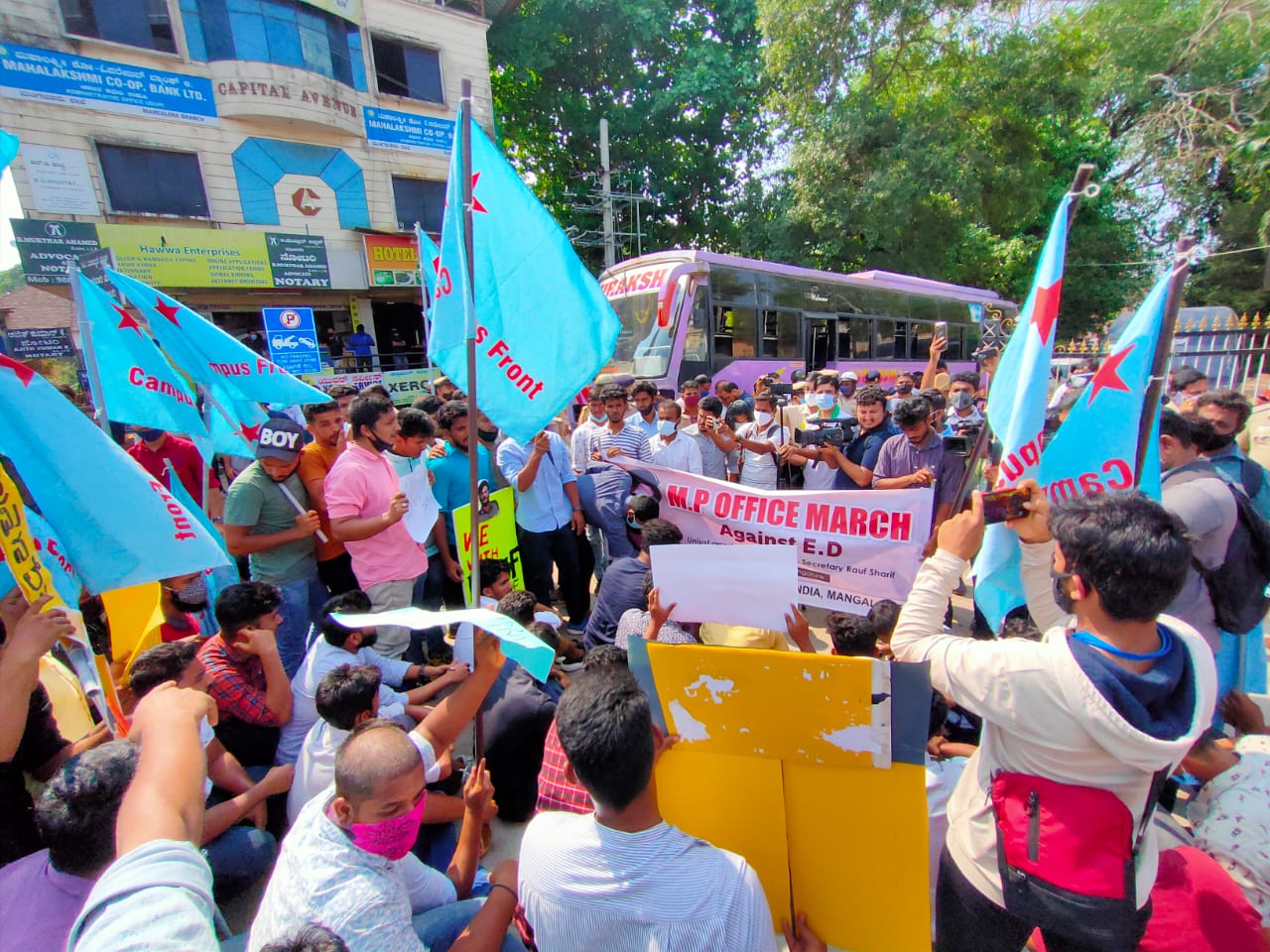 ಮಂಗಳೂರು, ಡಿ.26: ಕ್ಯಾಂಪಸ್ ಫ್ರಂಟ್ ರಾಷ್ಟ್ರೀಯ ಪ್ರಧಾನ ಕಾರ್ಯದರ್ಶಿ ರವೂಫ್ ಶರೀಫ್ ಅವರನ್ನು ಈಡಿ ಮೂಲಕ ಬಂಧಿಸಿರುವ ಕ್ರಮವನ್ನು ಖಂಡಿಸಿ ಸಿಎಫ್ಐ ಕಾರ್ಯಕರ್ತರು ದ.ಕ.ಲೋಕಸಭಾ ಸಂಸದ ನಳಿನ್ ಕುಮಾರ್ ಕಟೀಲ್ ಅವರ ಕಚೇರಿಗೆ ಮುತ್ತಿಗೆ ಹಾಕಲು ಯತ್ನಿಸಿದ ಘಟನೆ ಶನಿವಾರ ನಡೆದಿದೆ.