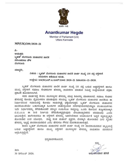ರಸ್ತೆಗಳಿಗೆ ಮುಸ್ಲಿಮರ ಹೆಸರಿಟ್ಟರೆ ಕೋಮು ಸಾಮರಸ್ಯಕ್ಕೆ ಧಕ್ಕೆ: ತೇಜಸ್ವಿ ಸೂರ್ಯ, ಅನಂತಕುಮಾರ ಹೆಗಡೆ ಆಕ್ಷೇಪ