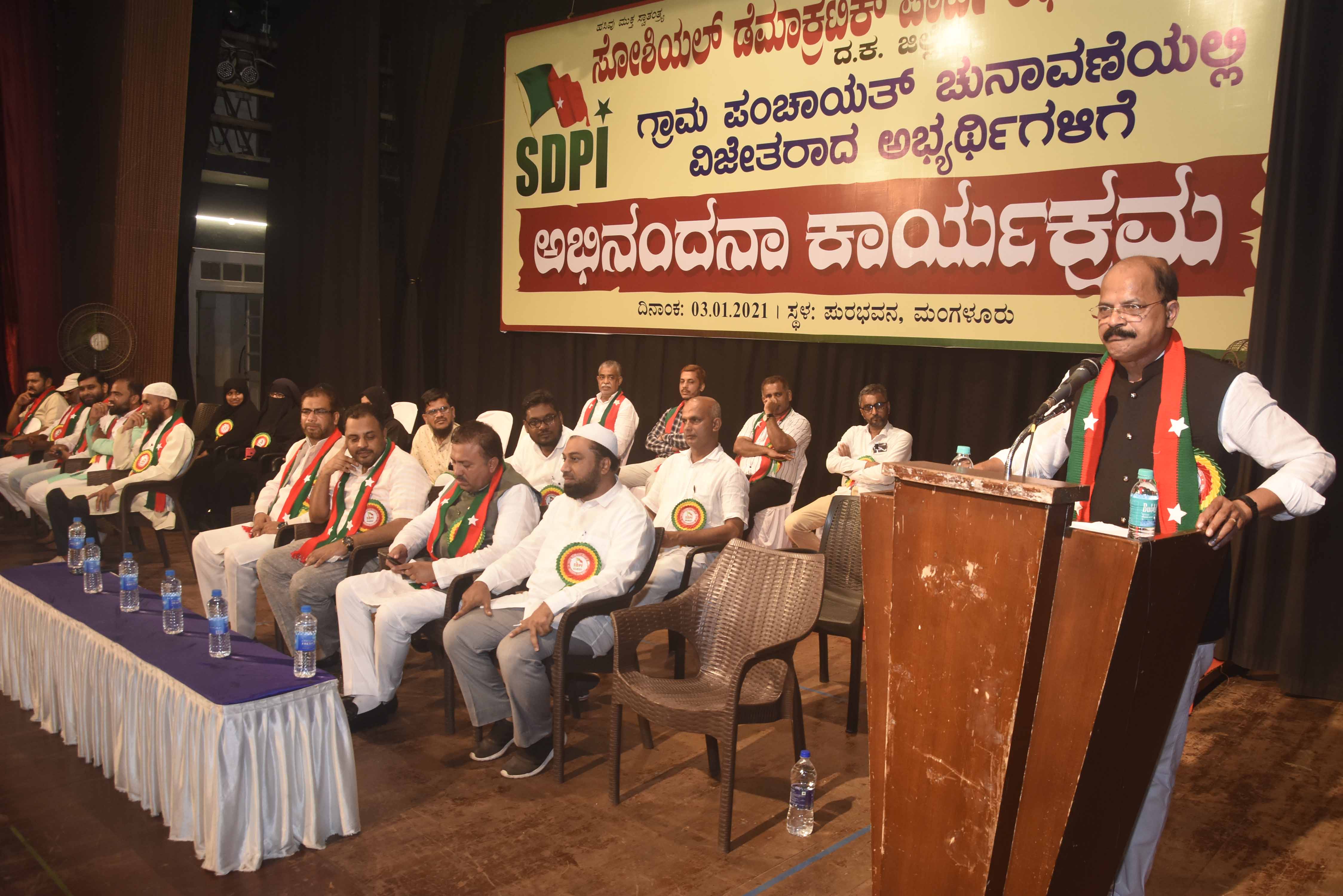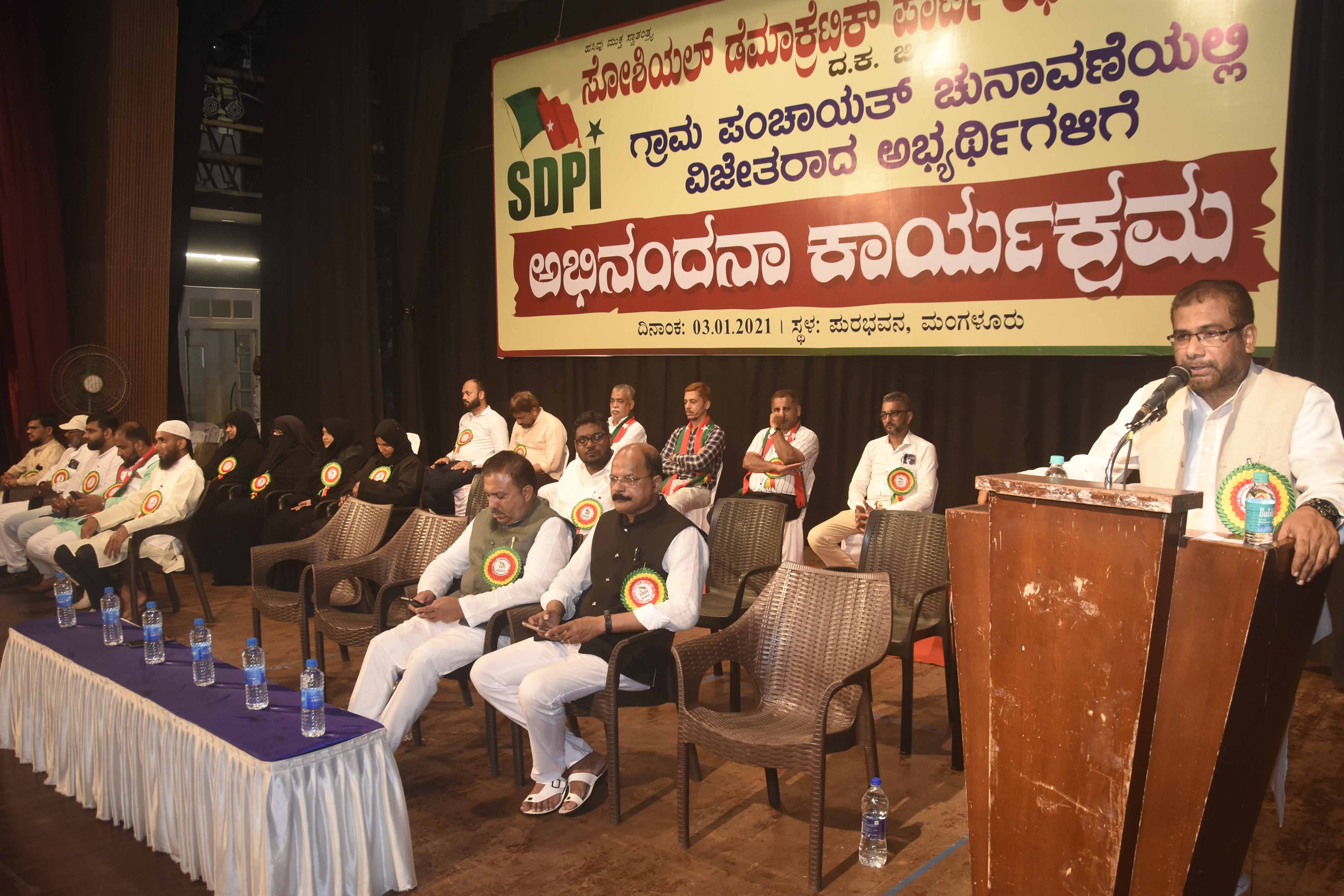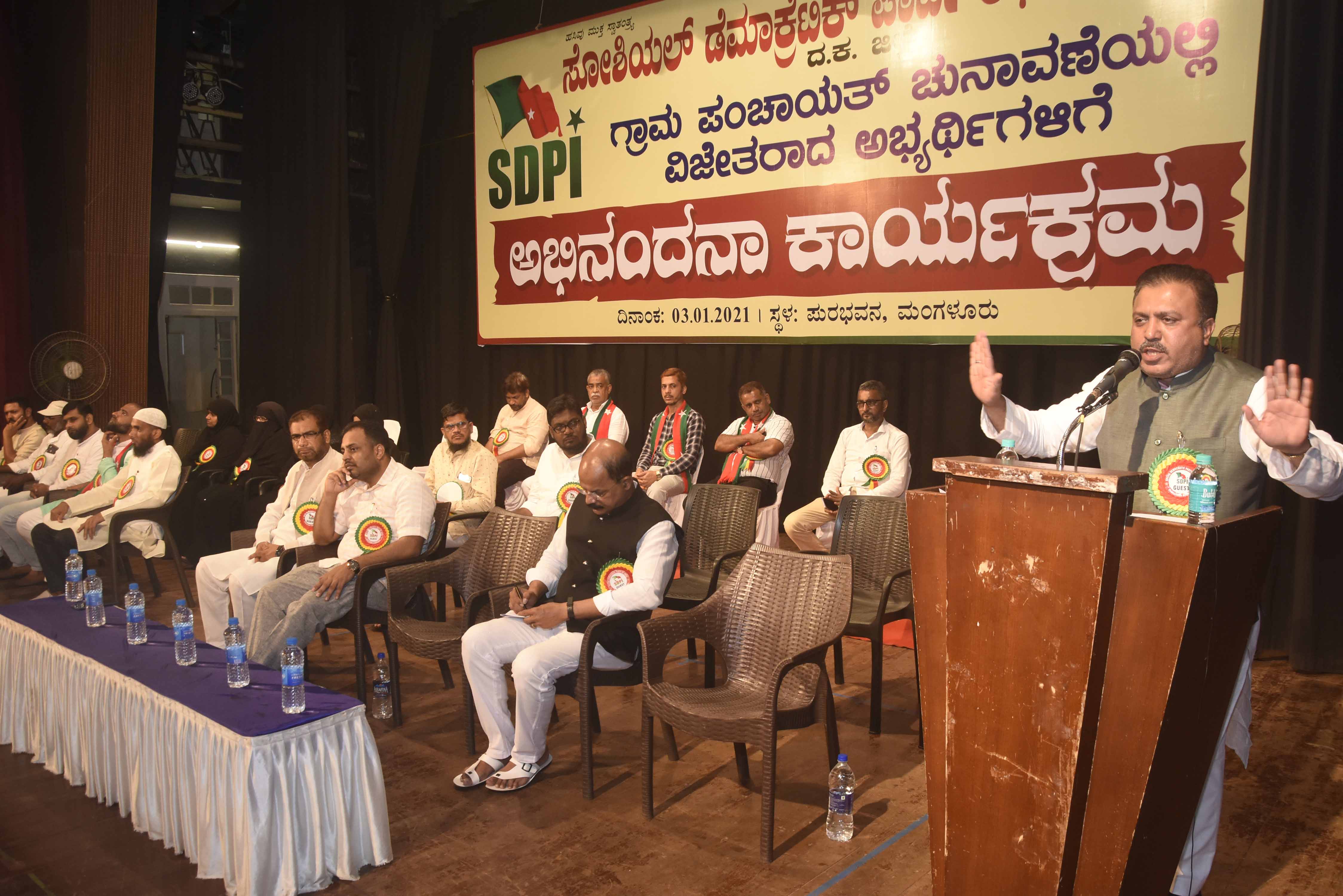 ಗ್ರಾಪಂ ಚುನಾವಣೆಯಲ್ಲಿ ವಿಜೇತರಾದ ಎಸ್ಡಿಪಿಐ ಬೆಂಬಲಿತ ಅಭ್ಯರ್ಥಿಗಳಿಗೆ ಪಕ್ಷದ ದ.ಕ. ಜಿಲ್ಲಾ ಸಮಿತಿಯ ವತಿಯಿಂದ ನಗರದ ಪುರಭವನದಲ್ಲಿ ರವಿವಾರ ನಡೆದ ಅಭಿನಂದನಾ ಕಾರ್ಯಕ್ರಮದಲ್ಲಿ ಅವರು ದಿಕ್ಸೂಚಿ ಭಾಷಣಗೈದರು.