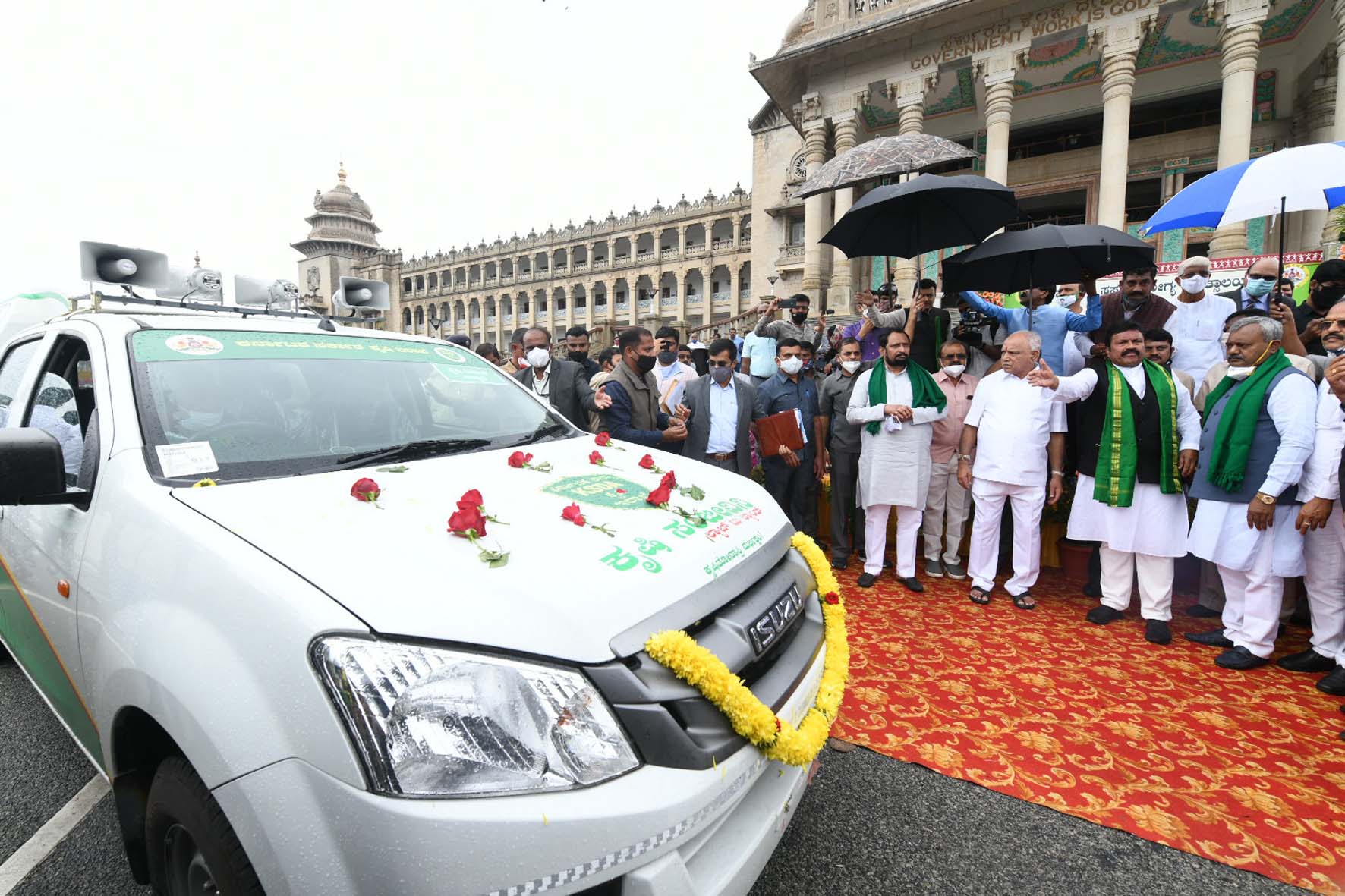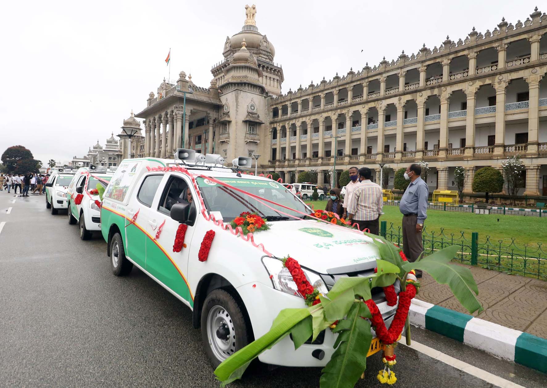 ಗುರುವಾರ ವಿಧಾನಸೌಧದ ವೈಭವೋಪೇತ ಮೆಟ್ಟಿಲುಗಳ ಬಳಿ ಕೃಷಿ ಇಲಾಖೆಯಿಂದ ಏರ್ಪಡಿಸಿದ್ದ ಕಾರ್ಯಕ್ರಮದಲ್ಲಿ ನೂತನ ವಾಹನಗಳಿಗೆ ಹಸಿರು ನಿಶಾನೆ ತೋರಿಸಿದ ಬಳಿಕ ಮಾತನಾಡಿದ ಅವರು, ‘ರೈತರ ಹೊಲಗಳಿಗೆ ಹೋಗಿ ಮಣ್ಣು, ನೀರು, ರೋಗ ಪರೀಕ್ಷೆ ಮಾಡುವ ವಾಹನವಿದು. 40 ವಾಹನಗಳನ್ನು ಲೋಕಾರ್ಪಣೆ ಮಾಡಿದ್ದು, ಇವು ಹೇಗೆ ಕಾರ್ಯನಿರ್ವಹಿಸುತ್ತವೆ ಎಂಬುದನ್ನು ನೋಡಿಕೊಂಡು ಮುಂದಿನ ದಿನಗಳಲ್ಲಿ ವಾಹನಗಳ ಸಂಖ್ಯೆ ಹೆಚ್ಚಿಸಲಾಗುವುದು ಎಂದು ನುಡಿದರು.