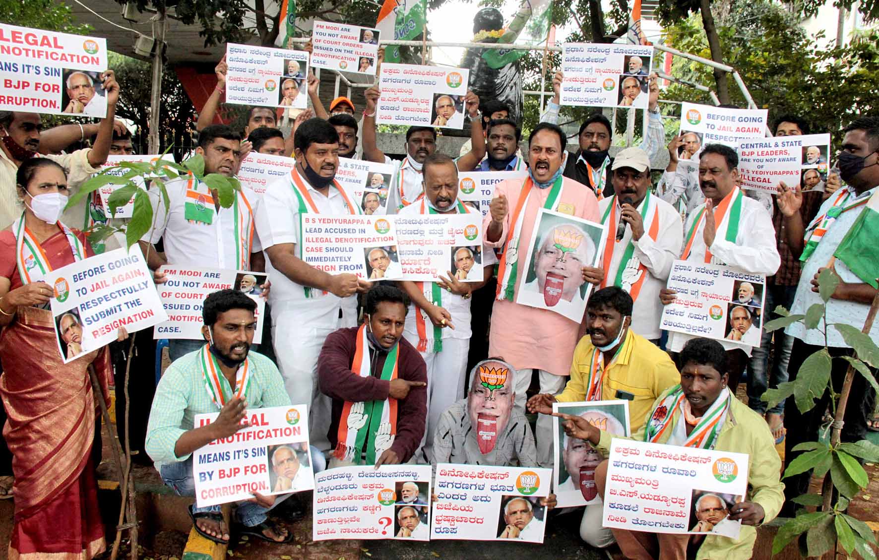ಗುರುವಾರ ಇಲ್ಲಿನ ಆನಂದ್ ರಾವ್ ವೃತ್ತದಲ್ಲಿನ ಗಾಂಧಿ ಪ್ರತಿಮೆ ಬಳಿ ಪ್ರತಿಭಟನೆ ನಡೆಸಿದ ಕಾರ್ಯಕರ್ತರು, ಮುಖ್ಯಮಂತ್ರಿ ಯಡಿಯೂರಪ್ಪ ಕೂಡಲೇ ರಾಜೀನಾಮೆ ನೀಡಬೇಕೆಂದು ಆಗ್ರಹಿಸಿದರು. ಈ ಹಿಂದೆ ಜೈಲಿಗೆ ಹೋಗಿ ಬಂದಿರುವ ಬಿಎಸ್ವೈ ಅವರಿಗೆ ಕೇಂದ್ರದ ಬಿಜೆಪಿ ನಾಯಕರು ಬೆಂಬಲಿಸುತ್ತಿರುವುದು ಸ್ಪಷ್ಟ ಎಂದು ಮುಖಂಡರು ಟೀಕಿಸಿದರು.