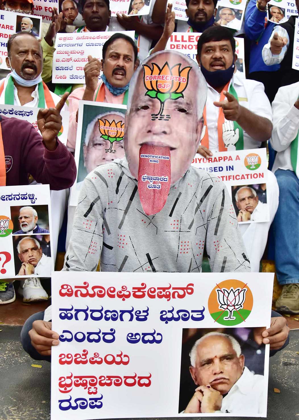 ಬೆಂಗಳೂರು, ಜ. 7: ಡಿನೋಟಿಫಿಕೇಷನ್ ಹಗರಣದ ತನಿಖೆಗೆ ನ್ಯಾಯಾಲಯ ಮುಖ್ಯಮಂತ್ರಿ ಬಿ.ಎಸ್.ಯಡಿಯೂರಪ್ಪ ವಿರುದ್ಧ ಆದೇಶಿಸಿದ್ದರೂ ಅವರು ಸಿಎಂ ಸ್ಥಾನಕ್ಕೆ ರಾಜೀನಾಮೆ ನೀಡದಿರುವುದನ್ನು ಖಂಡಿಸಿ ಕಾಂಗ್ರೆಸ್ ಪ್ರಚಾರ ಸಮಿತಿ ಕಾರ್ಯಕರ್ತರು ಪ್ರತಿಭಟನೆ ನಡೆಸಿ ಆಕ್ರೋಶ ವ್ಯಕ್ತಪಡಿಸಿದ್ದಾರೆ.