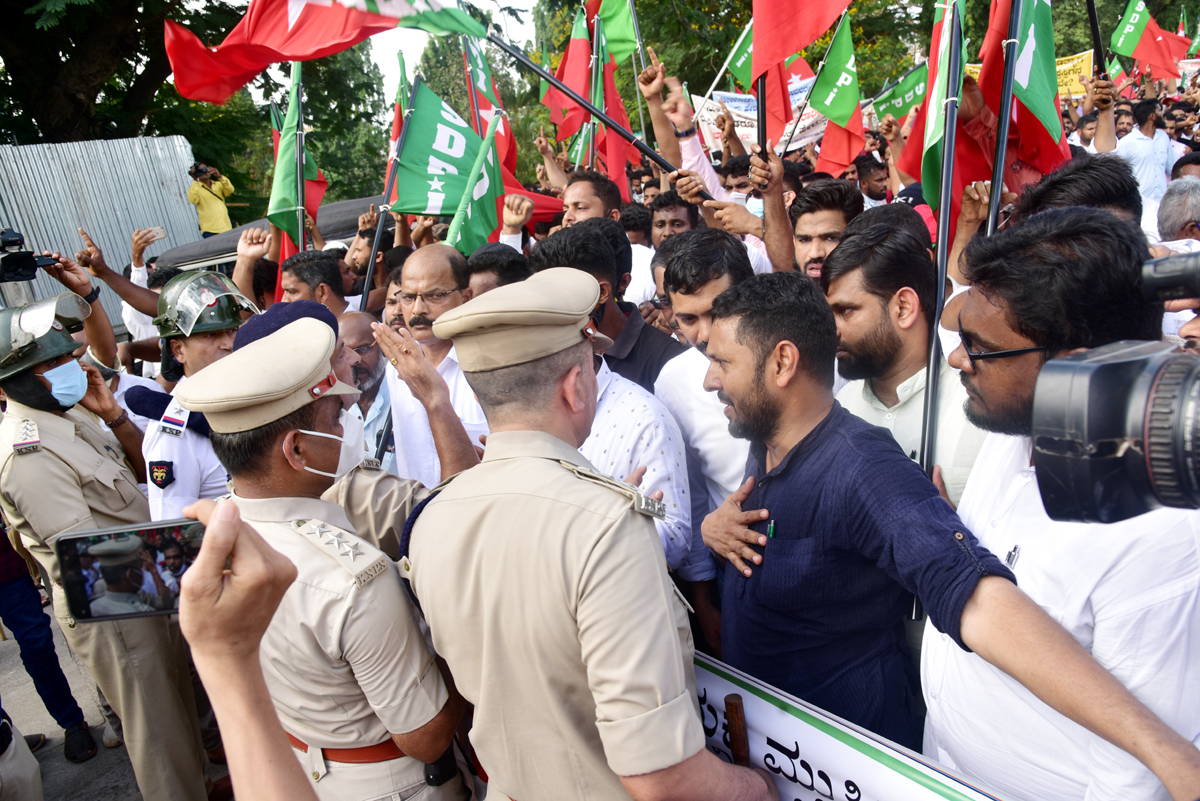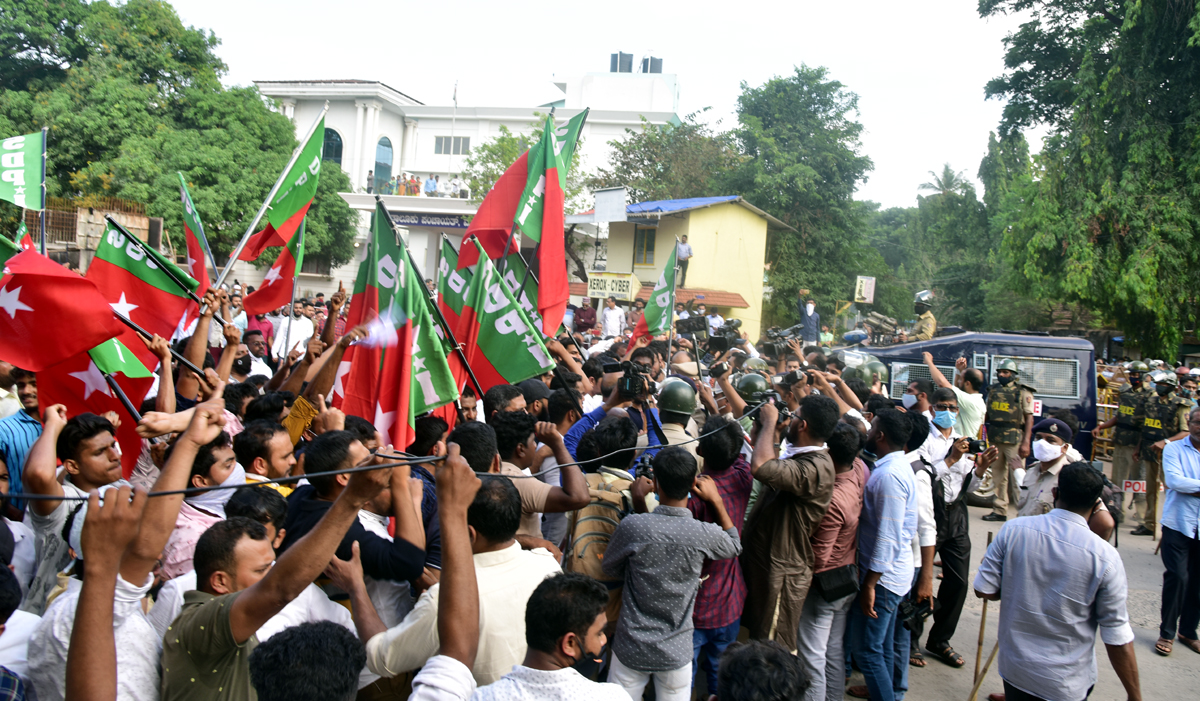 ಕ್ಲಾಕ್ ಟವರ್ ಬಳಿಯೇ ಜಮಾವಣೆಗೊಂಡಿದ್ದ ಕಾರ್ಯಕರ್ತರು ಸುಮಾರು ಒಂದು ಗಂಟೆಯವರೆಗೆ ಪ್ರತಿಭಟನೆ ನಡೆಸಿದರು. ಬಳಿಕ 3:30ರ ಸುಮಾರಿಗೆ ಎಸ್ಪಿ ಕಚೇರಿಯತ್ತ ಹೆಜ್ಜೆ ಹಾಕತೊಡಗಿದರು. ಅತ್ತ ಪೊಲೀಸರು ಕೂಡ ಹೆಚ್ಚಿನ ಸಂಖ್ಯೆಯಲ್ಲಿ ಸನ್ನದ್ಧರಾಗಿದ್ದರು. ಕ್ಲಾಕ್ ಟವರ್ನಿಂದ 100 ಮೀಟರ್ ದೂರದಲ್ಲಿ ಟೌನ್ಹಾಲ್ ಬಳಿ ರಸ್ತೆಗೆ ಅಡ್ಡಲಾಗಿ ಪೊಲೀಸರು ಬ್ಯಾರಿಕೇಡ್ ಅವಳವಡಿಸಿ, ಪ್ರತಿಭಟನಾಕಾರರ ಜಾಥಾ ತಡೆಹಿಡಿದರು.