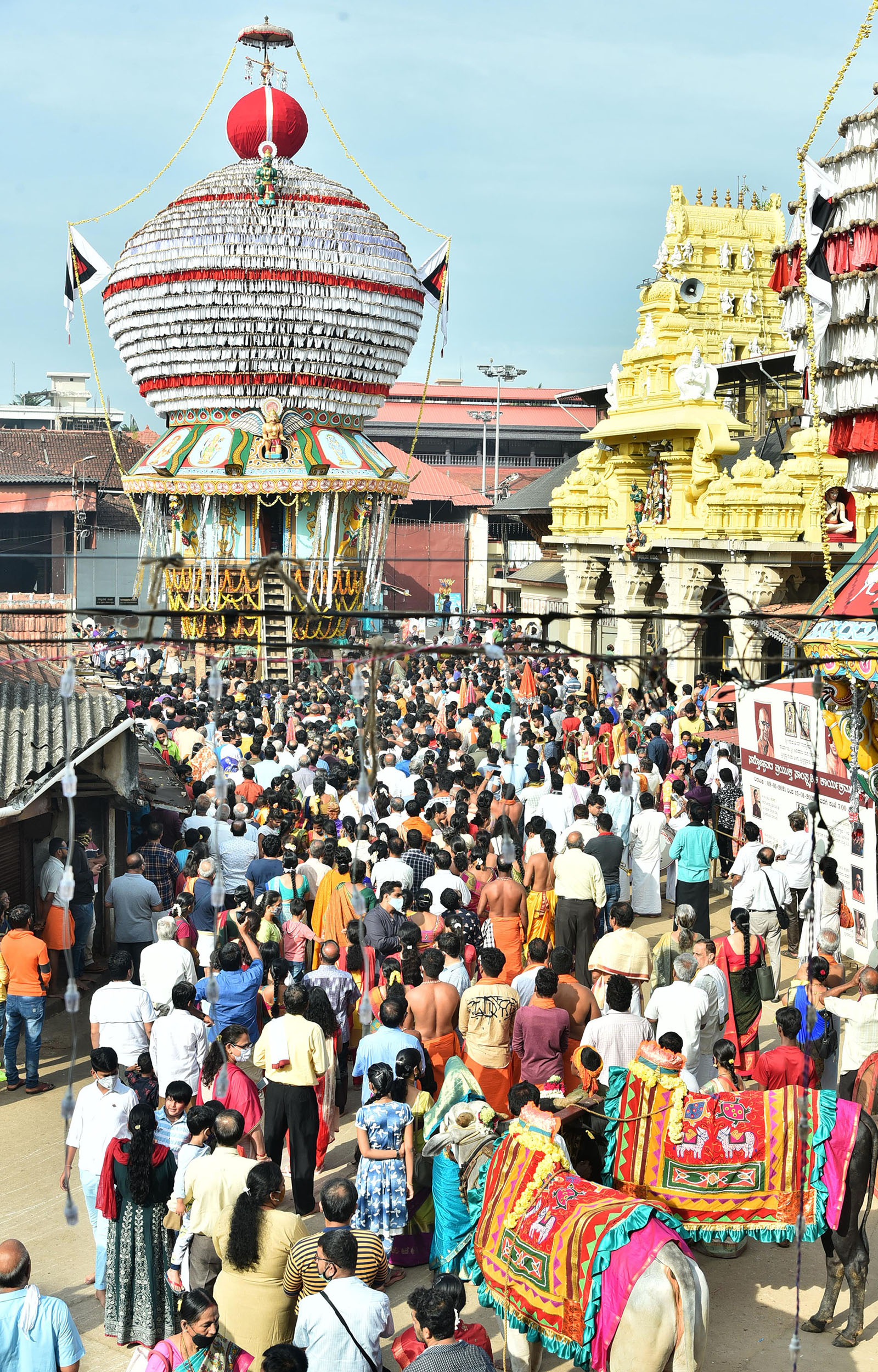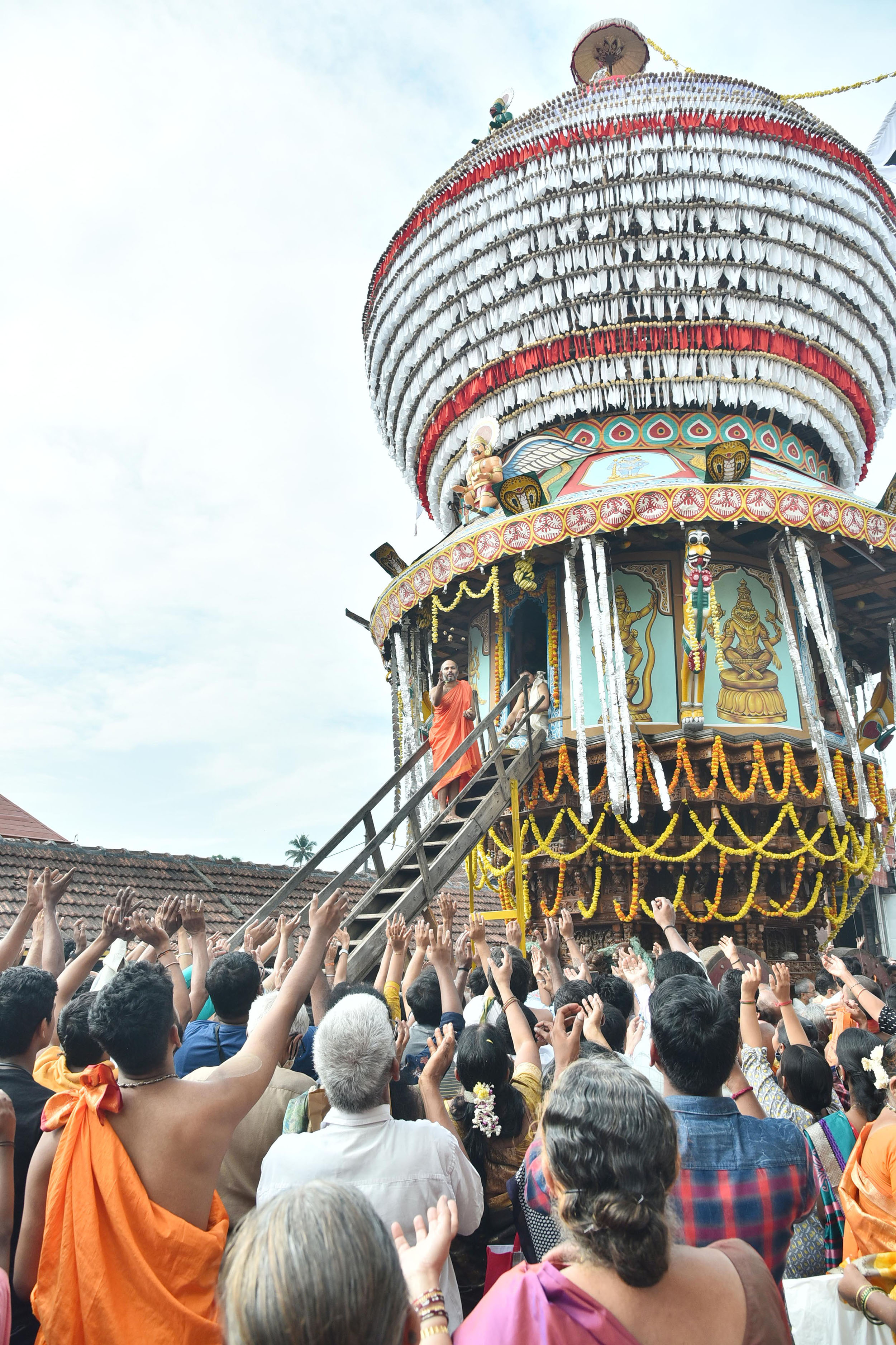ಮಹಾಪೂಜೆಯ ಬಳಿಕ ಶ್ರೀಕೃಷ್ಣ-ಮುಖ್ಯಪ್ರಾಣ ದೇವರ ಬಲಿಮೂರ್ತಿ ಯನ್ನು ಚಿನ್ನದ ಪಾಲಕ್ಕಿಯಲ್ಲಿ ತಂದು ಸ್ವಾಗತ ಗೋಪುರದ ಎದುರು ನಿಲ್ಲಿಸಲಾದ ಬ್ರಹ್ಮರಥದಲ್ಲಿ ಪ್ರತಿಷ್ಠಾಪಿಸಲಾಯಿತು. ಎಲ್ಲಾ ಸ್ವಾಮೀಜಿಗಳು ರಥವನ್ನೇರಿ ಮಂಗಳಾರತಿ ಬೆಳಗಿದ ಬಳಿಕ ರಥವನ್ನು ರಥಬೀದಿಗೆ ಒಂದು ಸುತ್ತು ಪ್ರದಕ್ಷಿಣೆ ತರಲಾಯಿತು. ಭಕ್ತರೊಂದಿಗೆ ಮಠಾಧೀಶರು ಬ್ರಹ್ಮರಥವನ್ನು ಎಳೆದರು.